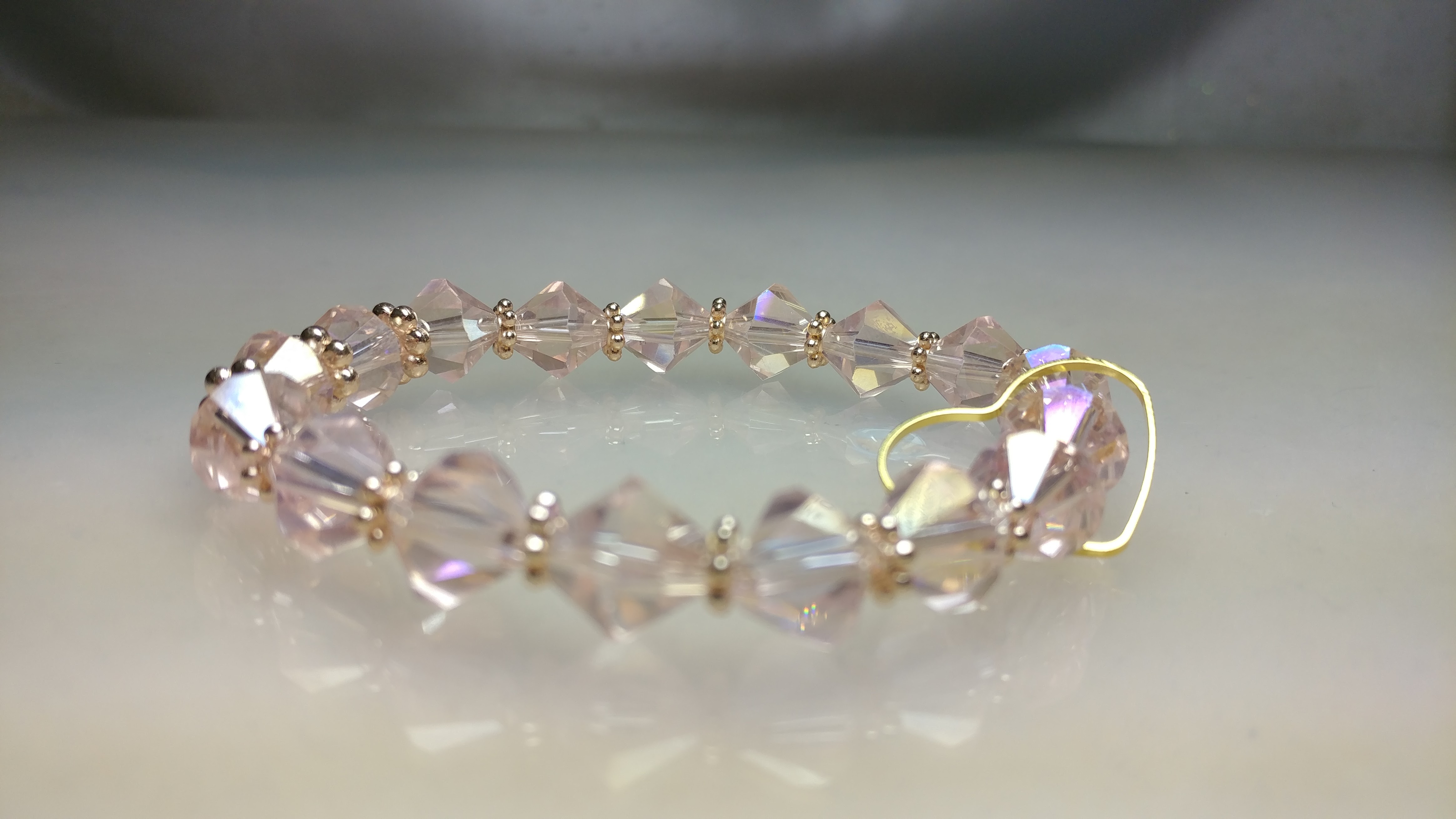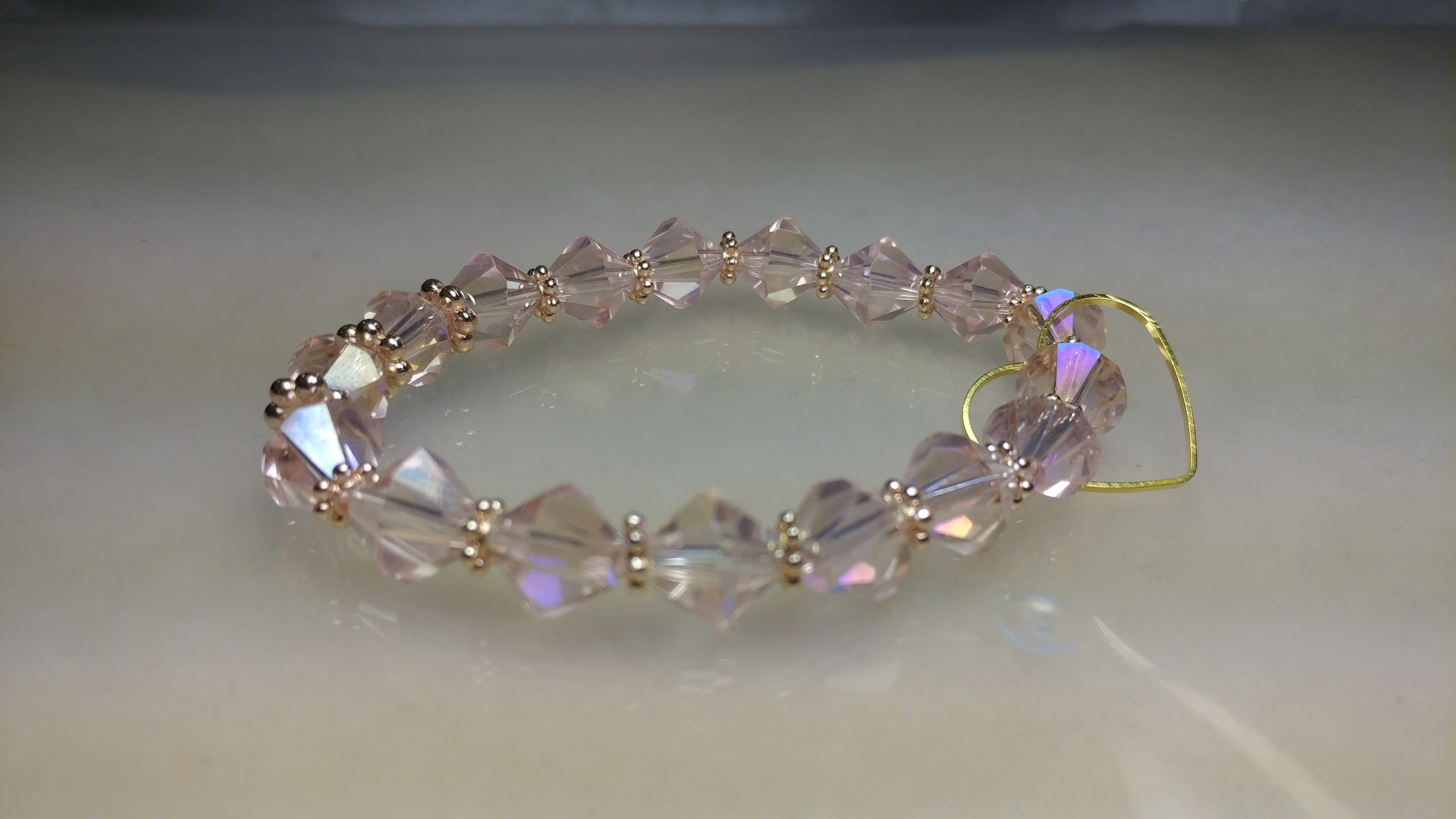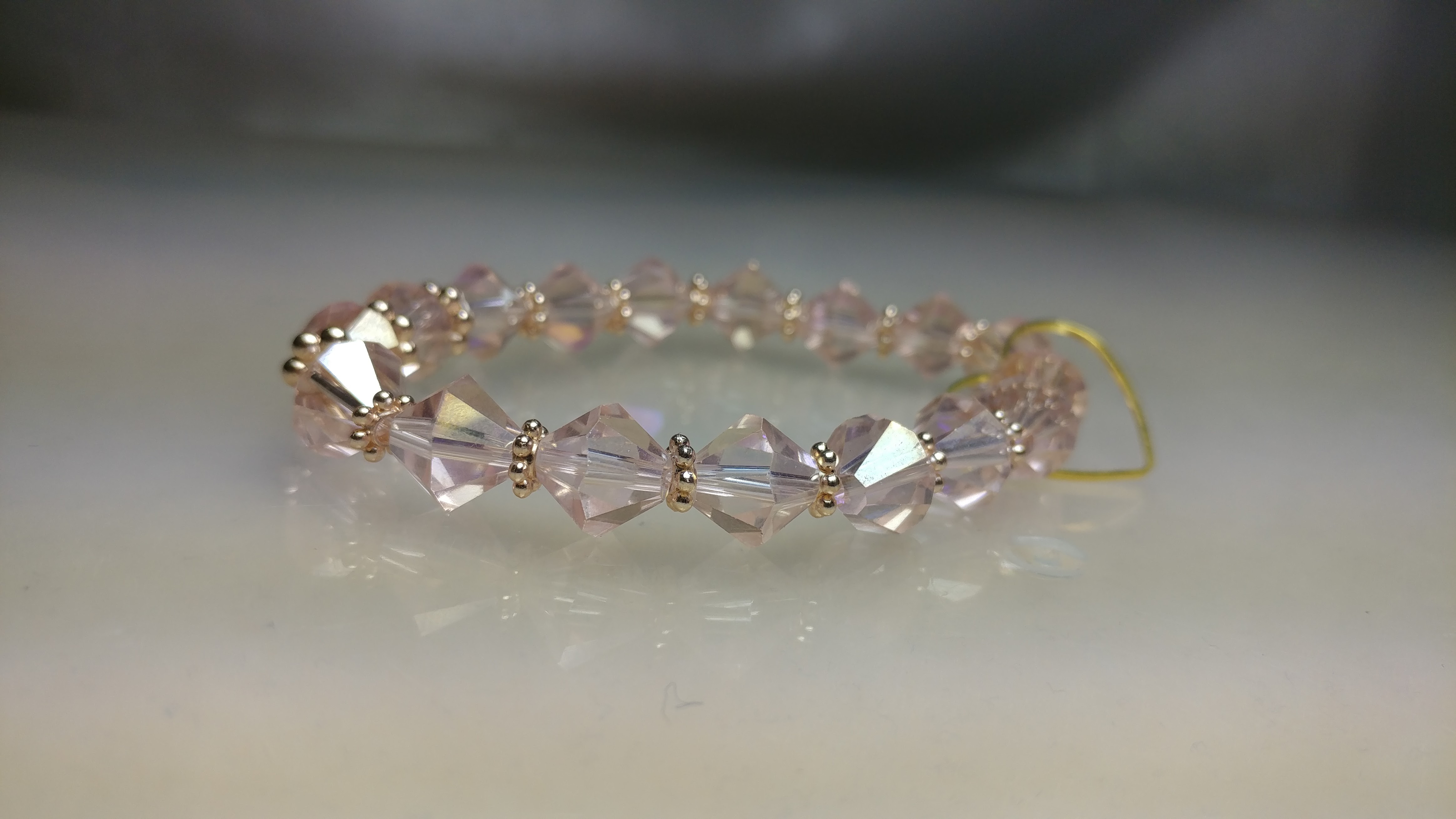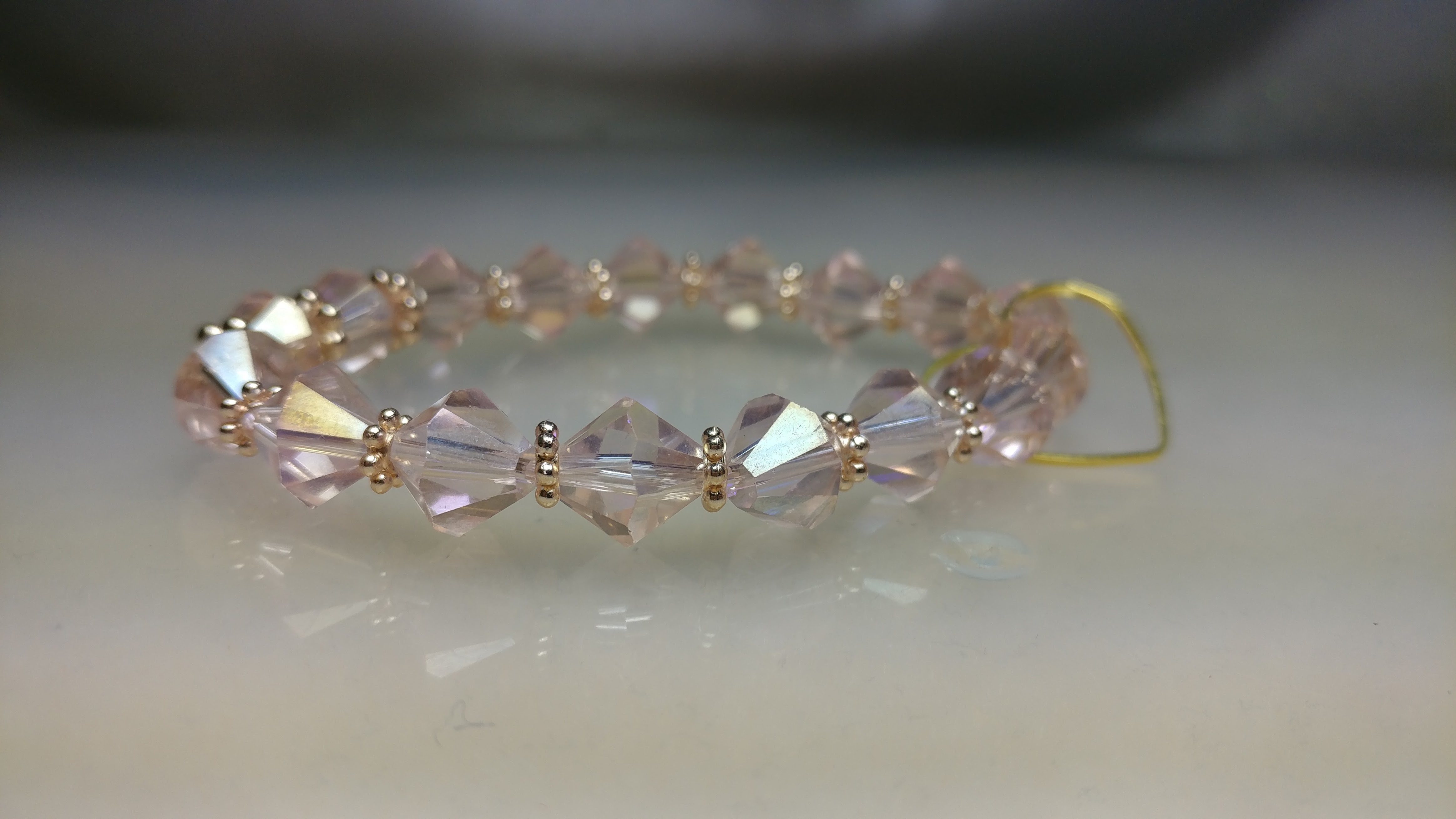 Handmade with pink glass beads accented with gold spacers on a clear stretchy cord.