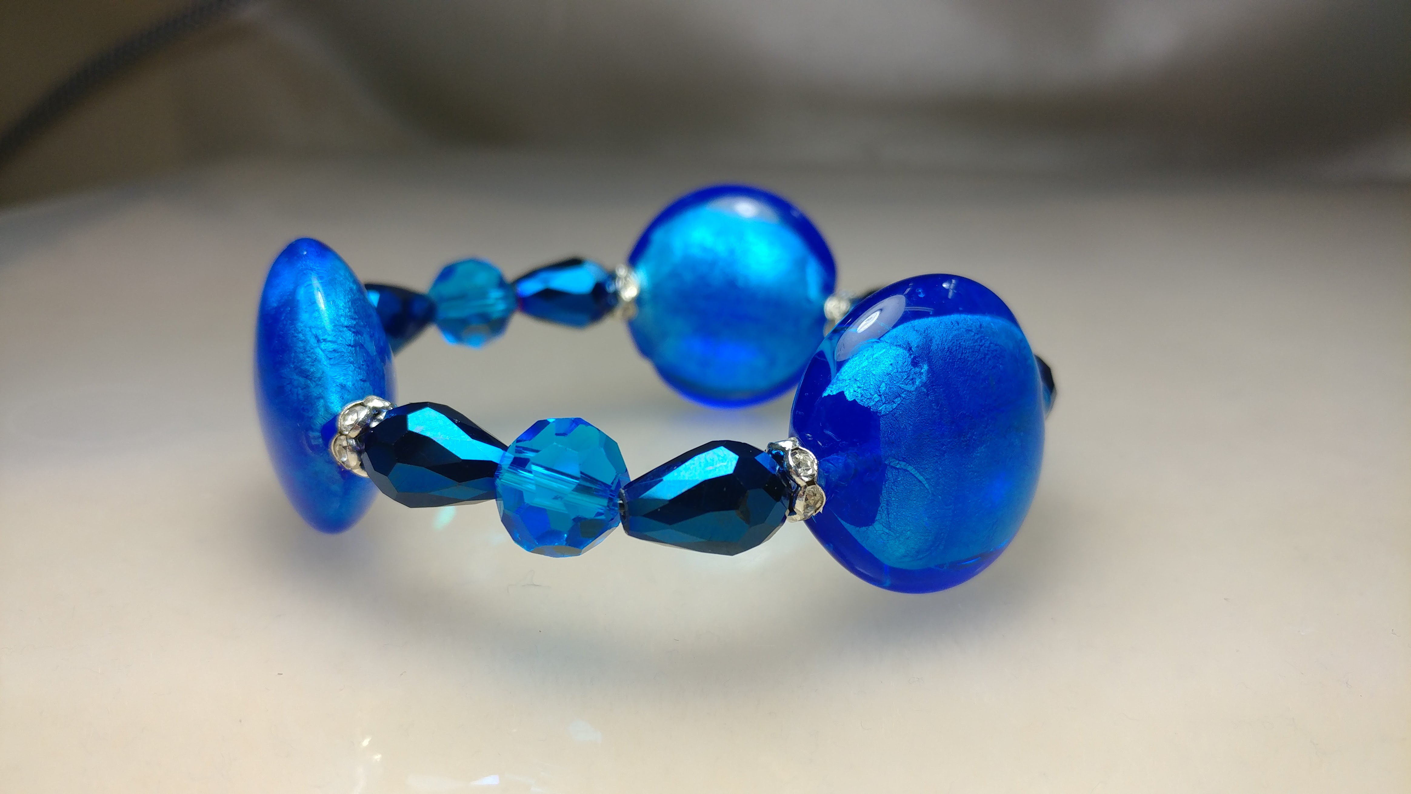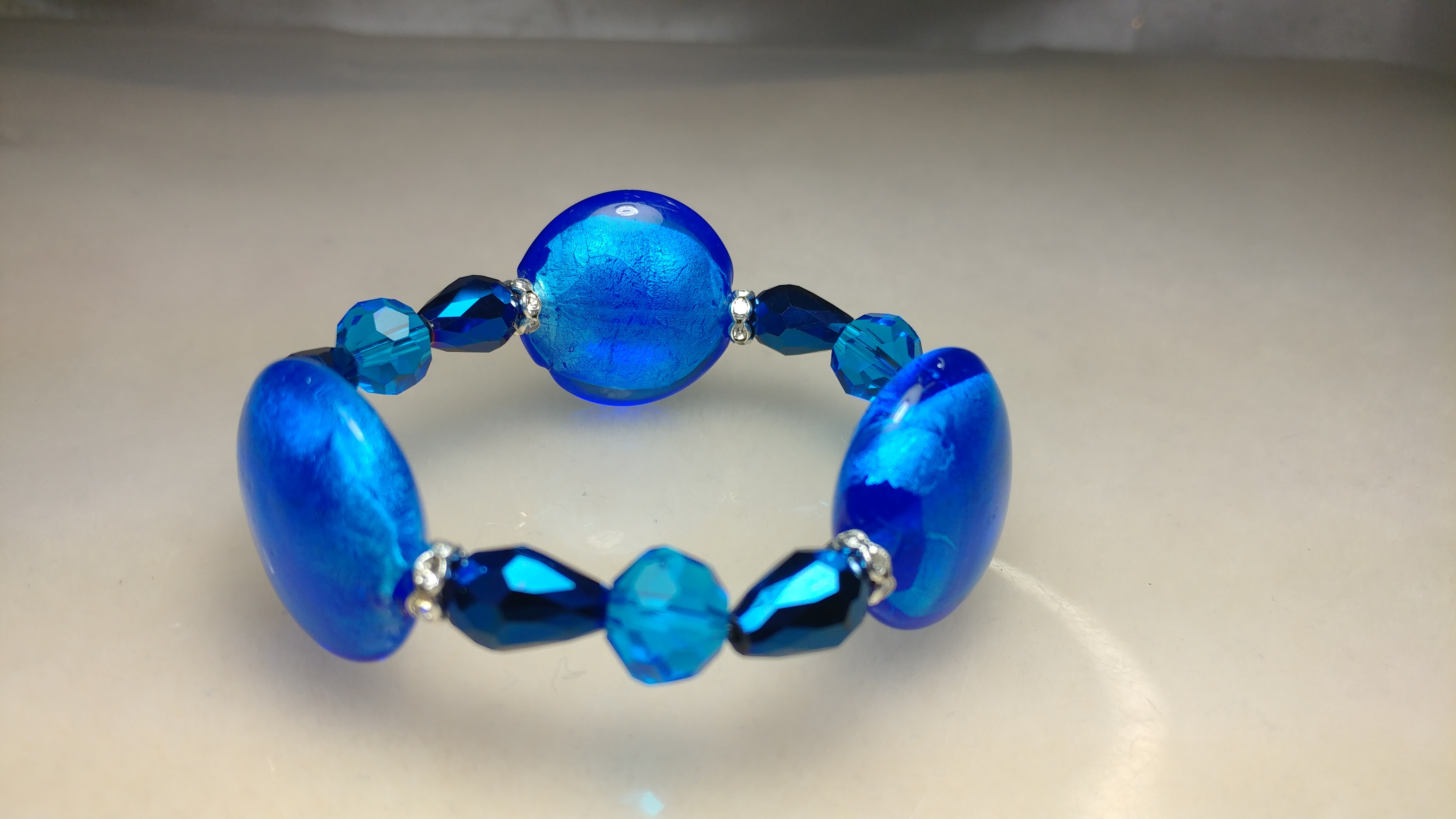 Handmade with beautiful blue colored glass beads, and silver clear rhinestone beads on a clear stretchy cord.
