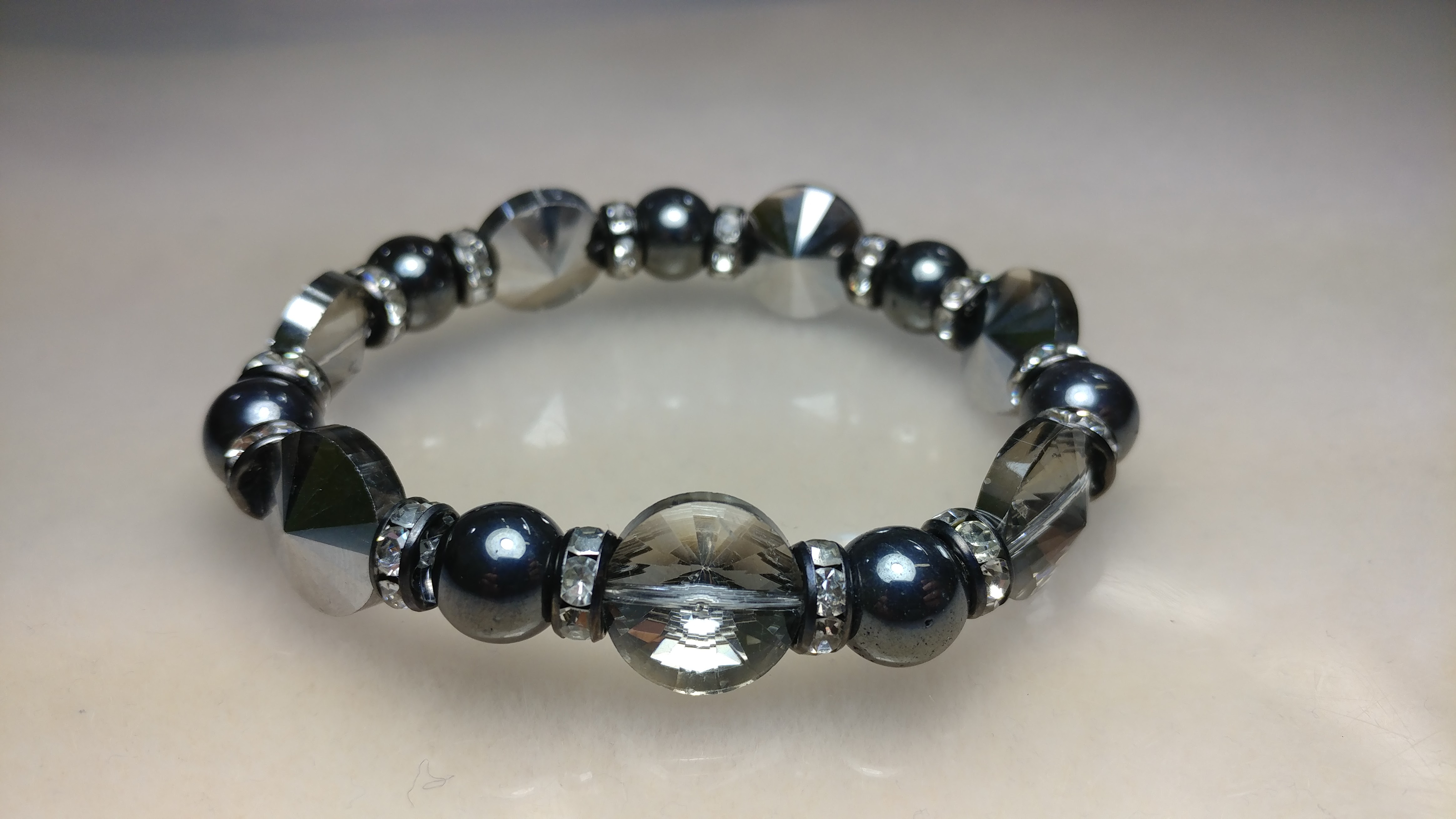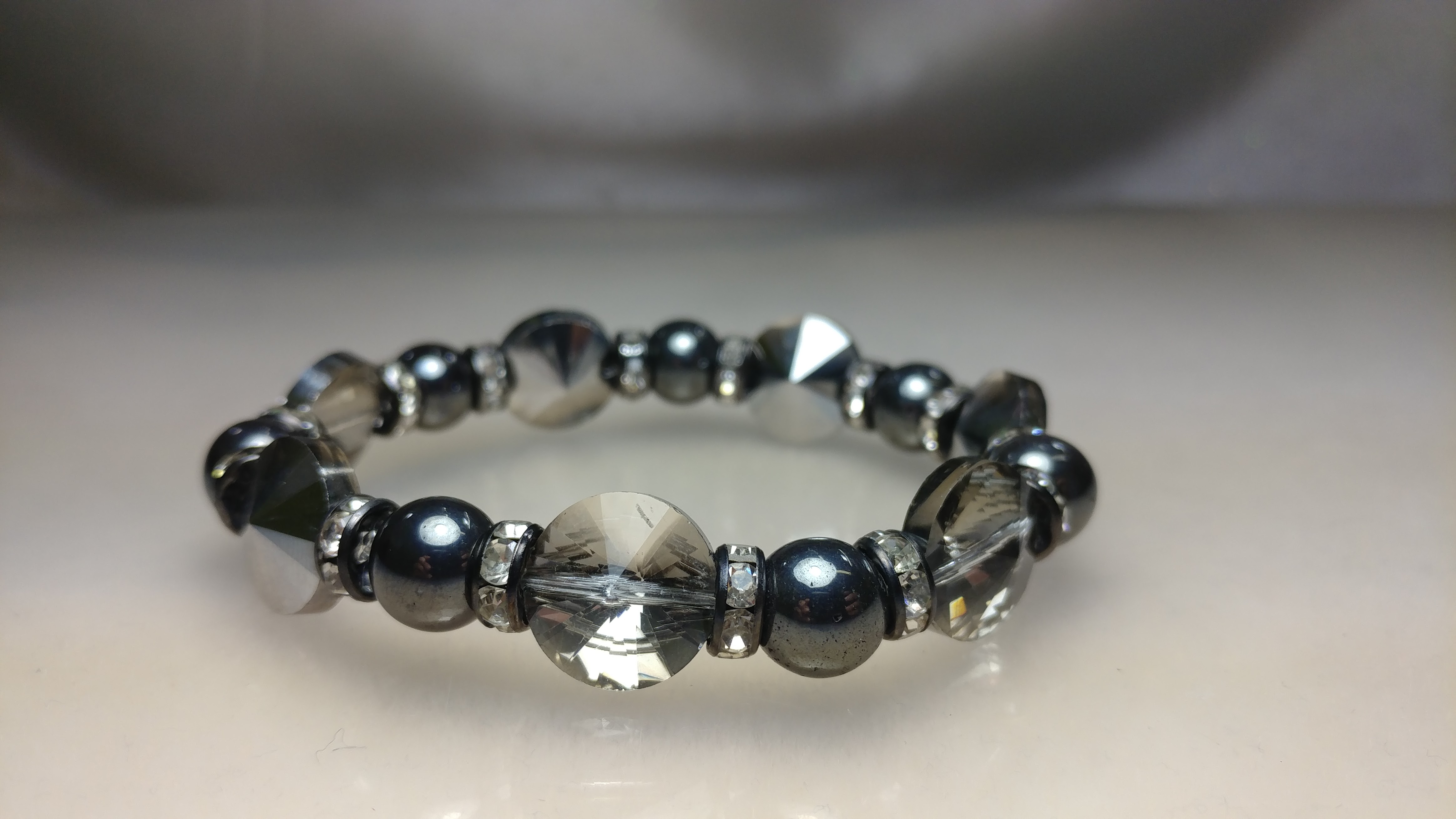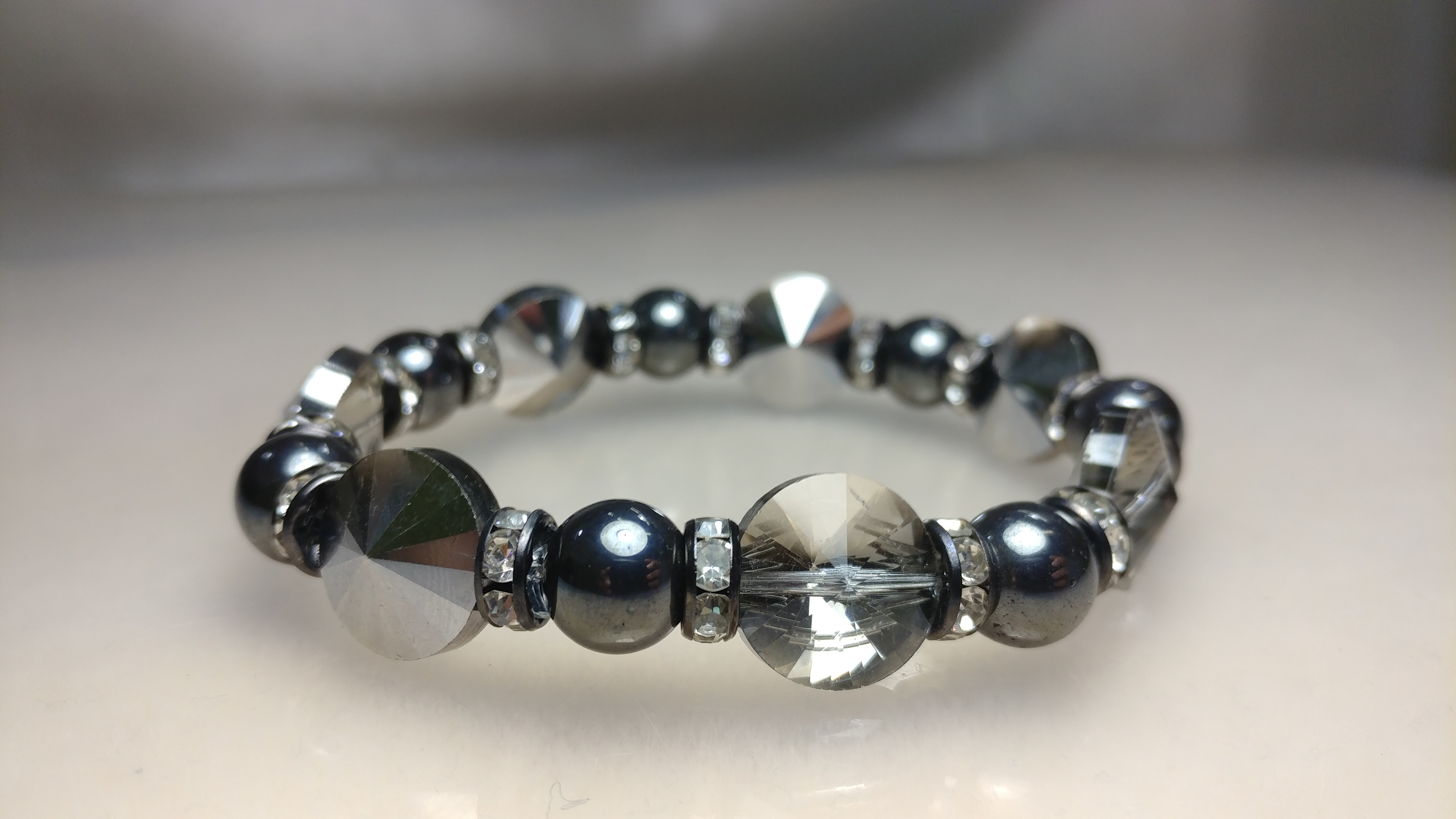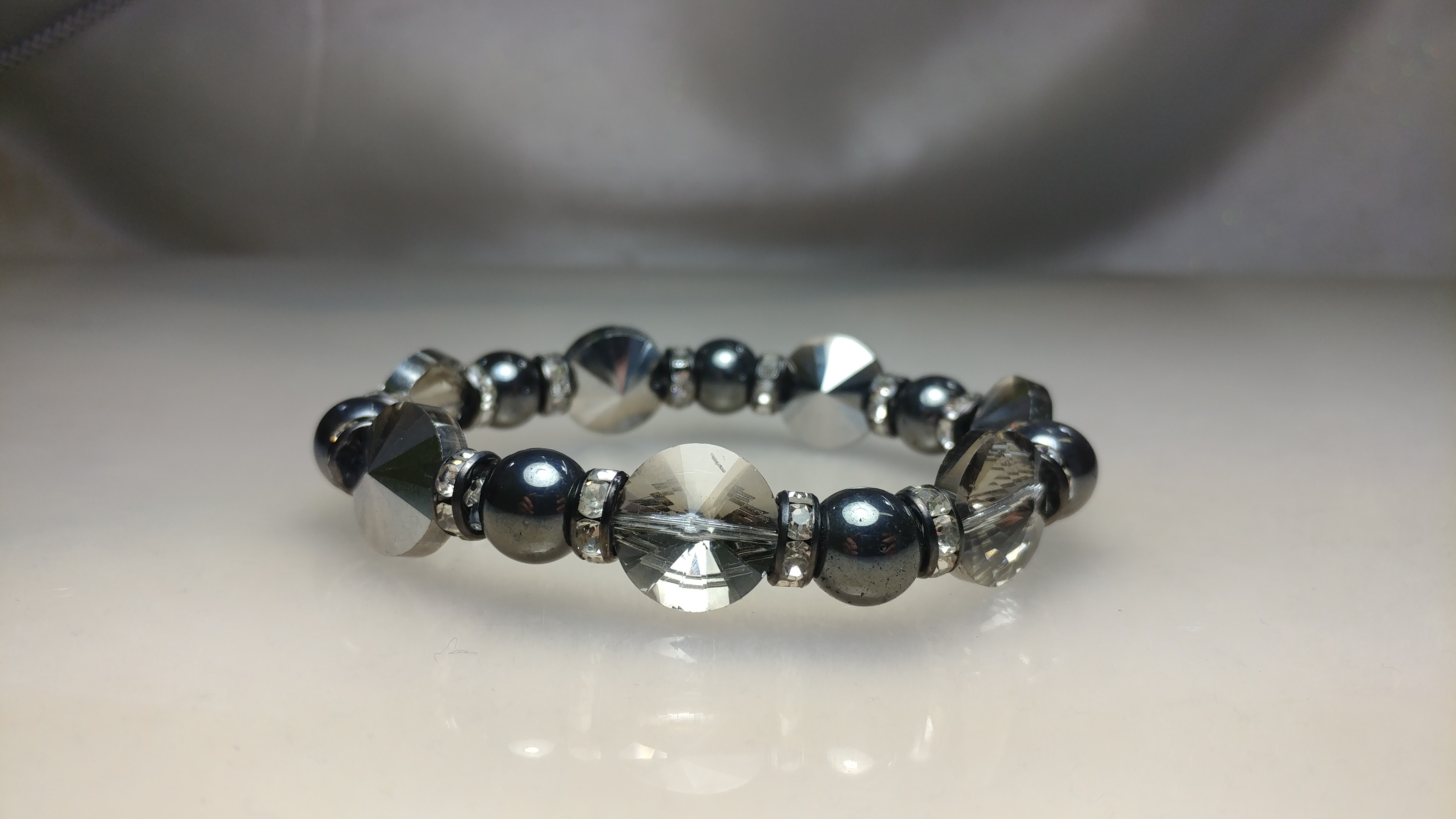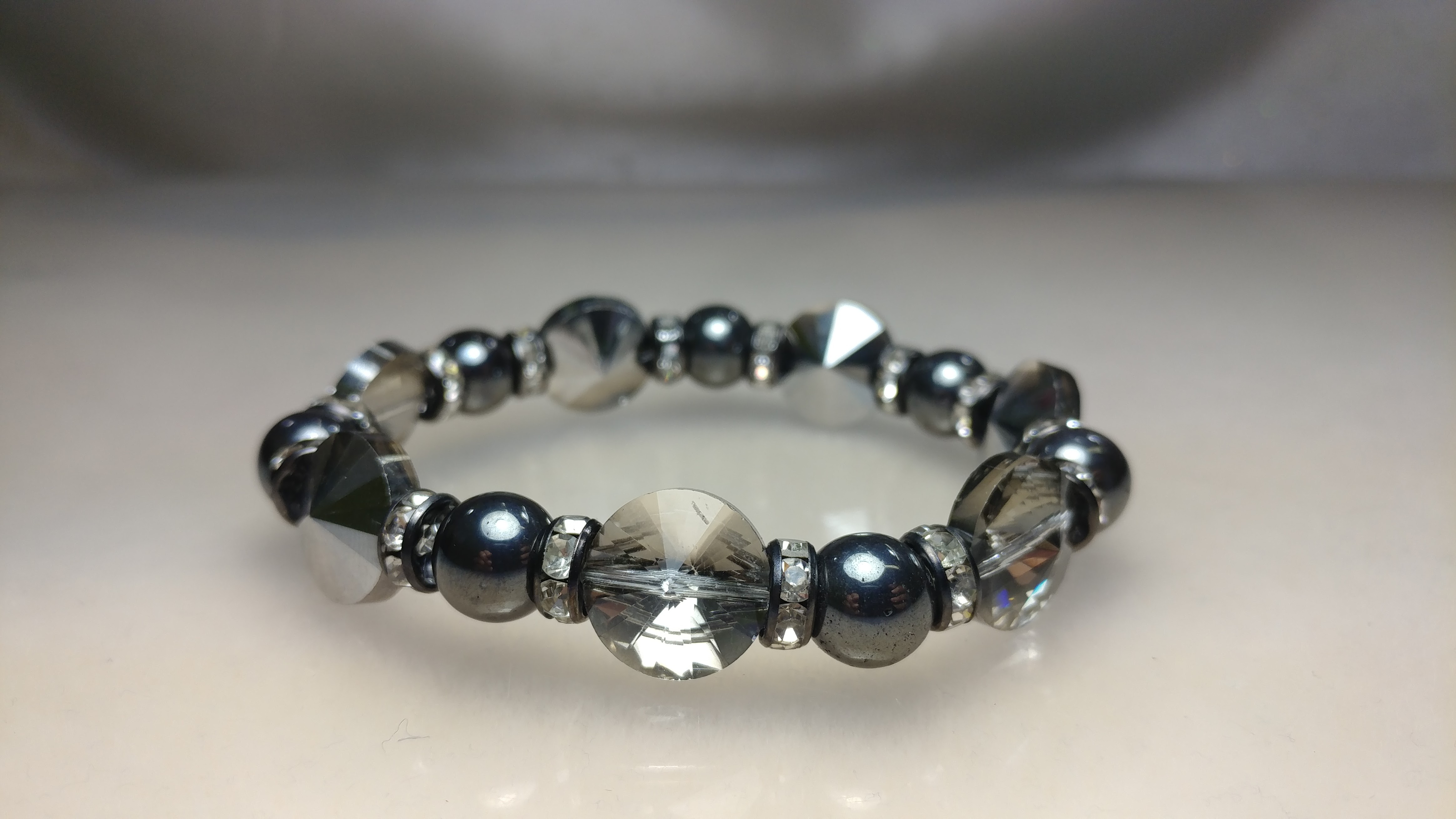 Handmade with transparent gray beads, and hematite beads space with small gunmetal rhinestone spacer on a clear stretchy cord.