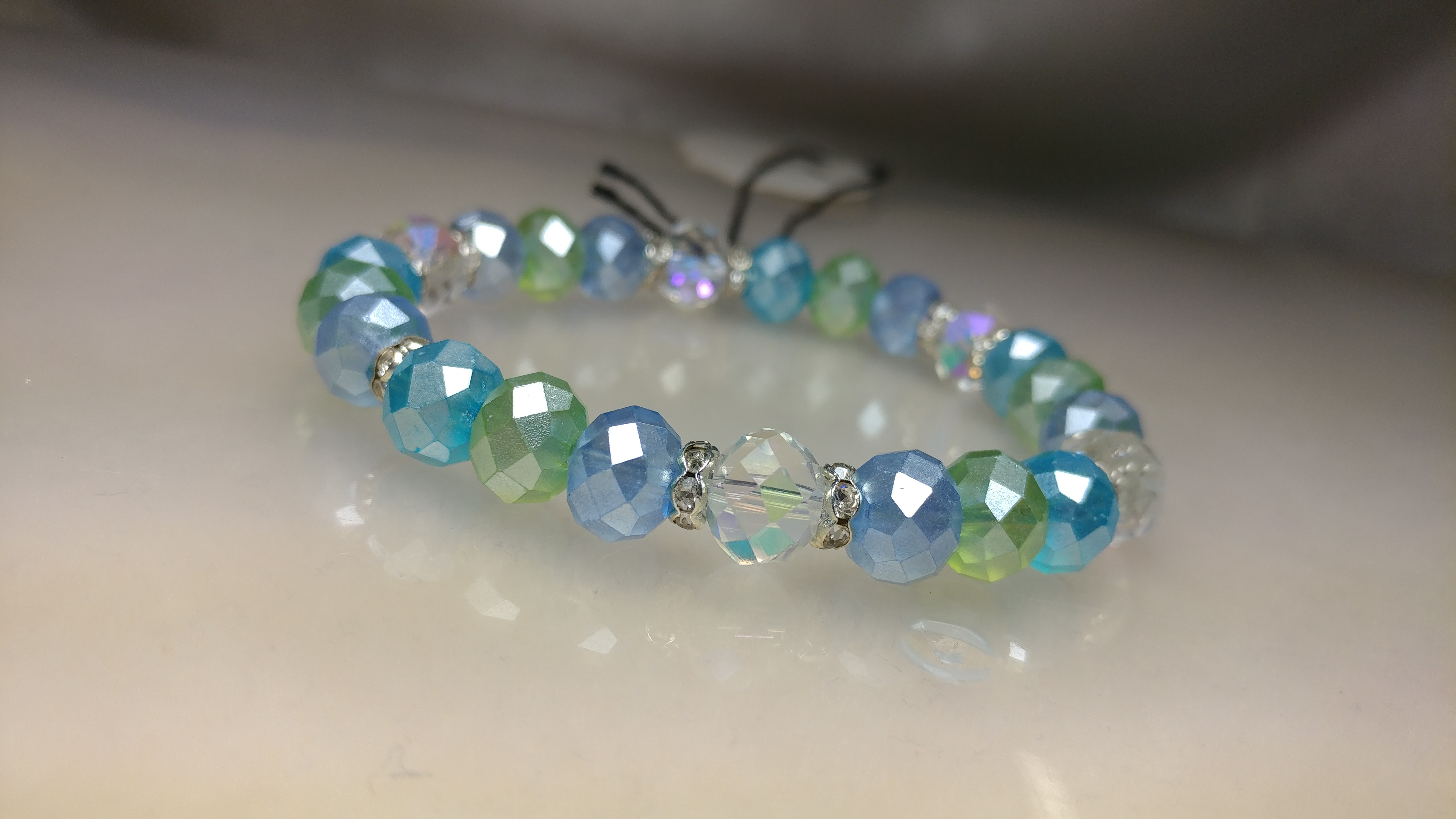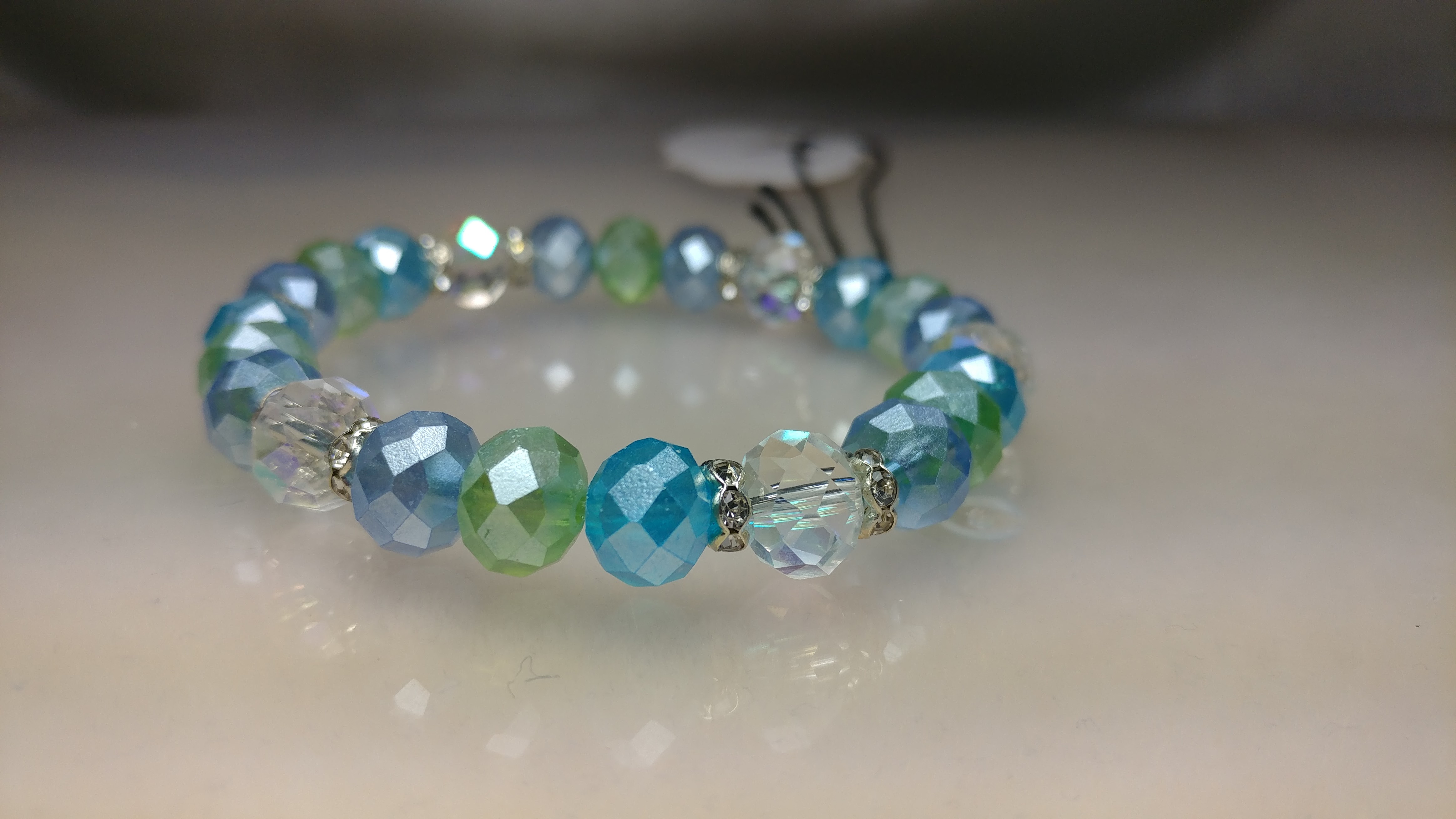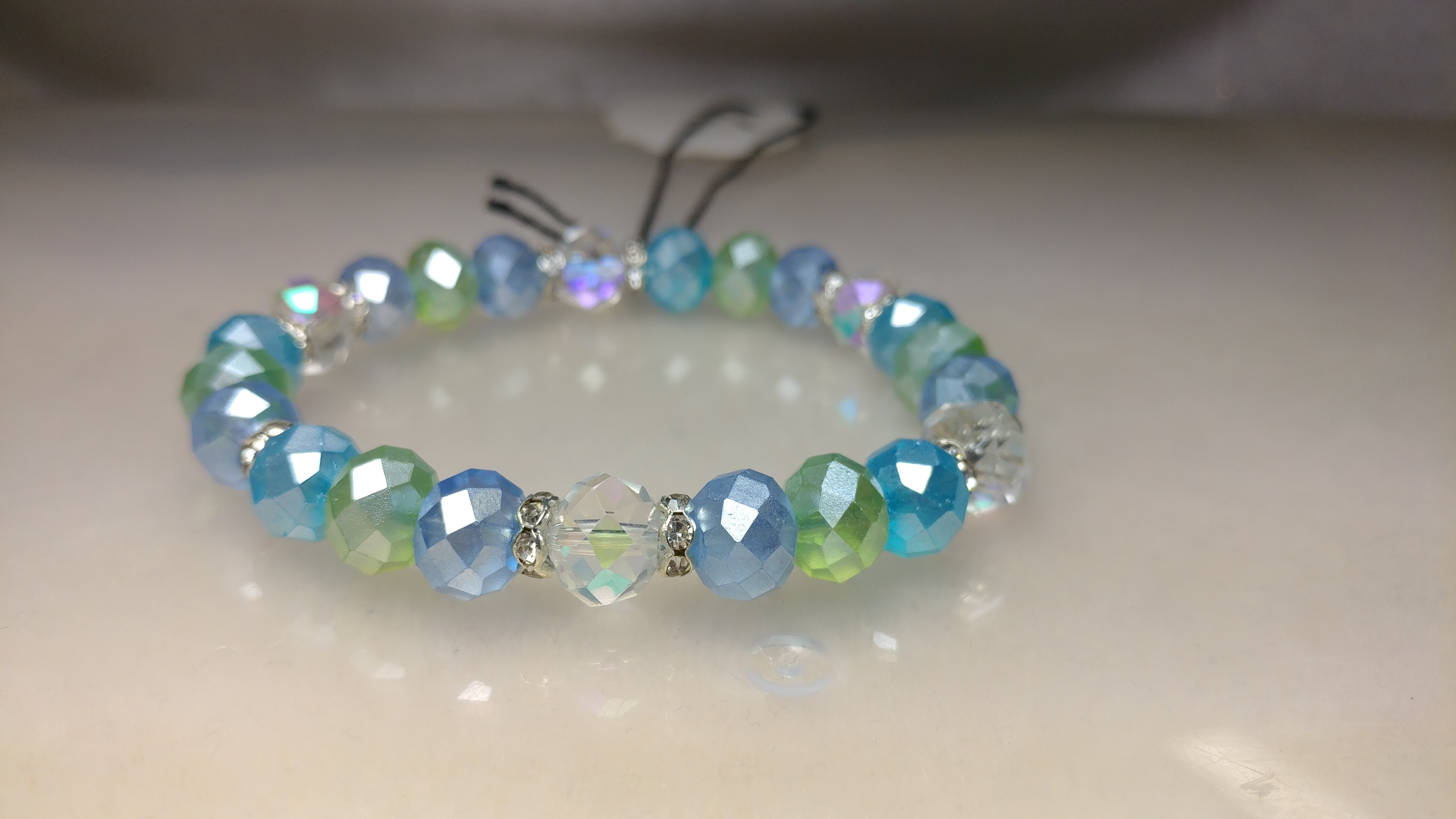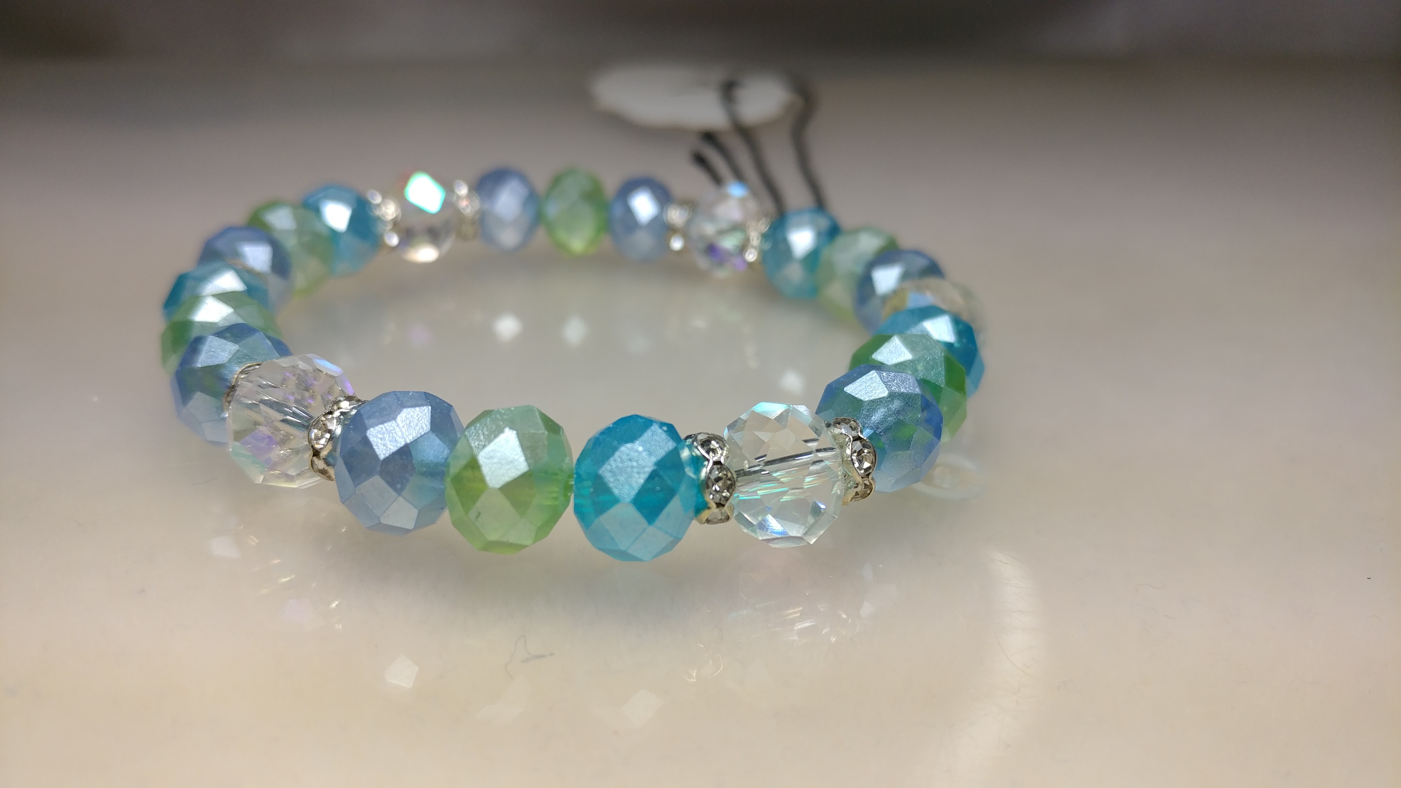 Handmade with multi-colored glass beads spaced with clear glass bead and clear silver rhinestone spacers on a clear stretchy cord.