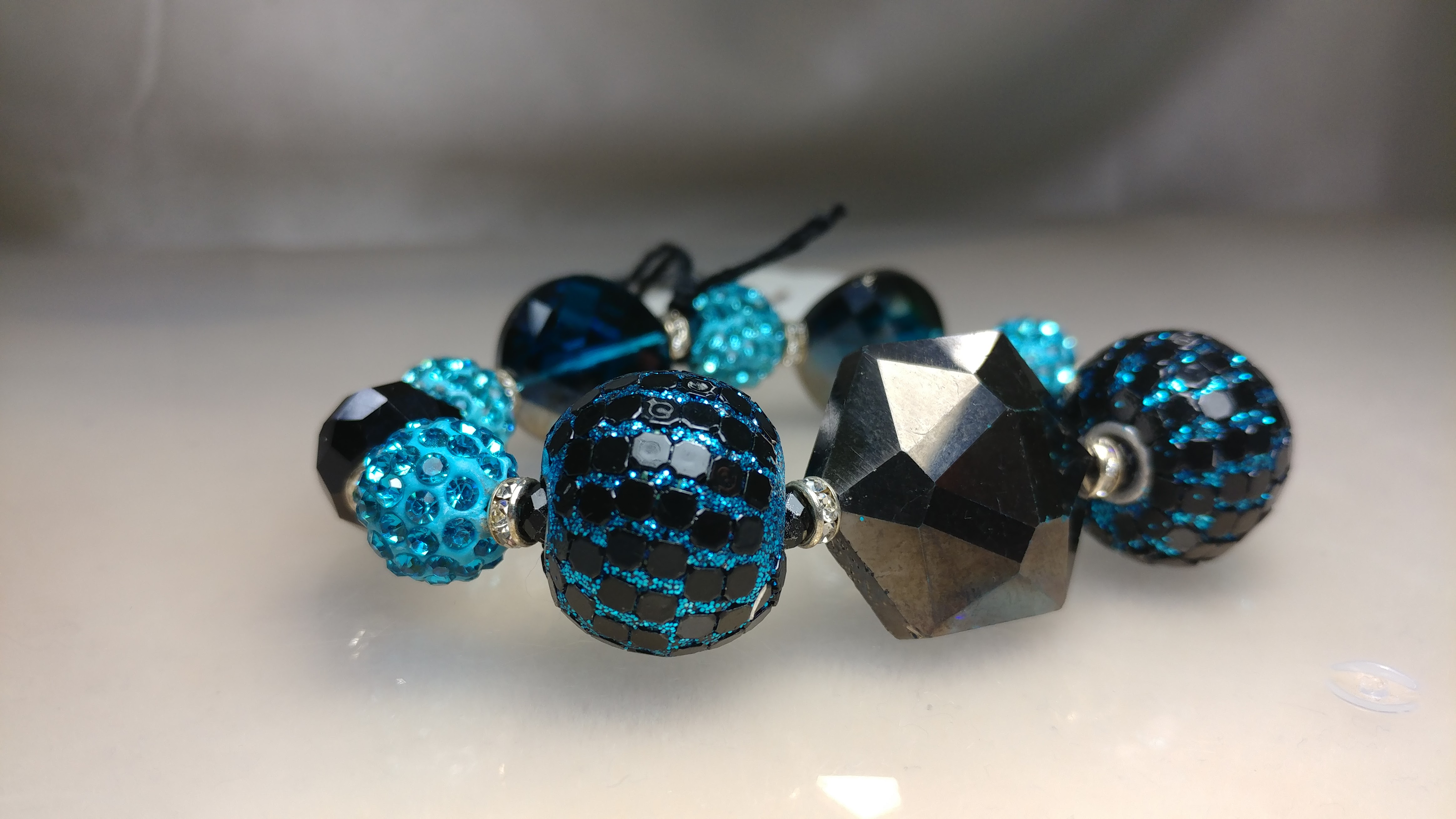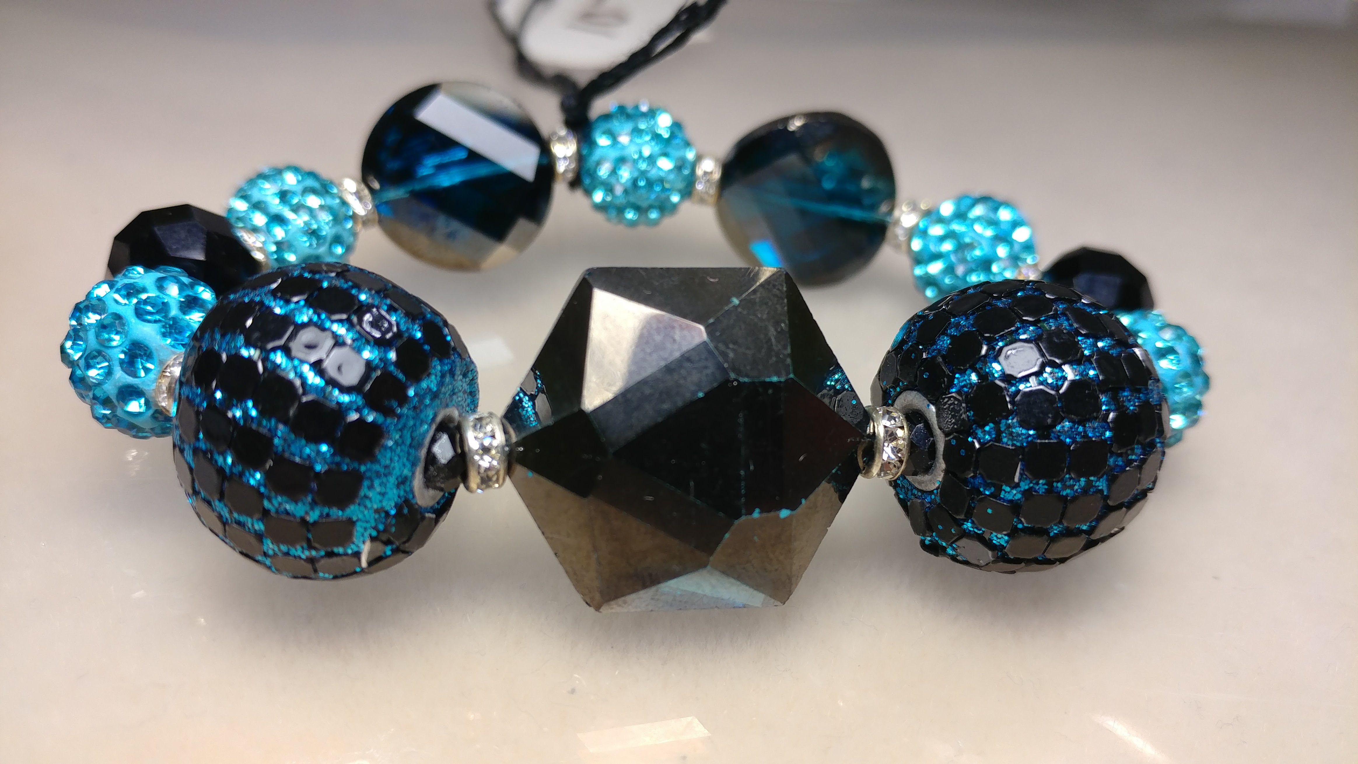 Handmade with large fancy beads spaced with rhinestone pave beads and clear silver spacers on a clear stretchy cord.