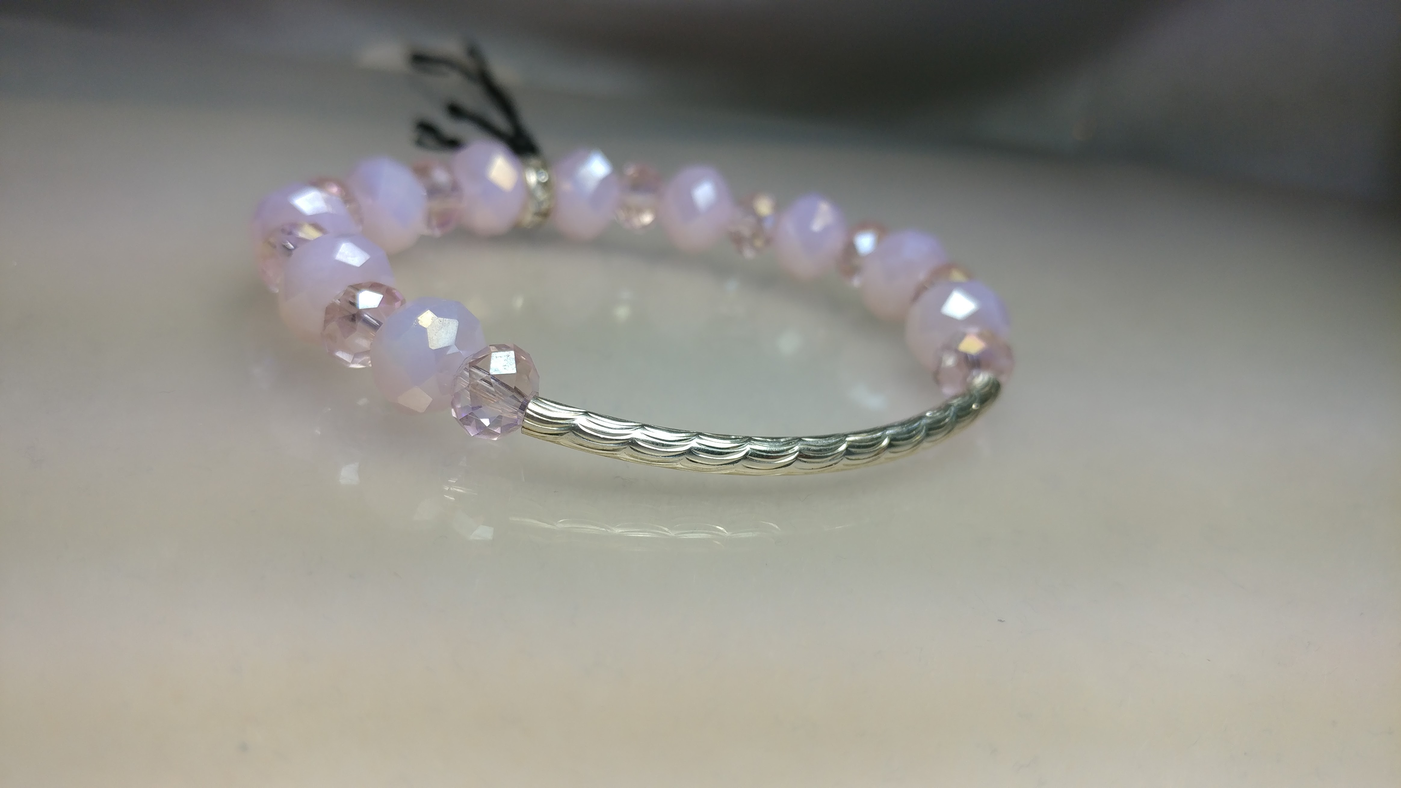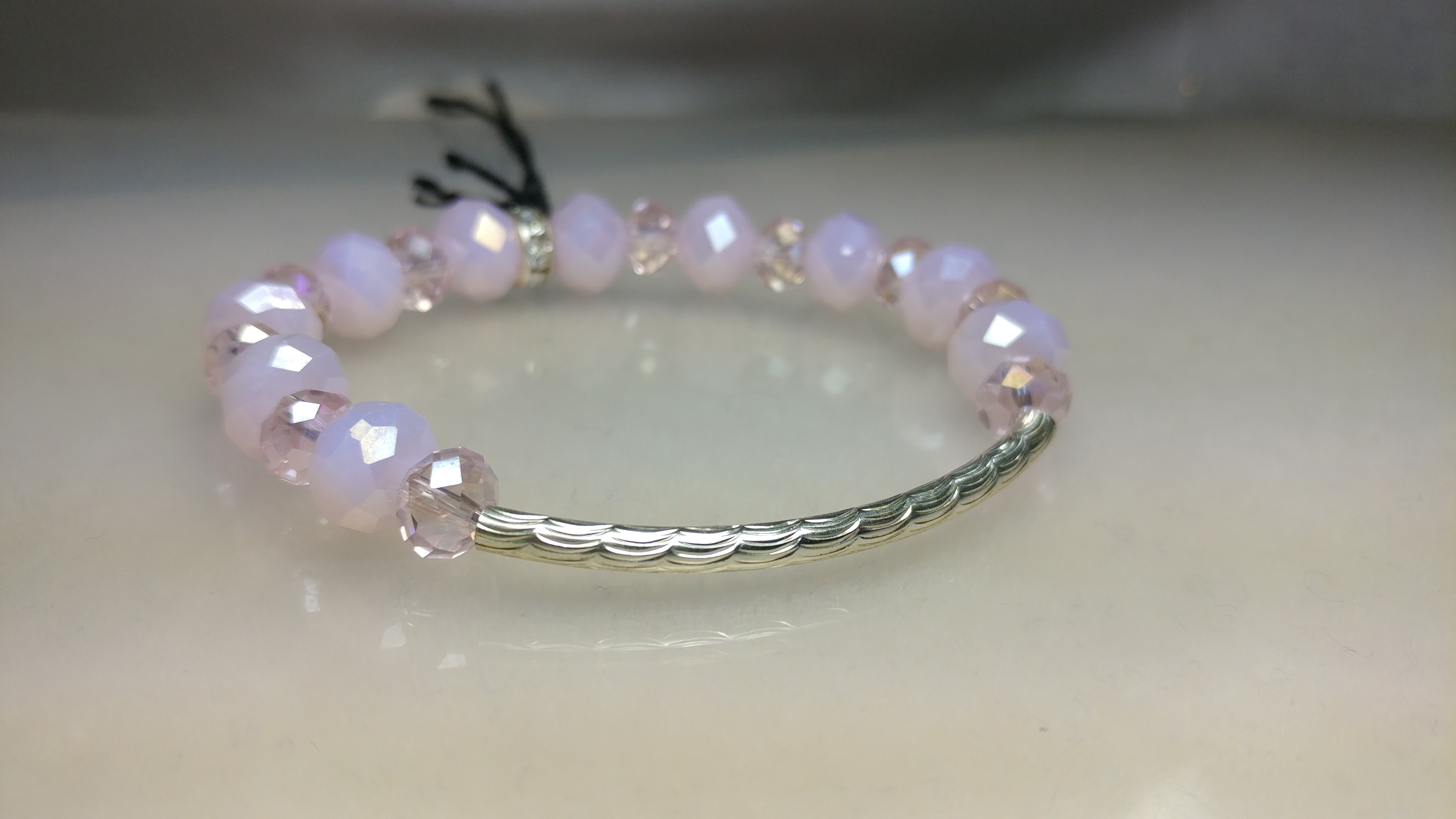 Handmade, with a silver bar connector, pink glass crystal beads, on a clear stretchy cord.