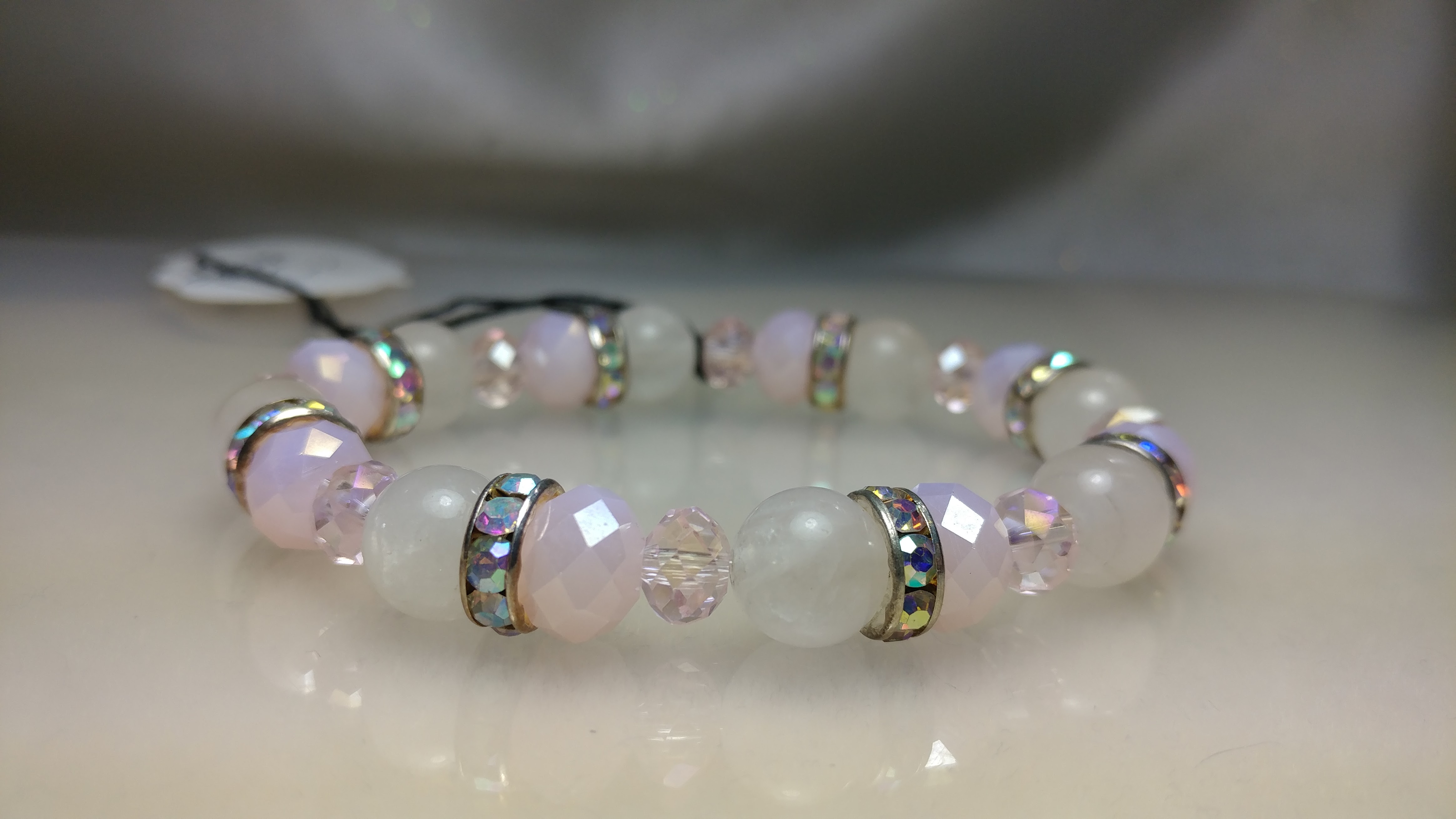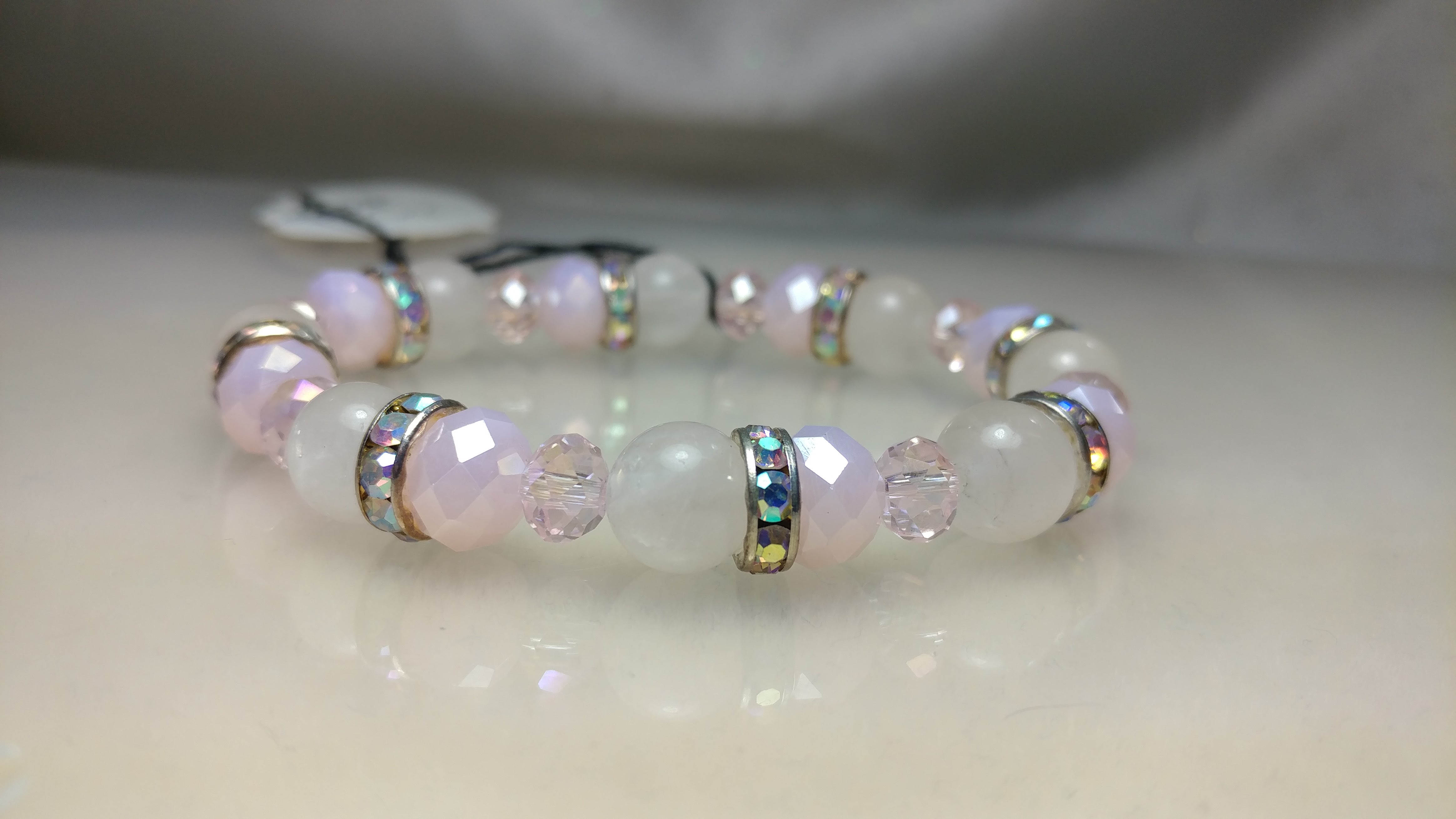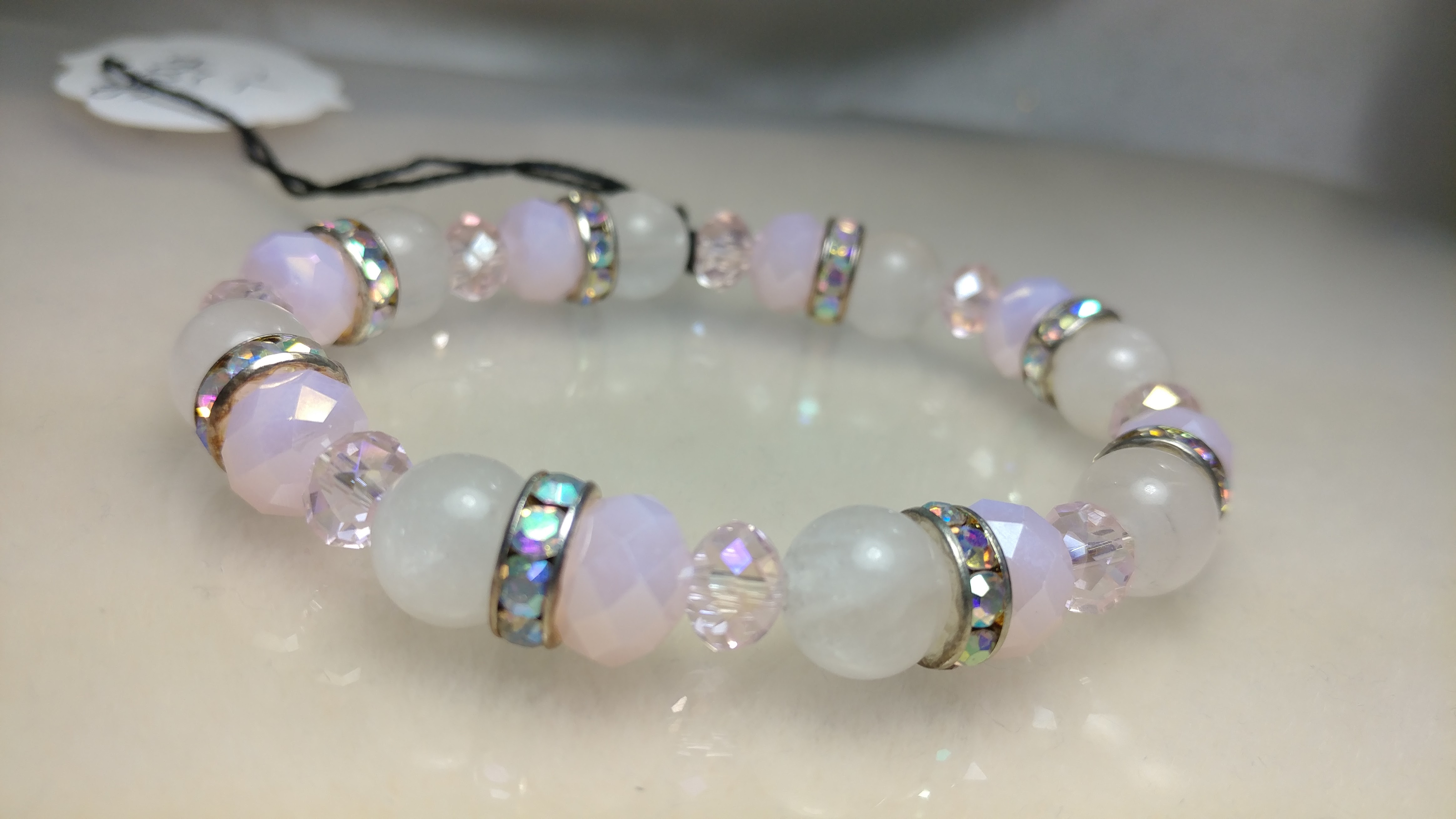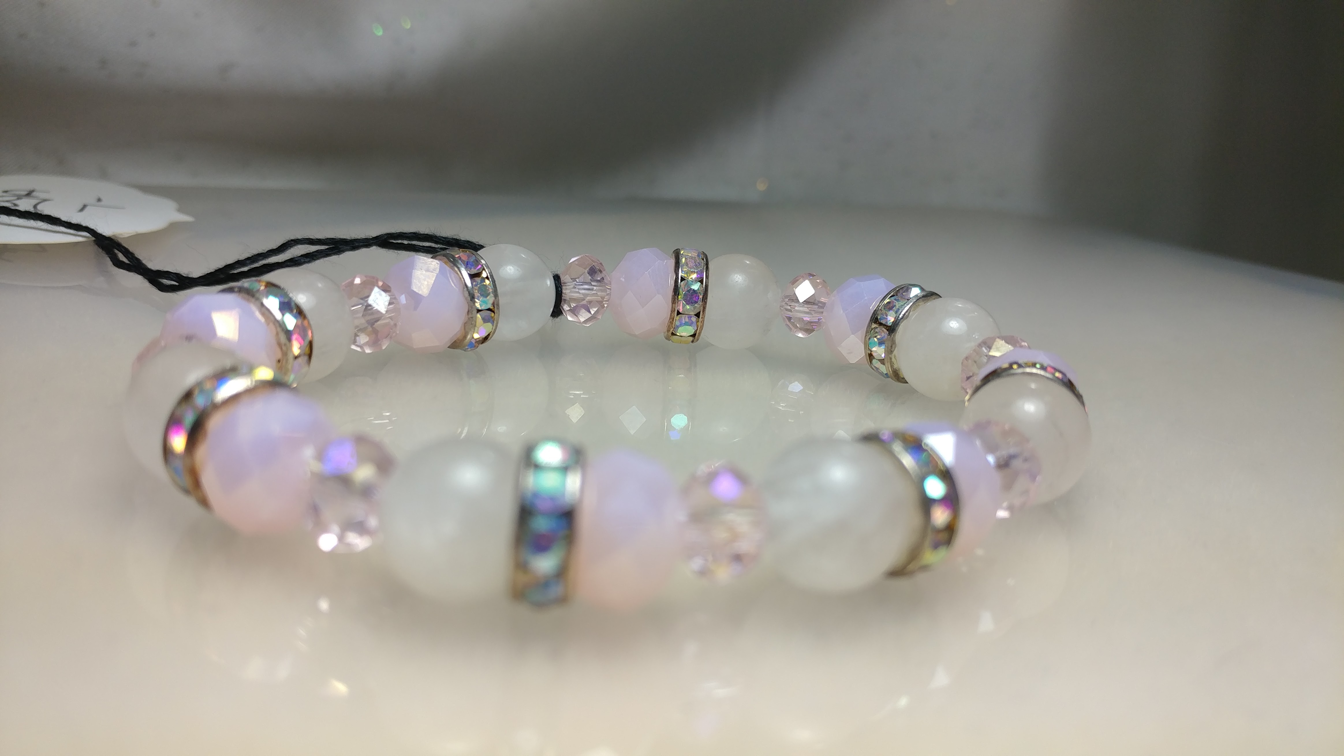 Handmade with pink glass beads, spaced with silver rhinestone AB colored spacers beads on a clear stretchy cord.