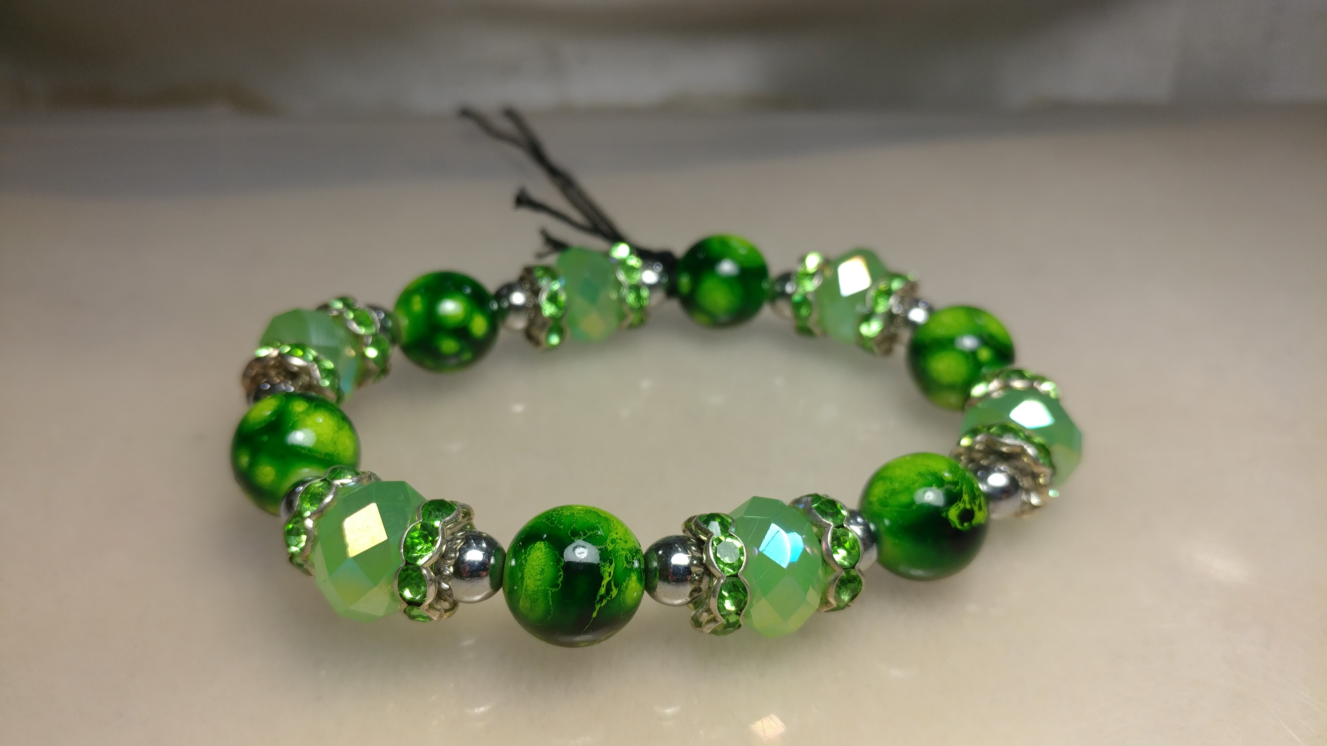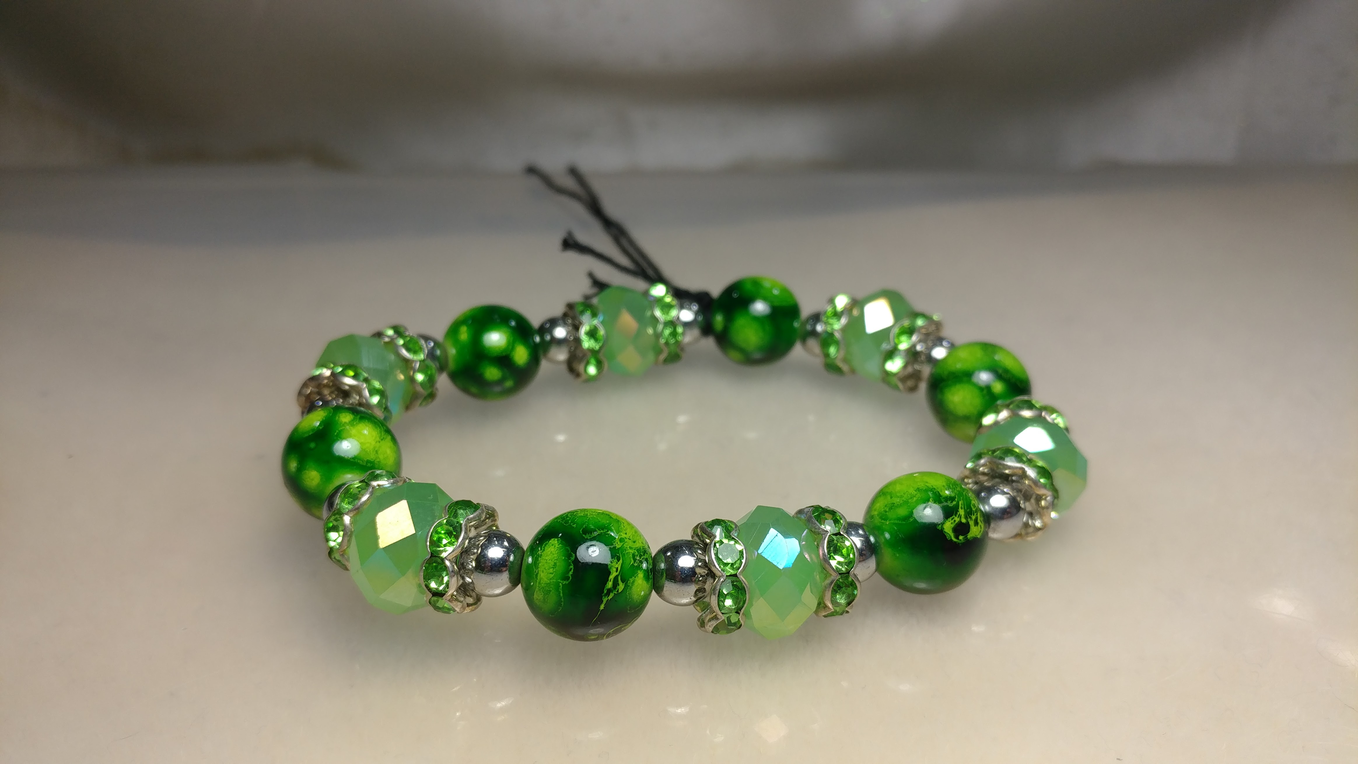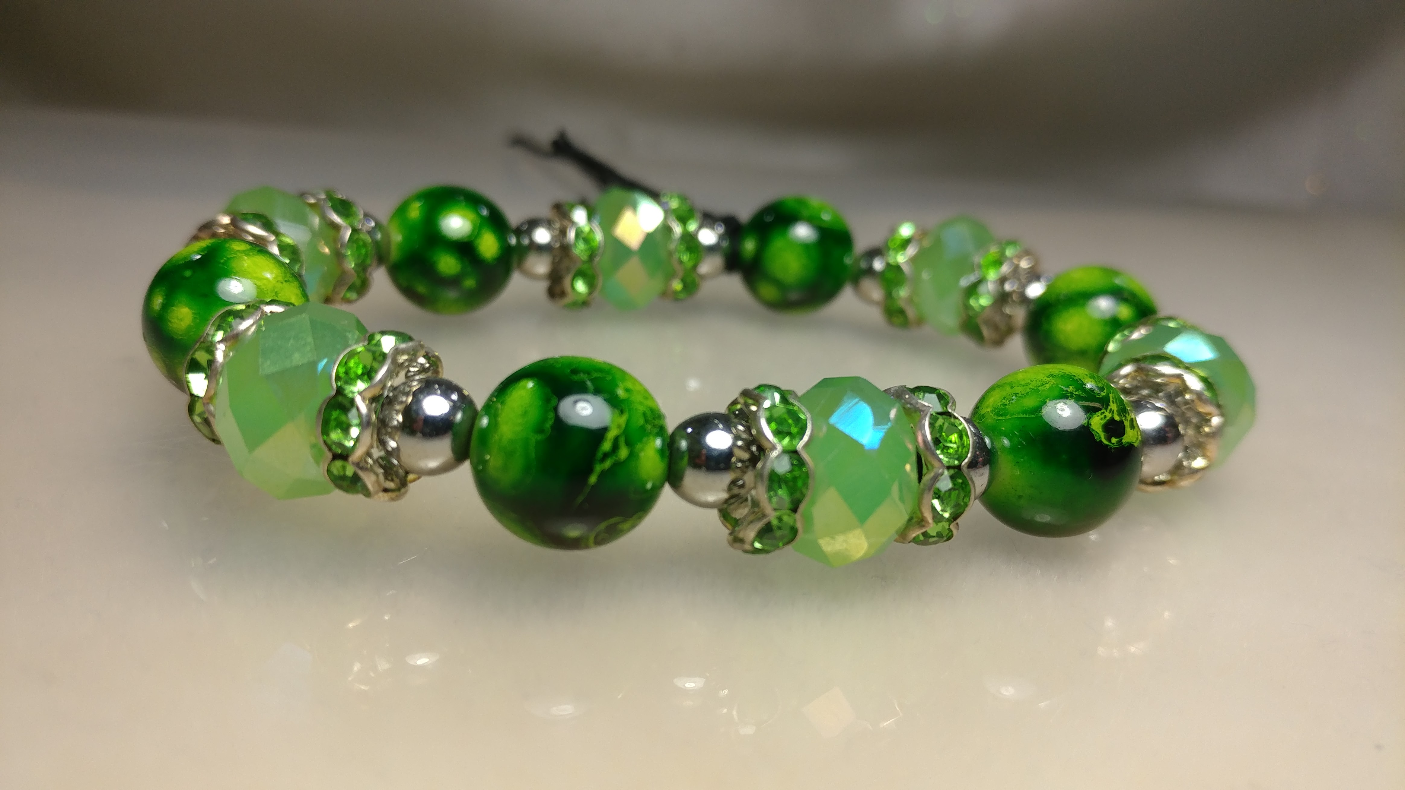 Handmade with green painted glass beads, with a light green crystal glass beads, silver hematite beads spaced with silver green rhinestone beads on a clear stretchy cord.