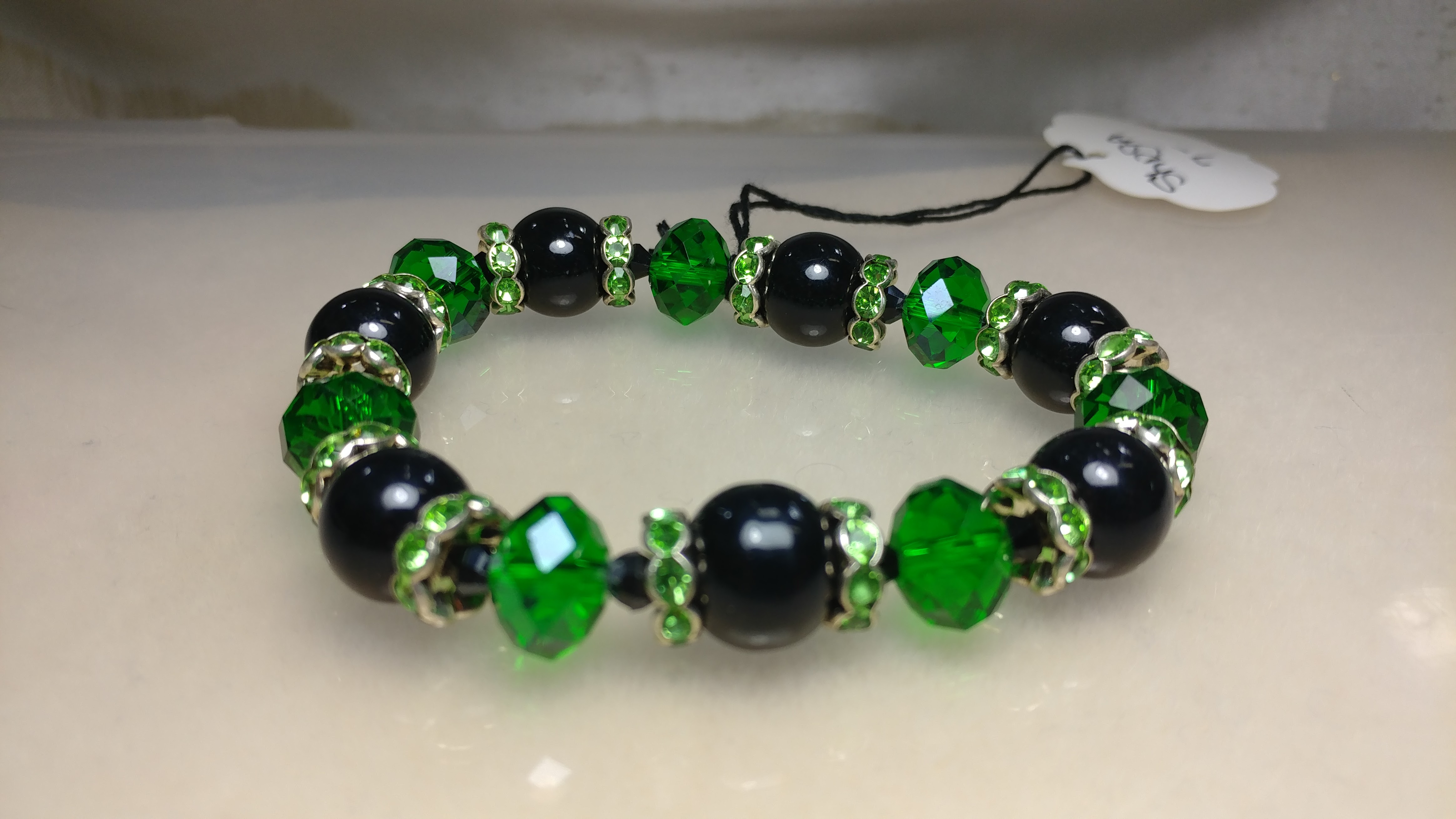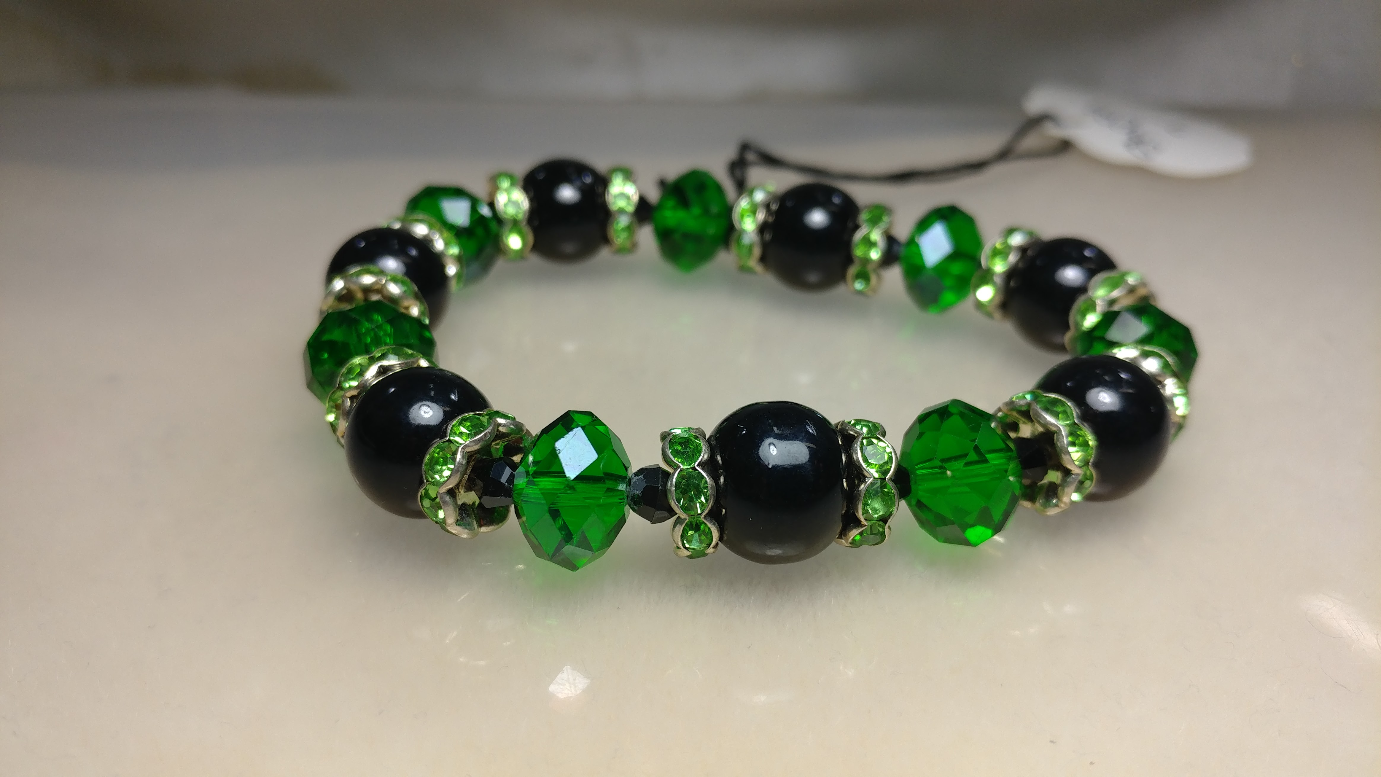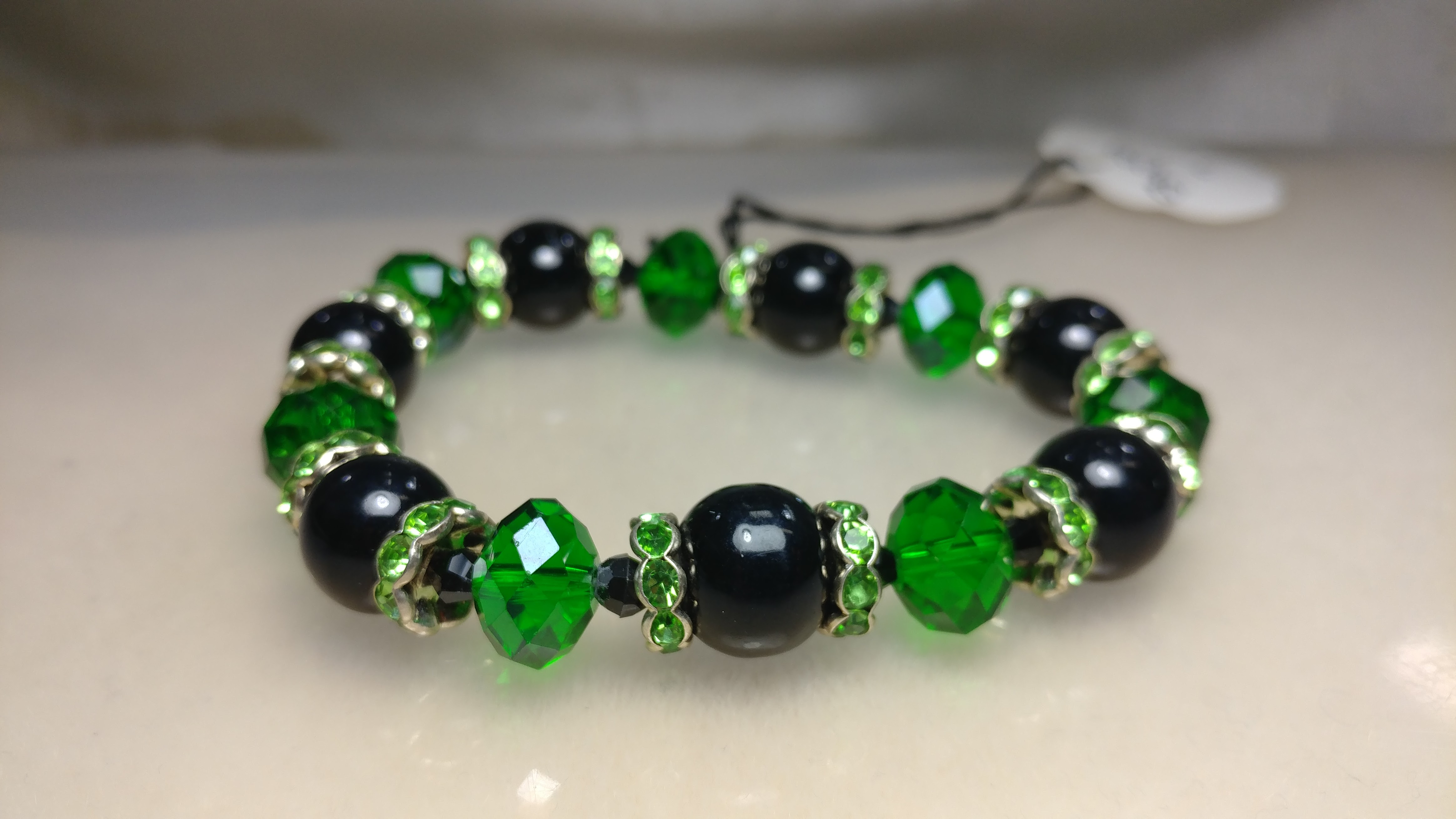 Handmade with green and black glass bead, painted black glass beads, spaced with silver and green rhinestone spacer on a clear stretchy cord.
