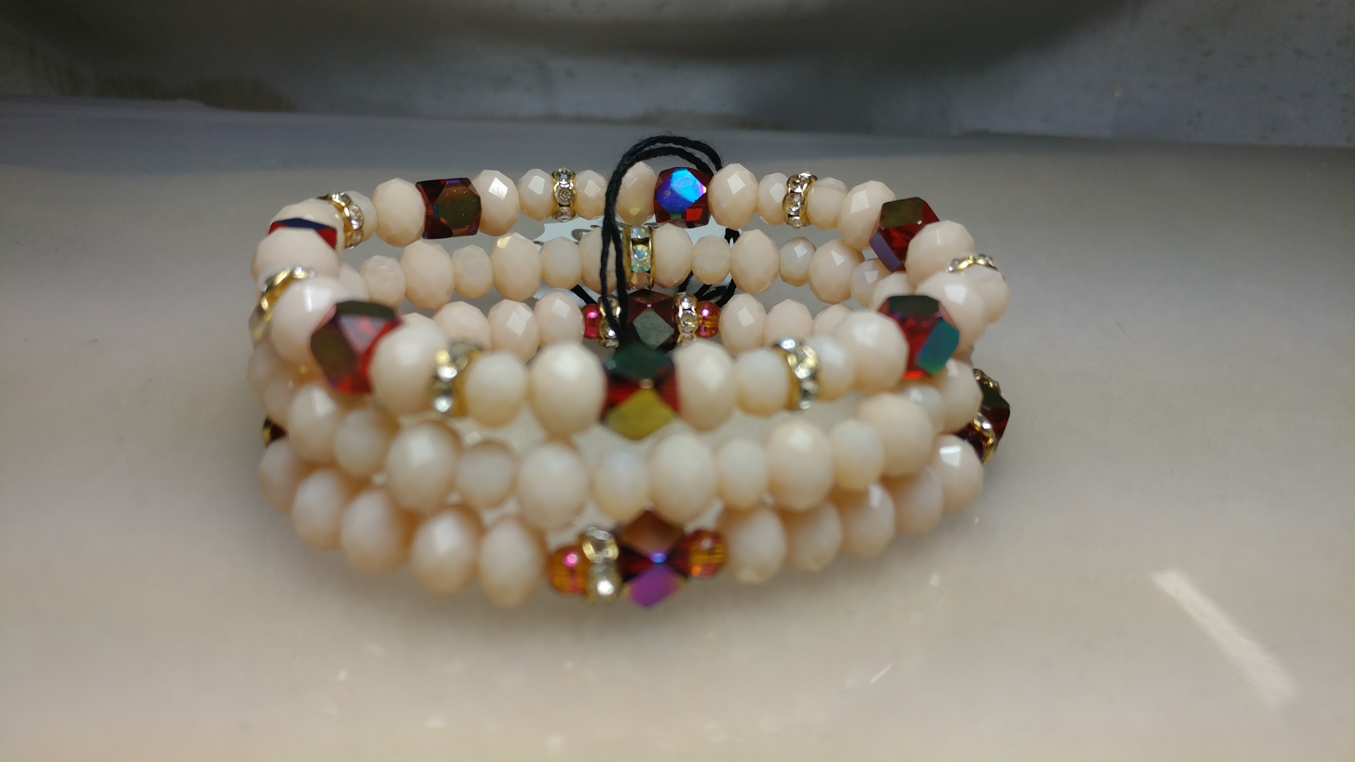 Handmade with taupe colored glass bead, red AB glass bead spaced with gold rhinestone spacers on a clear stretchy cord.