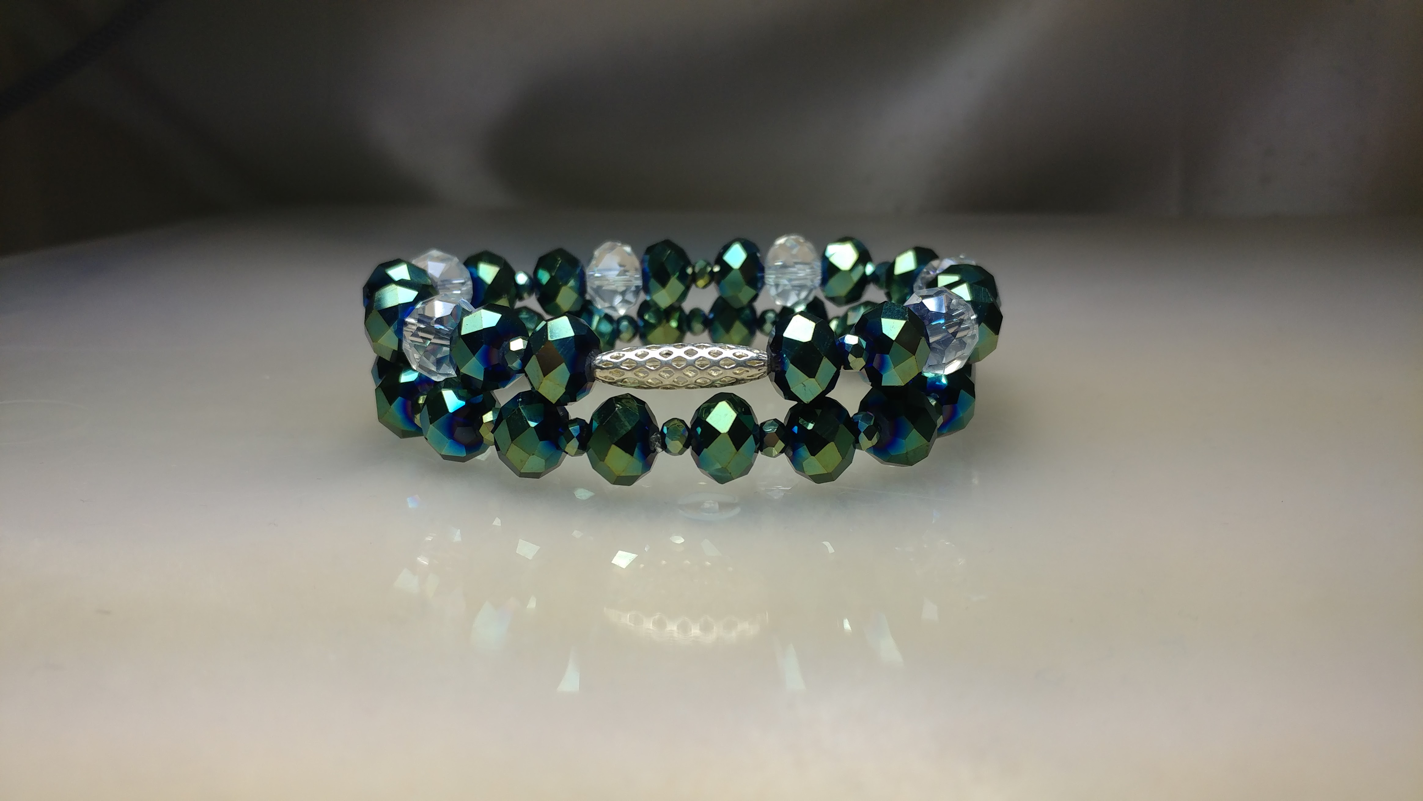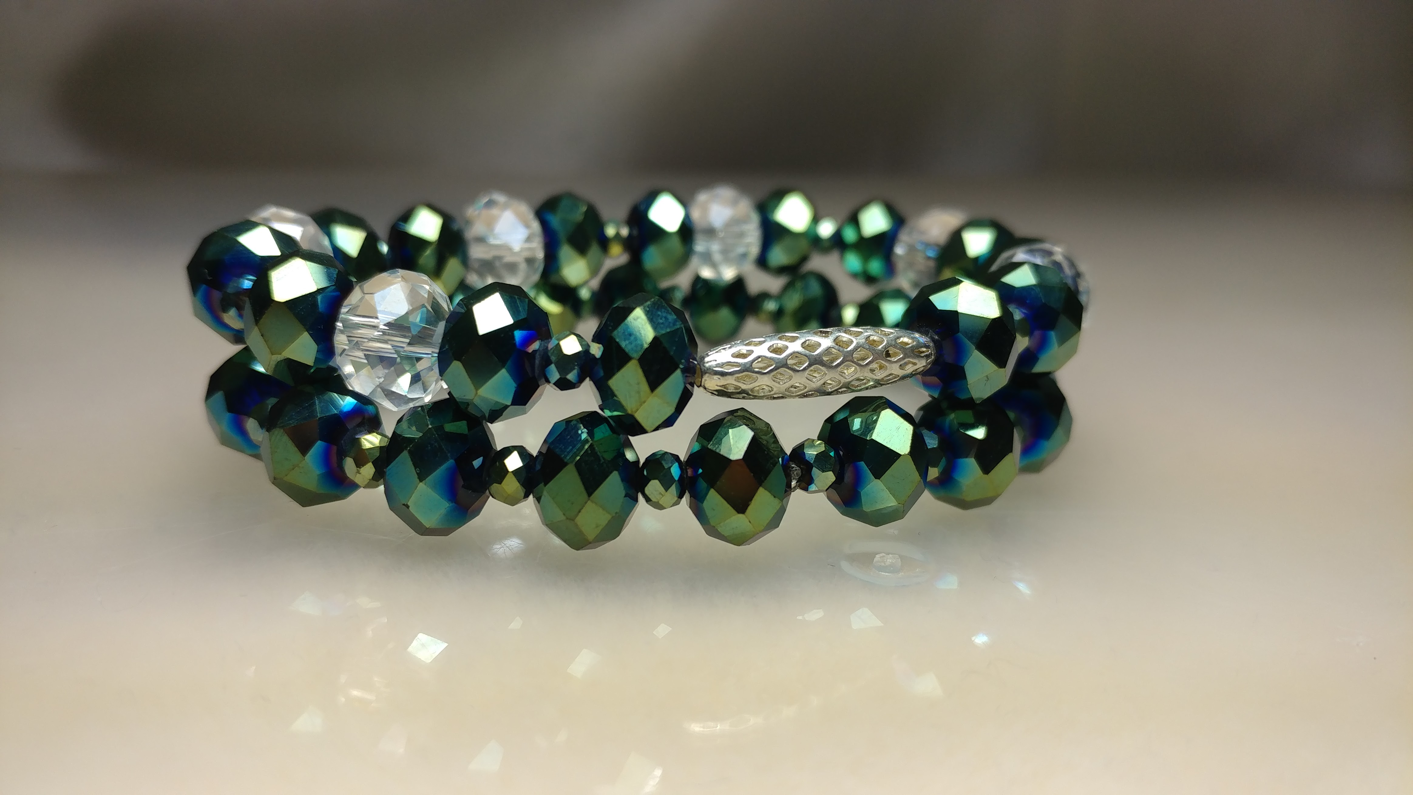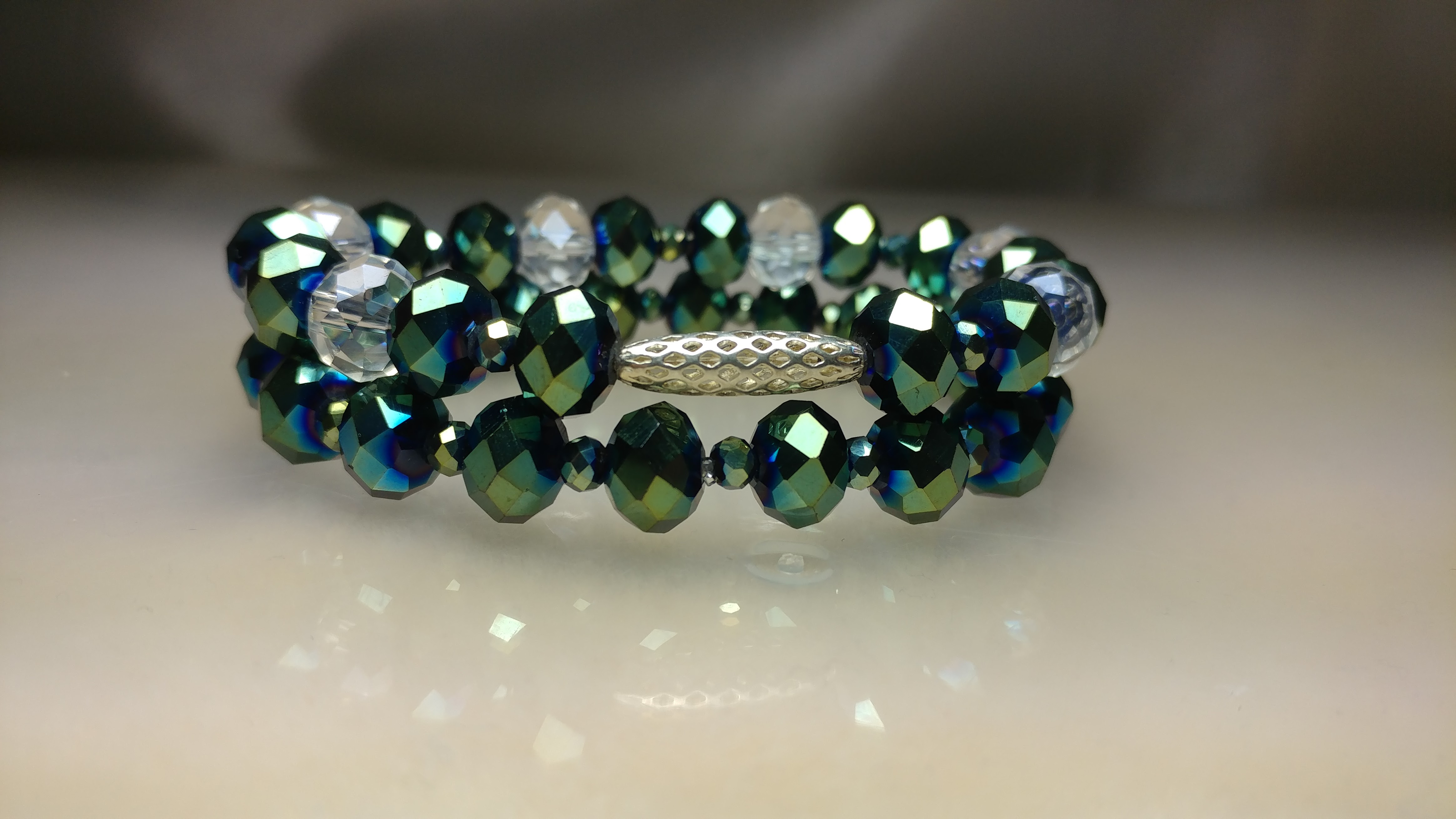 Made with green multicolored glass crystals and pave rhinestone beads, with a silver connector bead and silver rhinestone spacers on a stretchy string