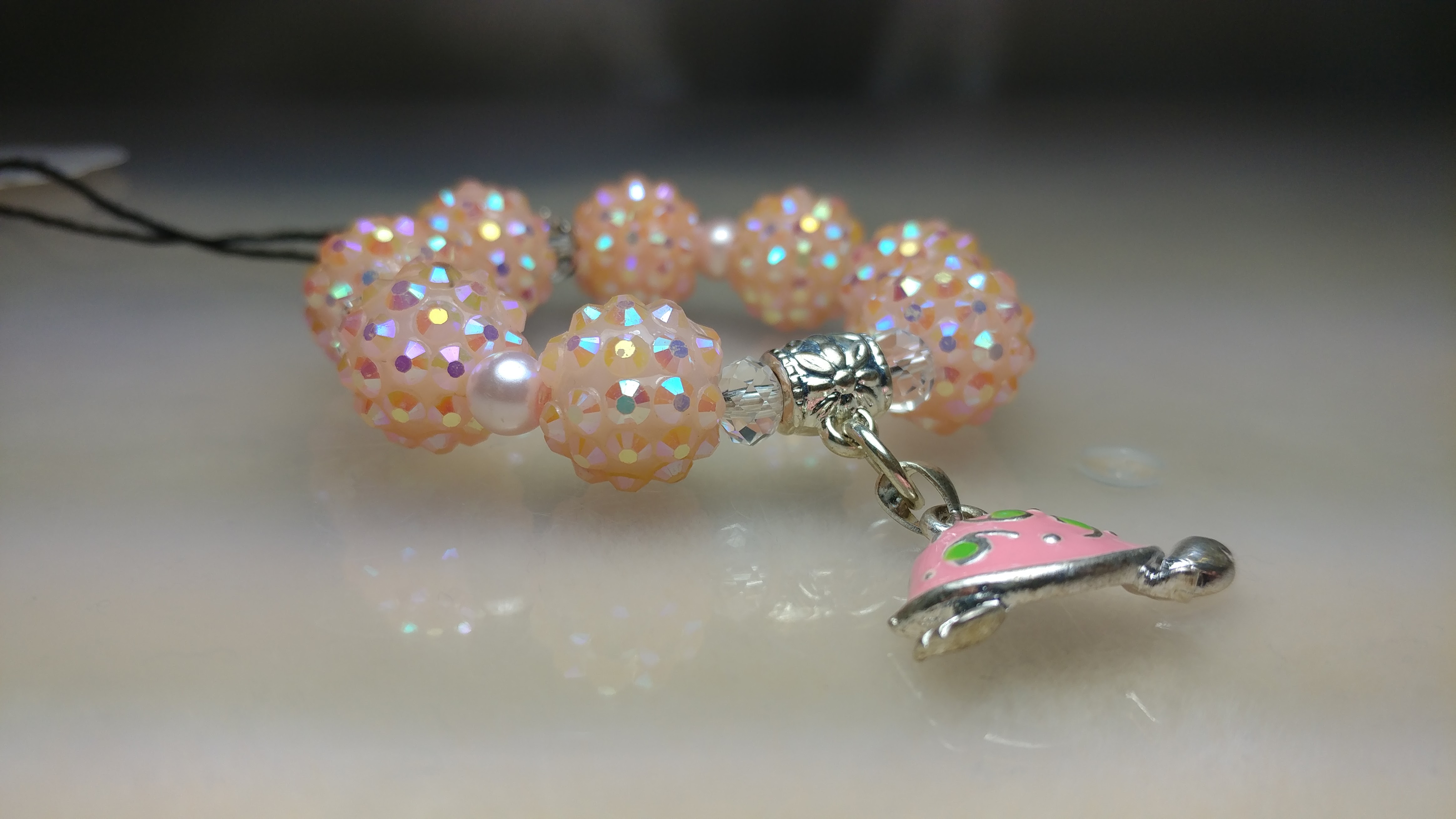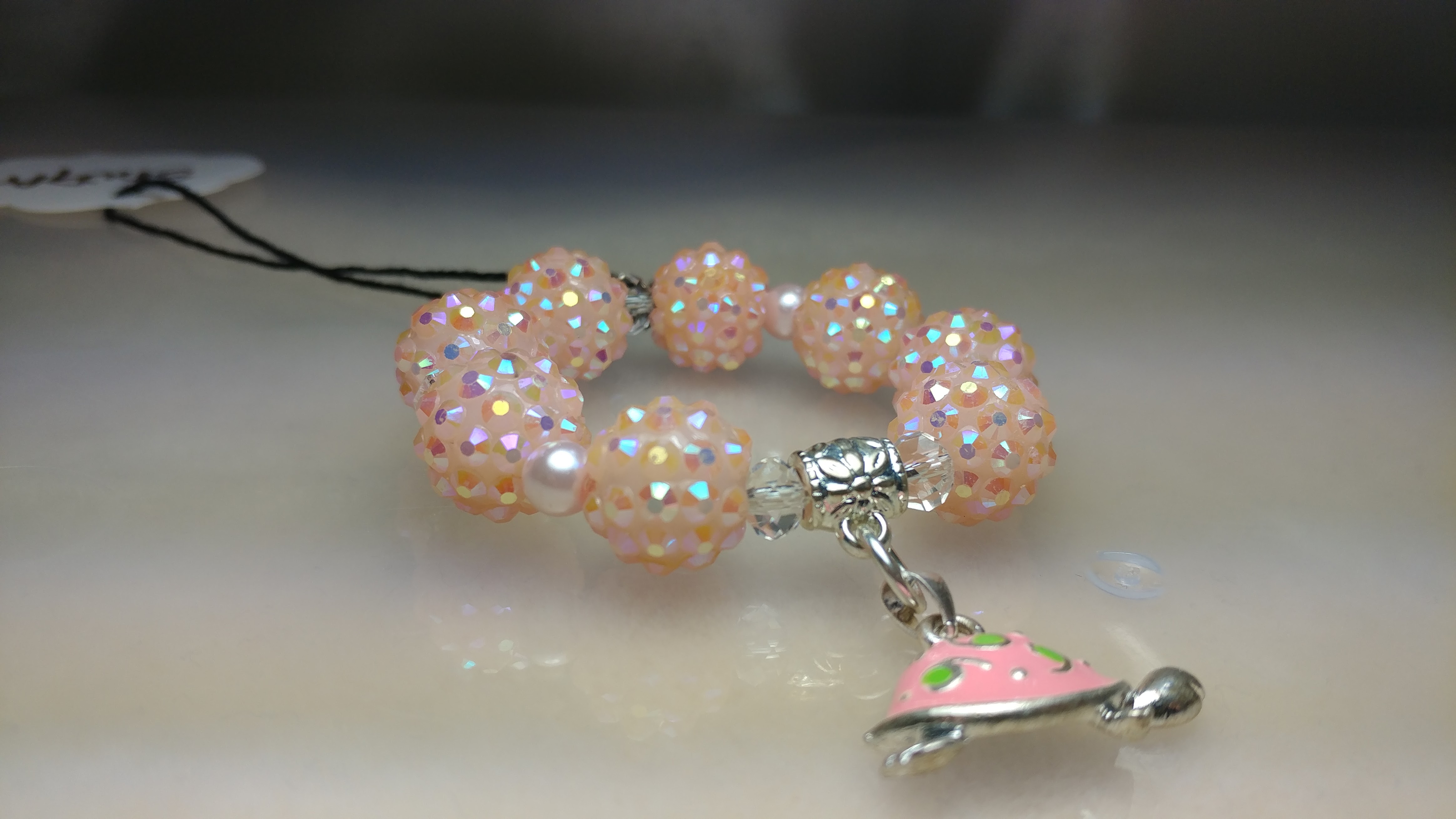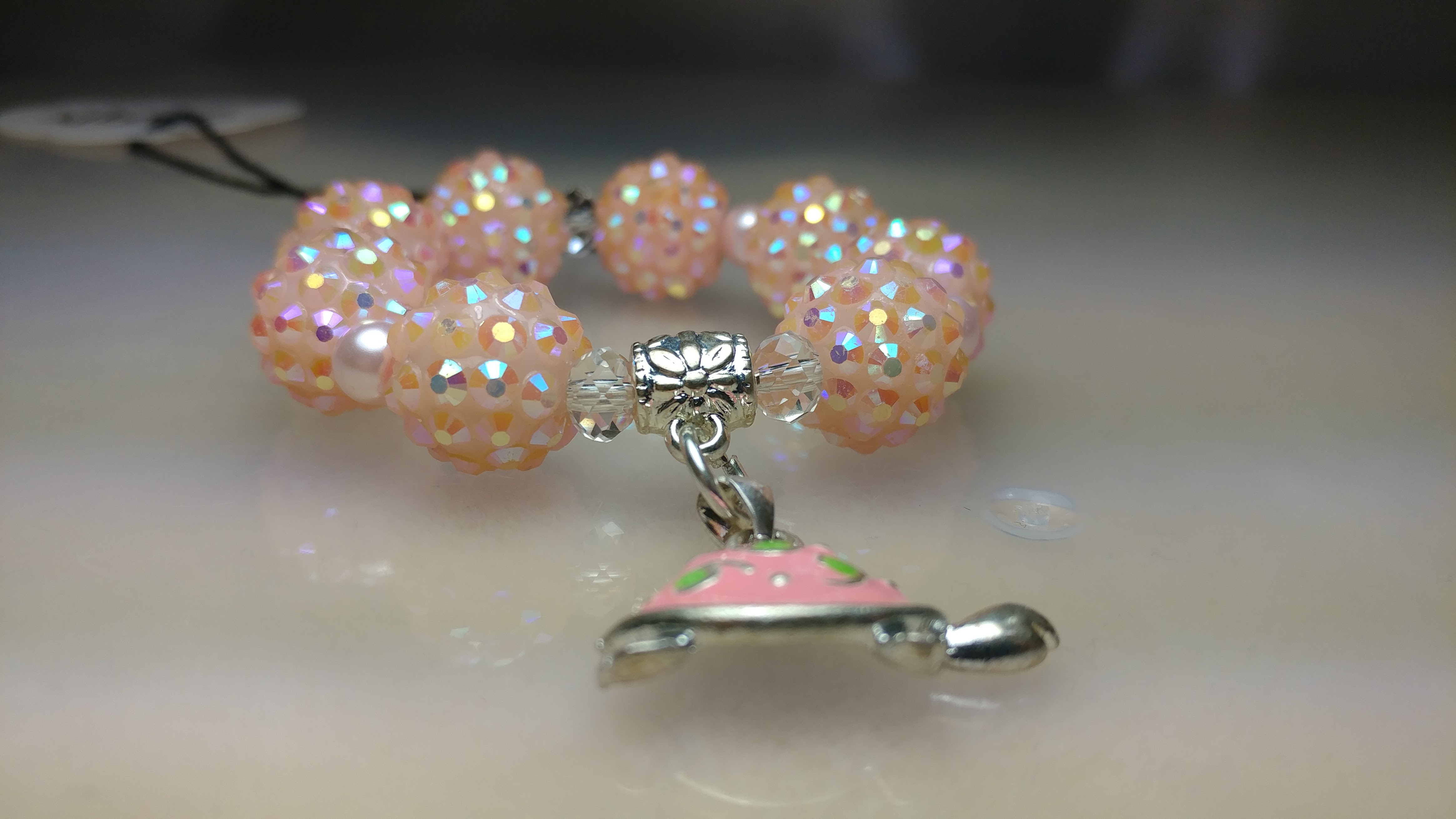 Made with lovely pink acrylic disco ball beads, accented with a cute turtle charm pair with pink pearl beads on a clear stretchy cord.