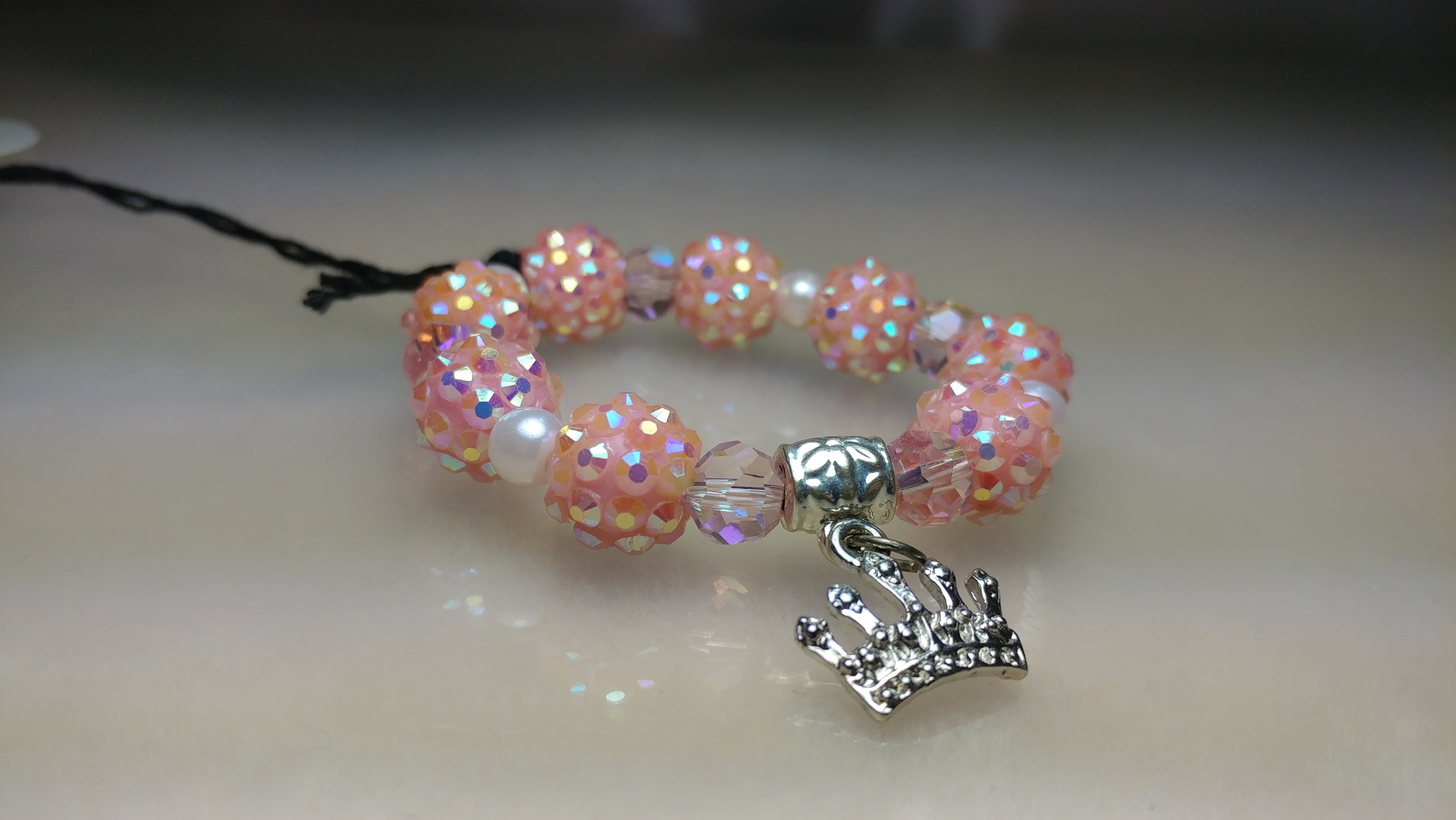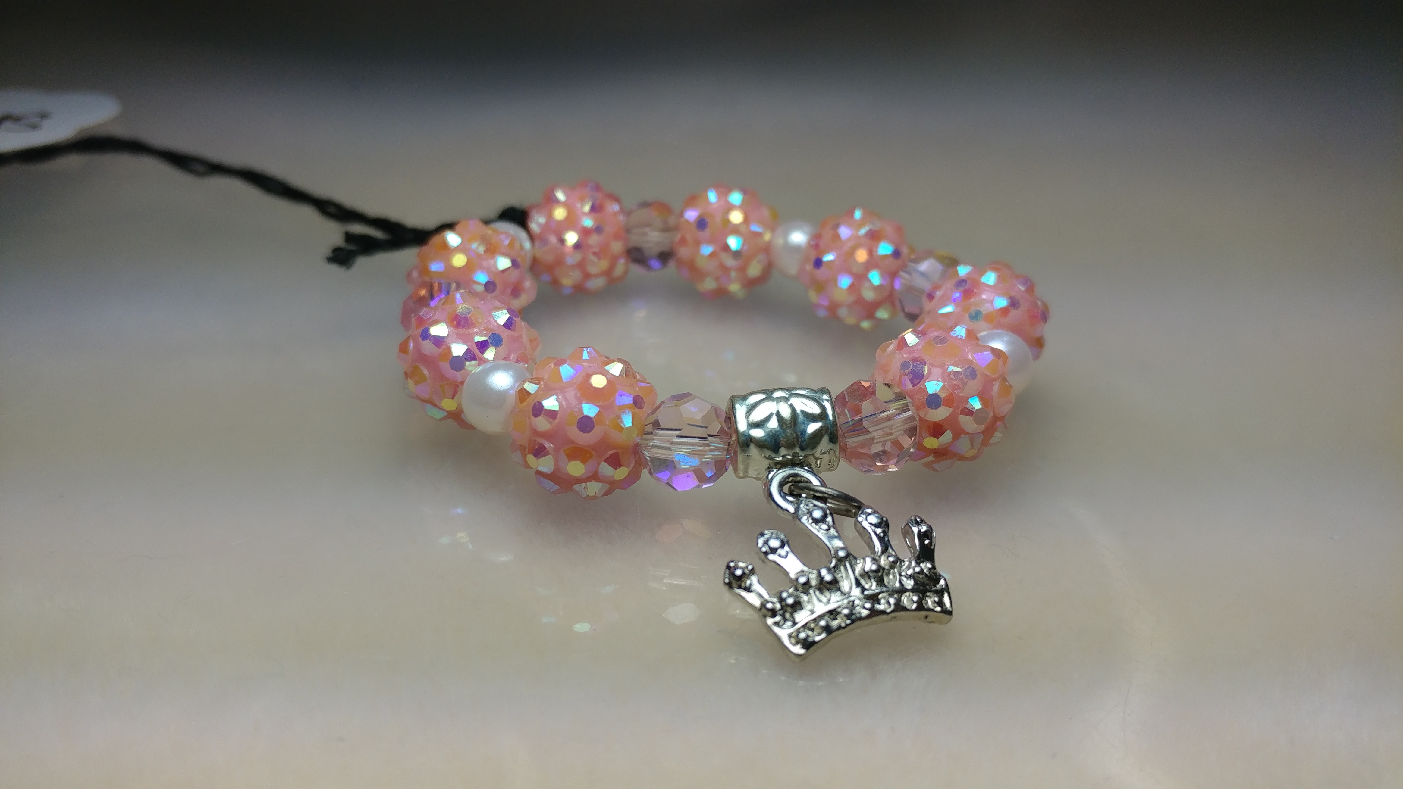 Made with lovely pink acrylic disco ball beads, accented with a cute rhinestone crown charm pair with pink pearl beads on a clear stretchy cord.