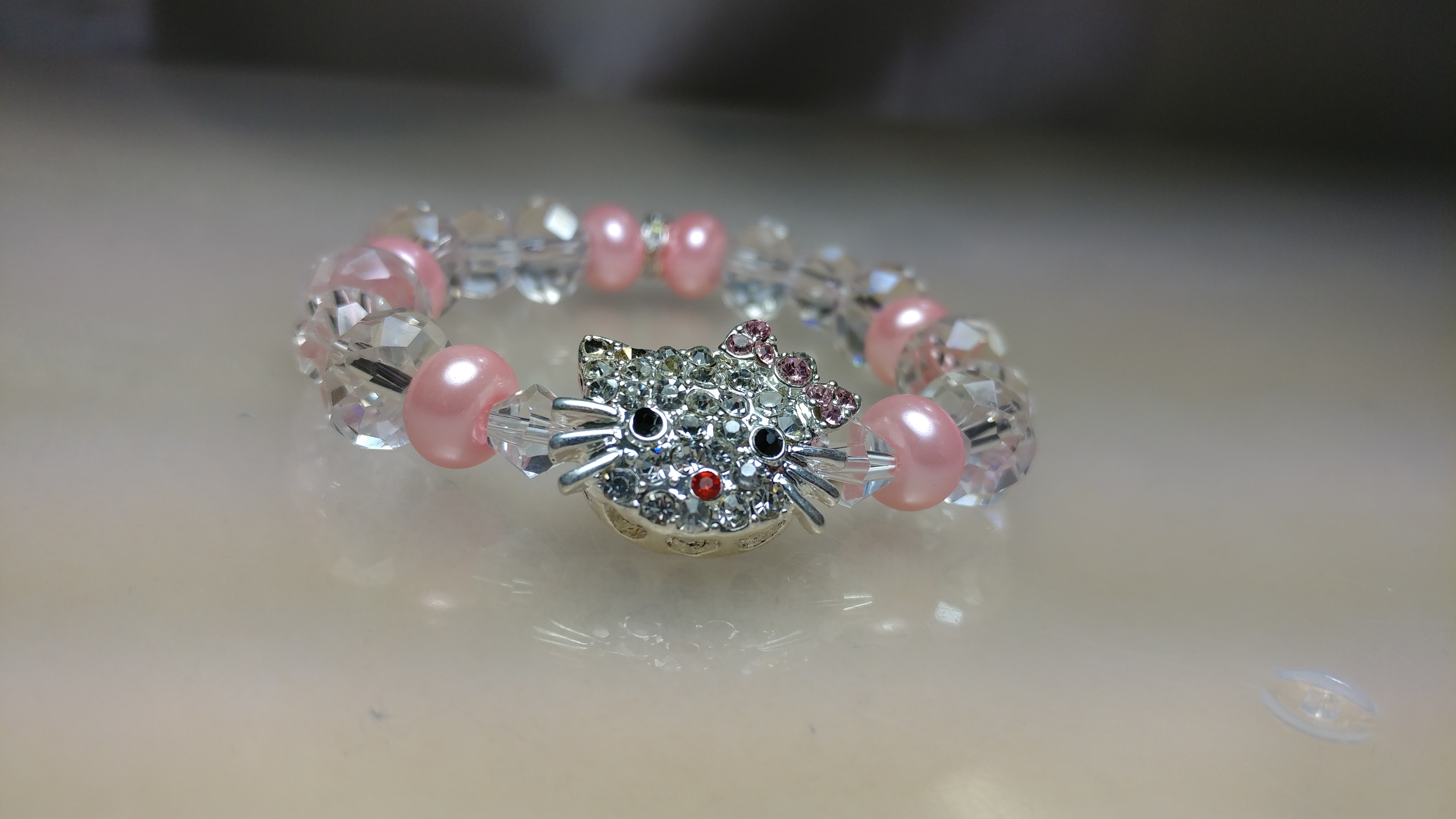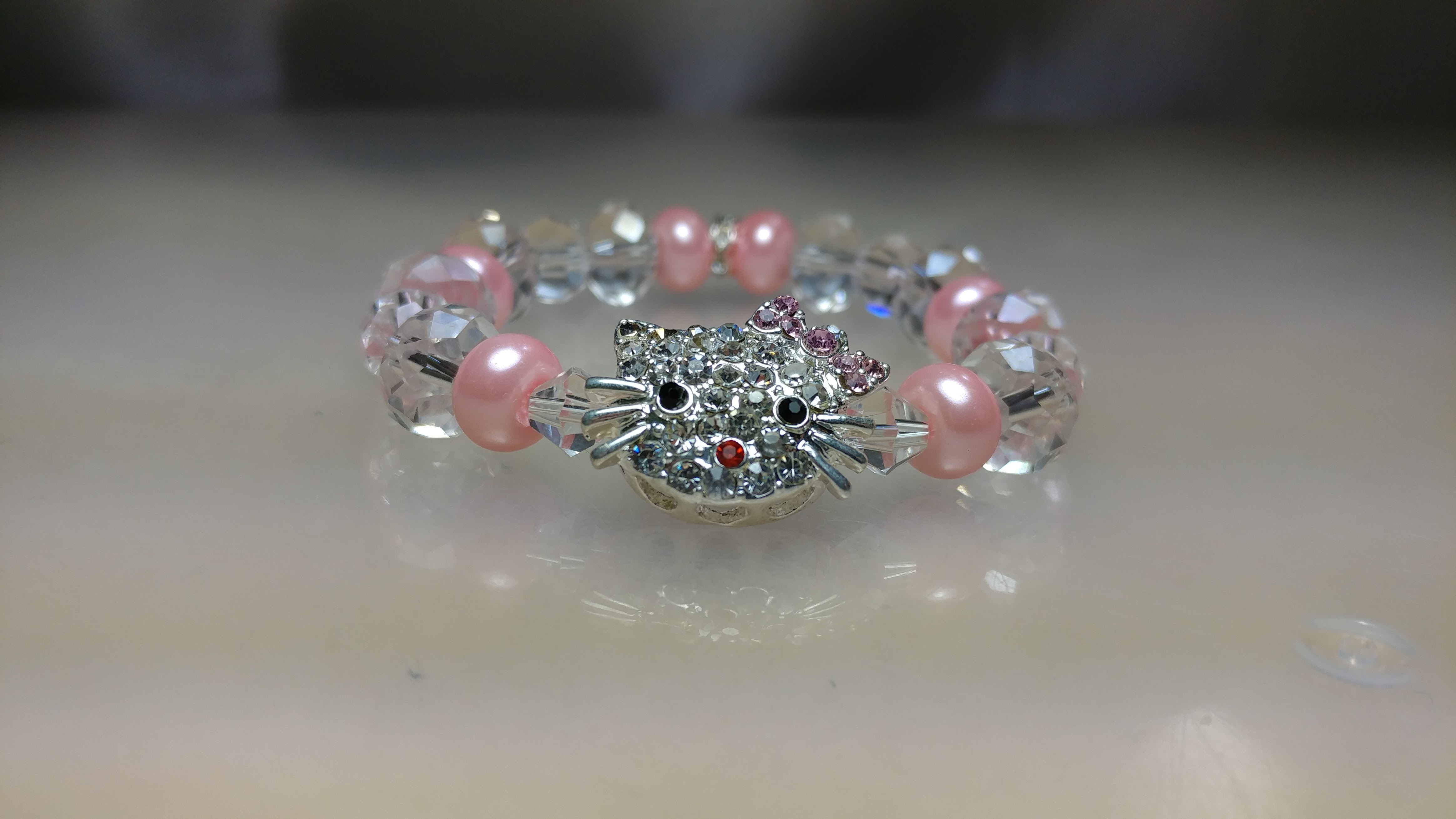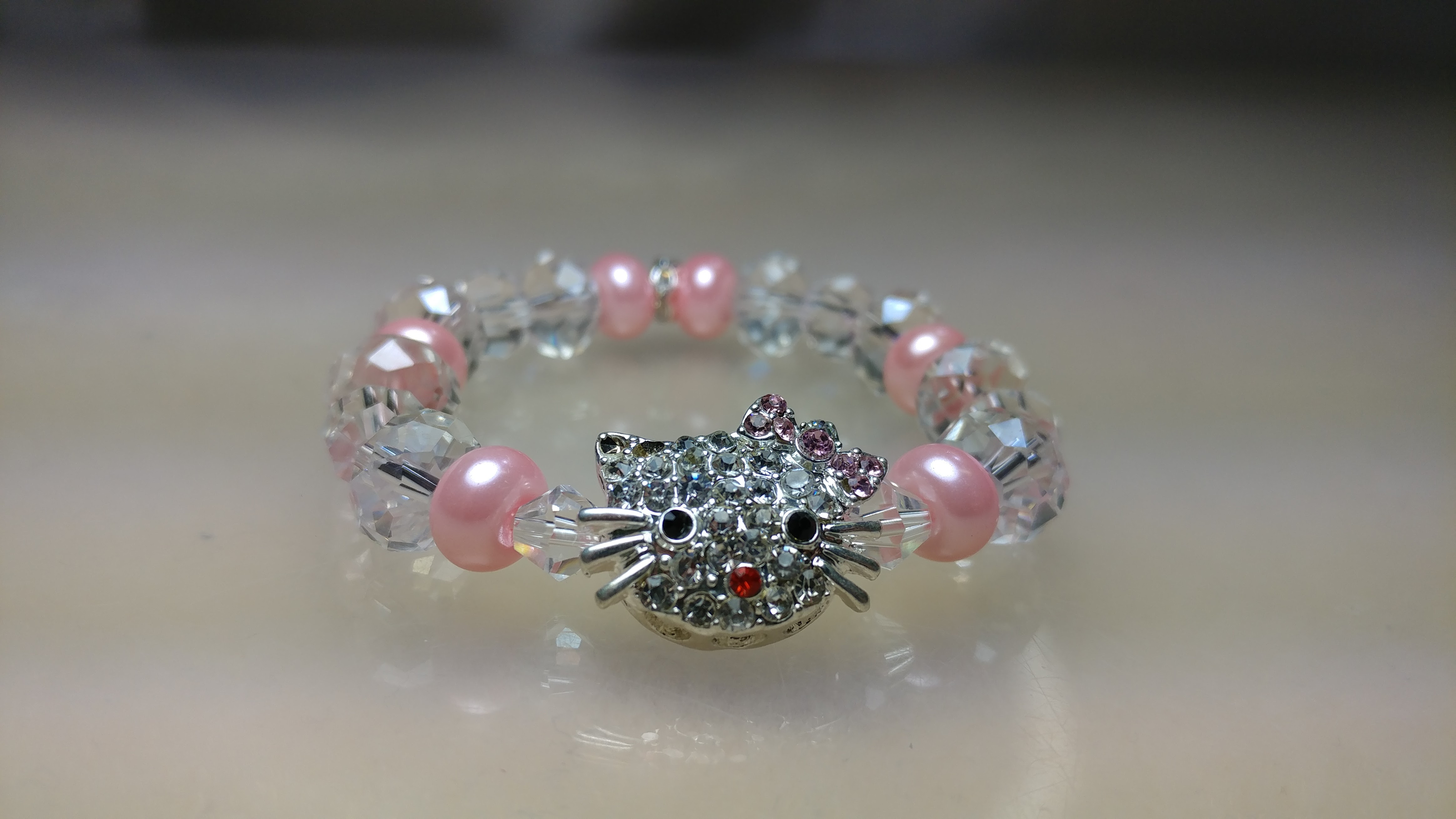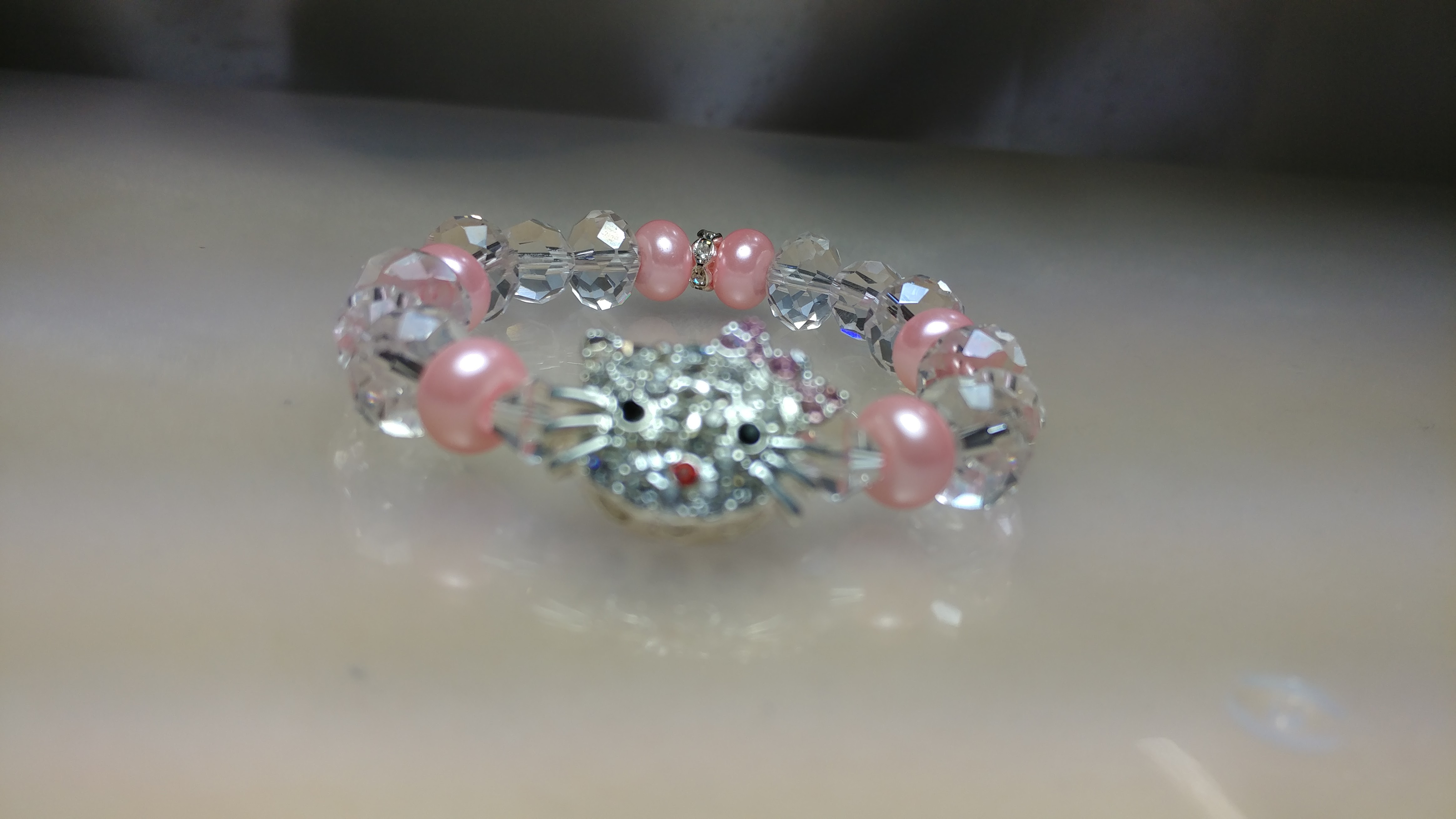 Handmade with a rhinestone kitty cat charm connector, clear glass beads, pink pearl beads, placed on a clear stretchy cord.