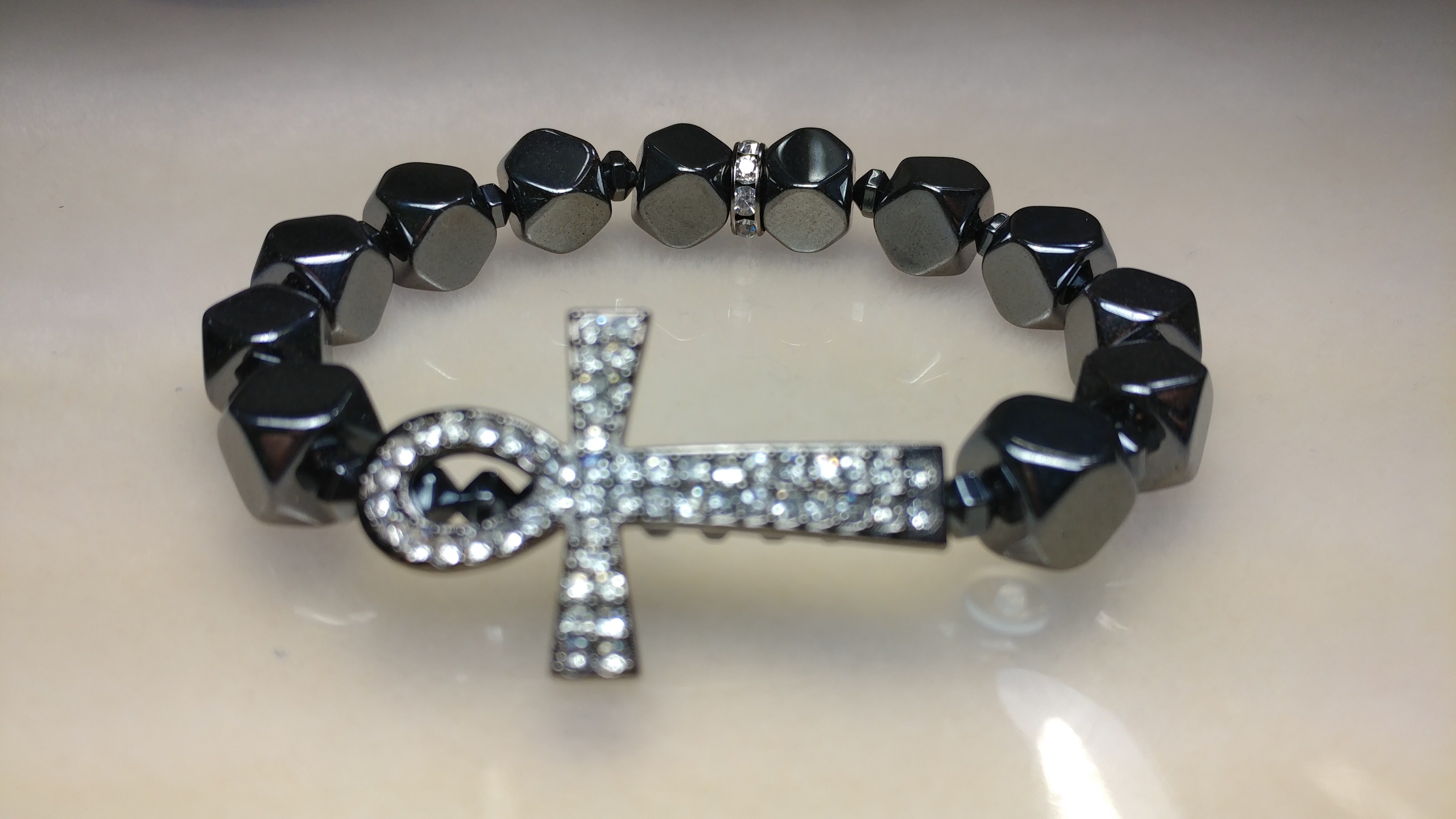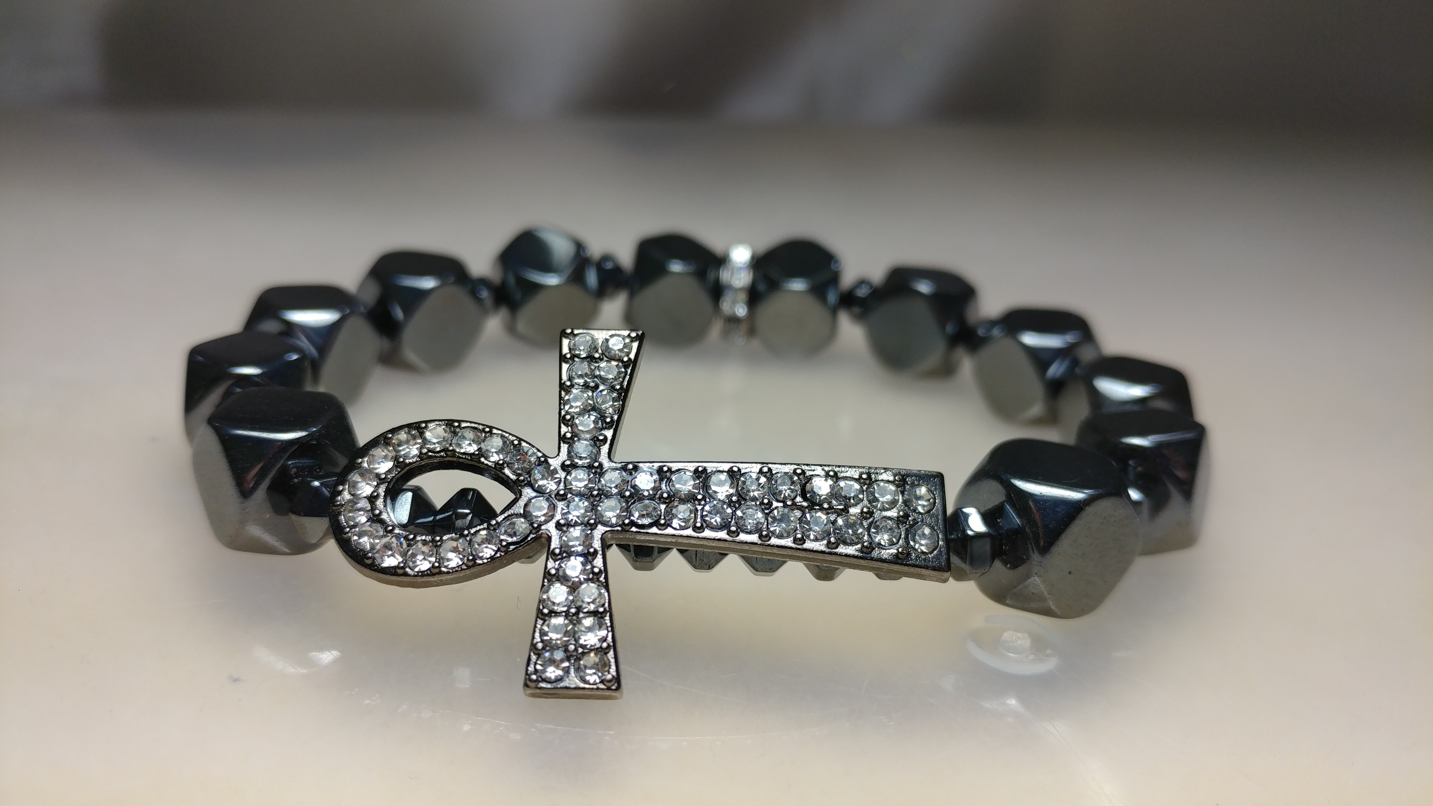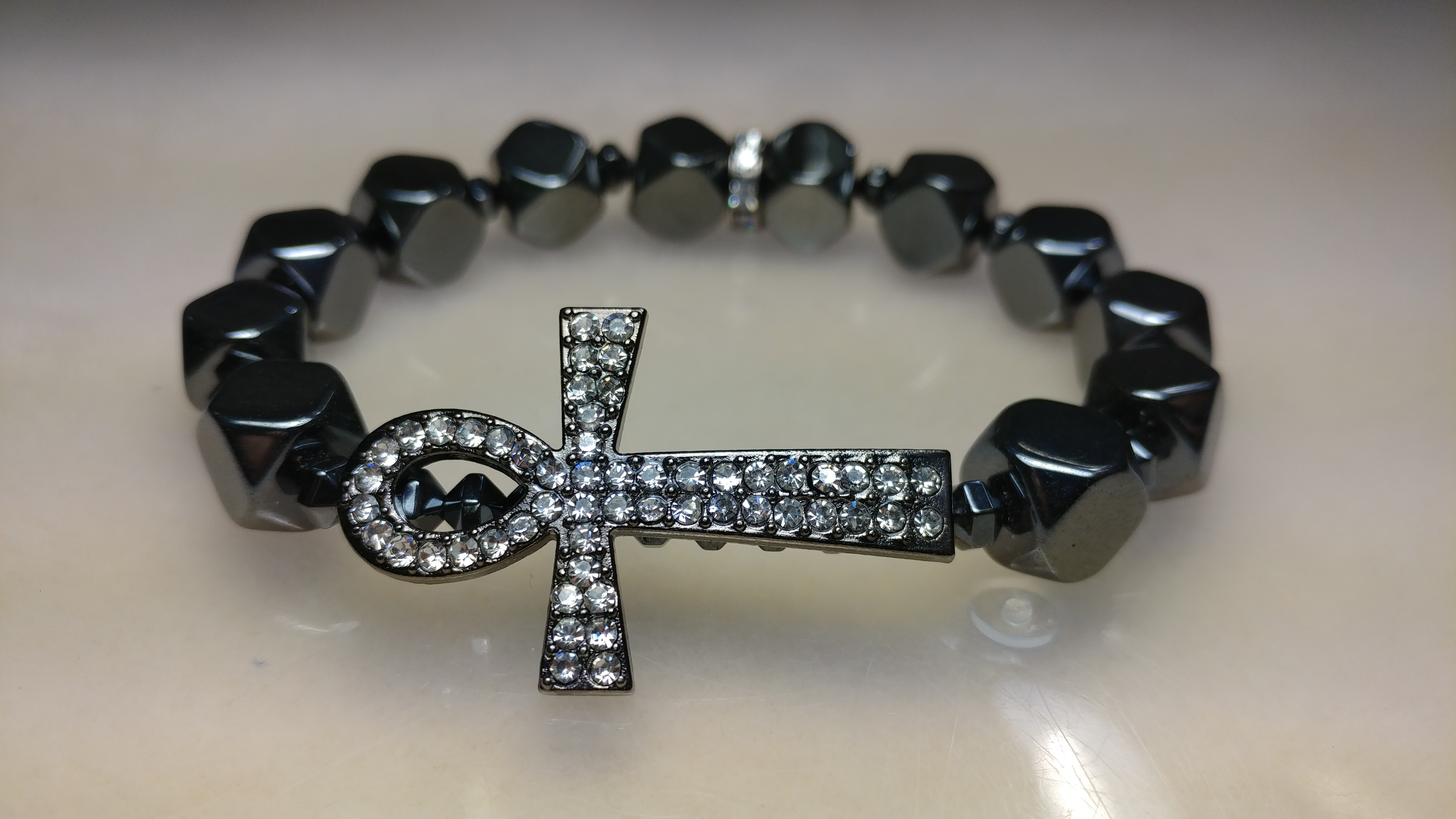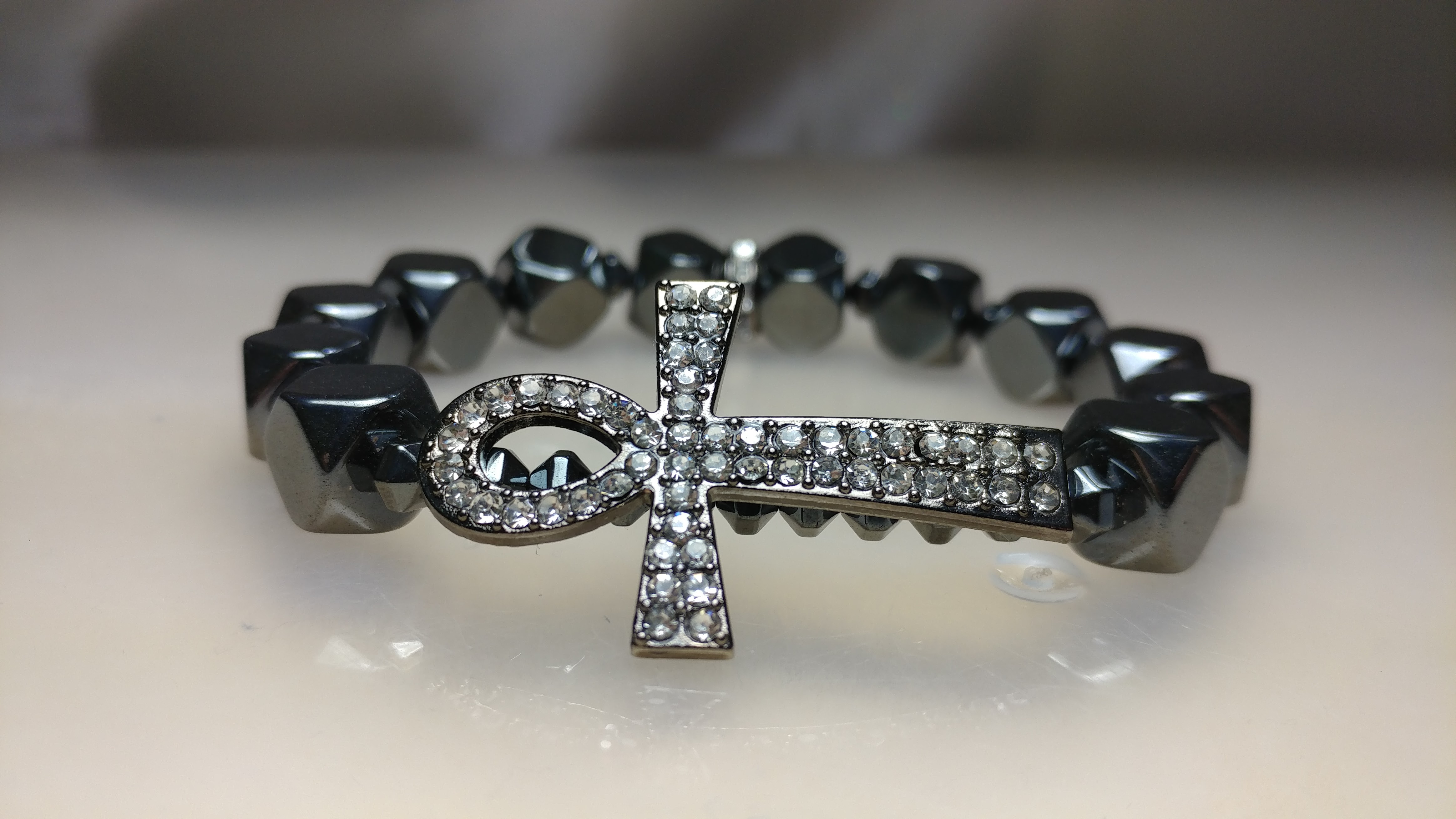 Handmade with a Rhinestone Ankh connector, hematite beads, placed on a clear stretchy cord.