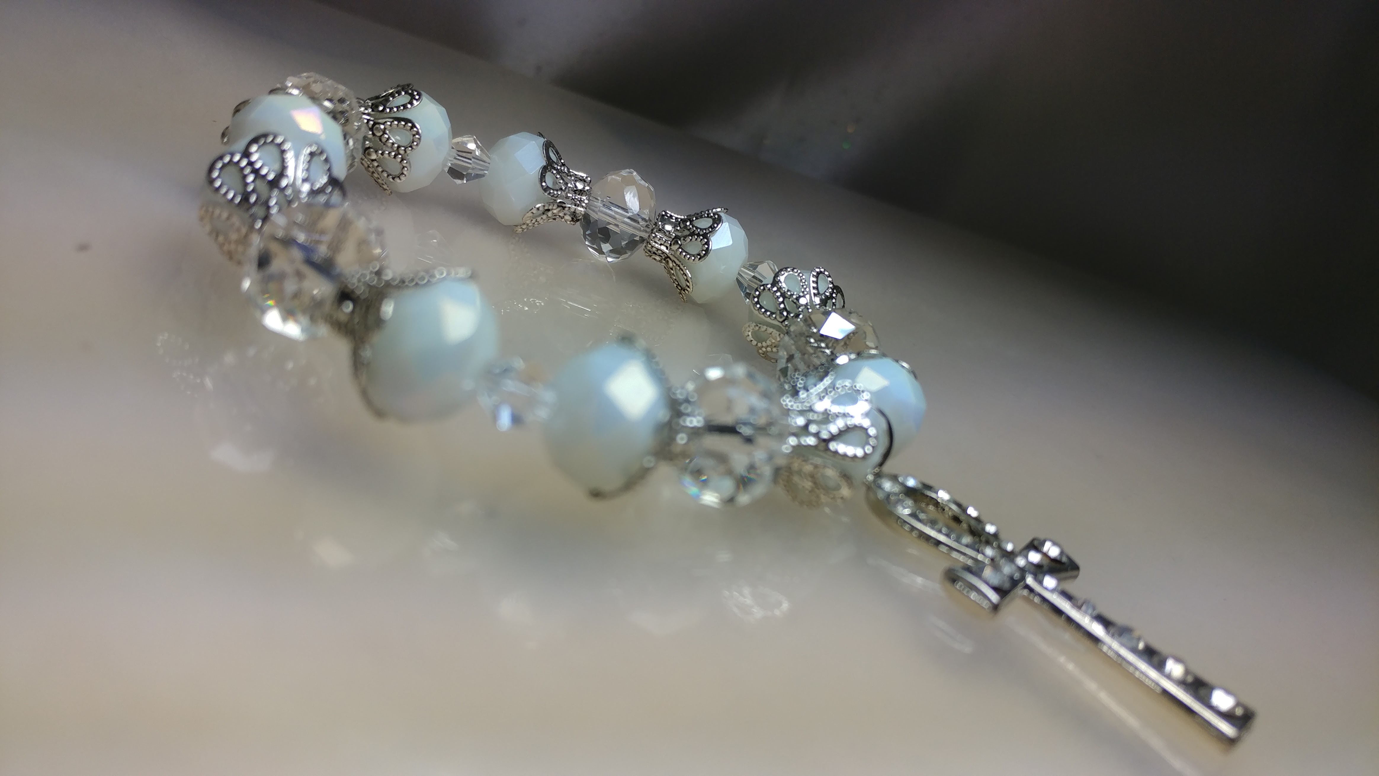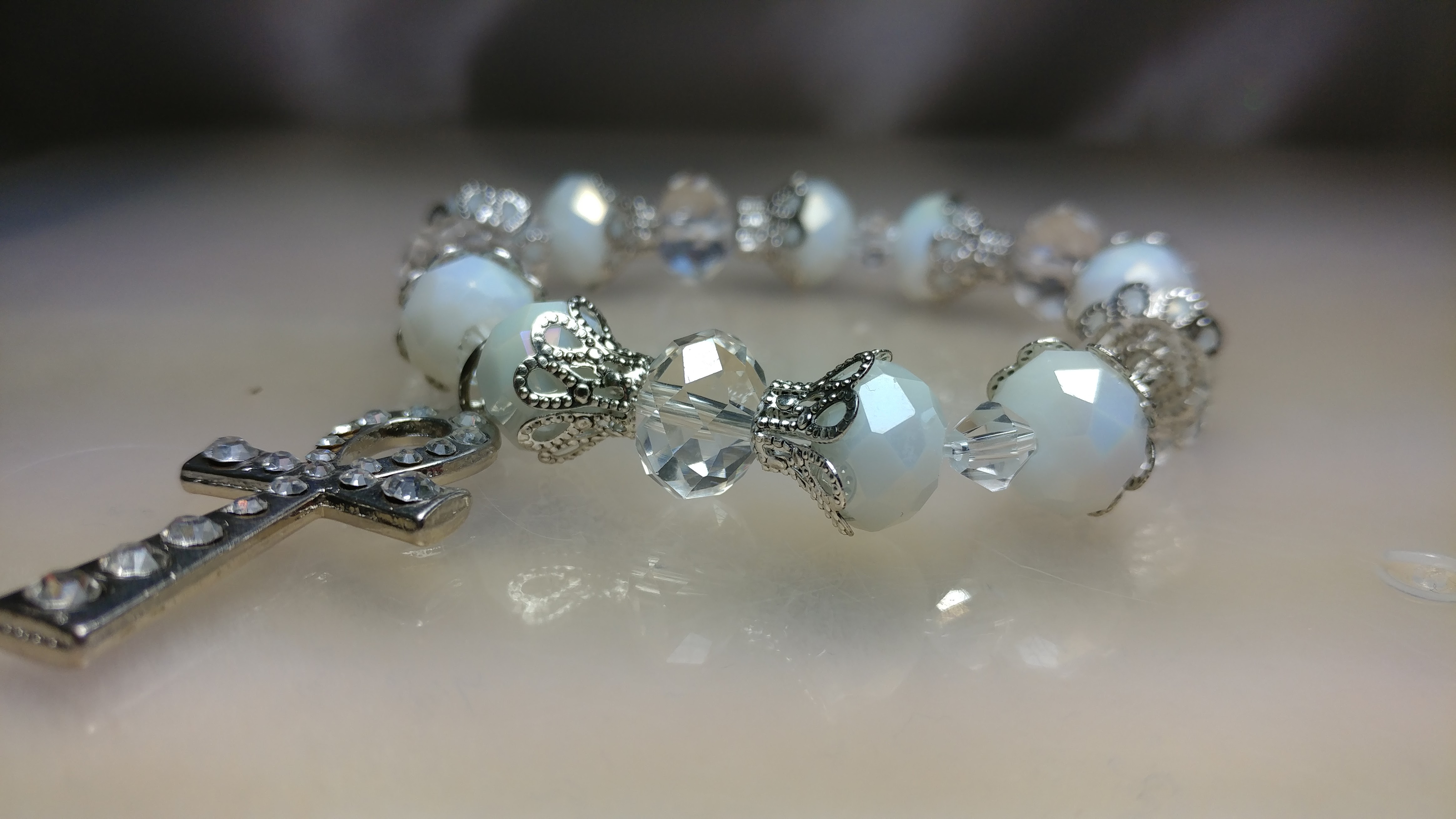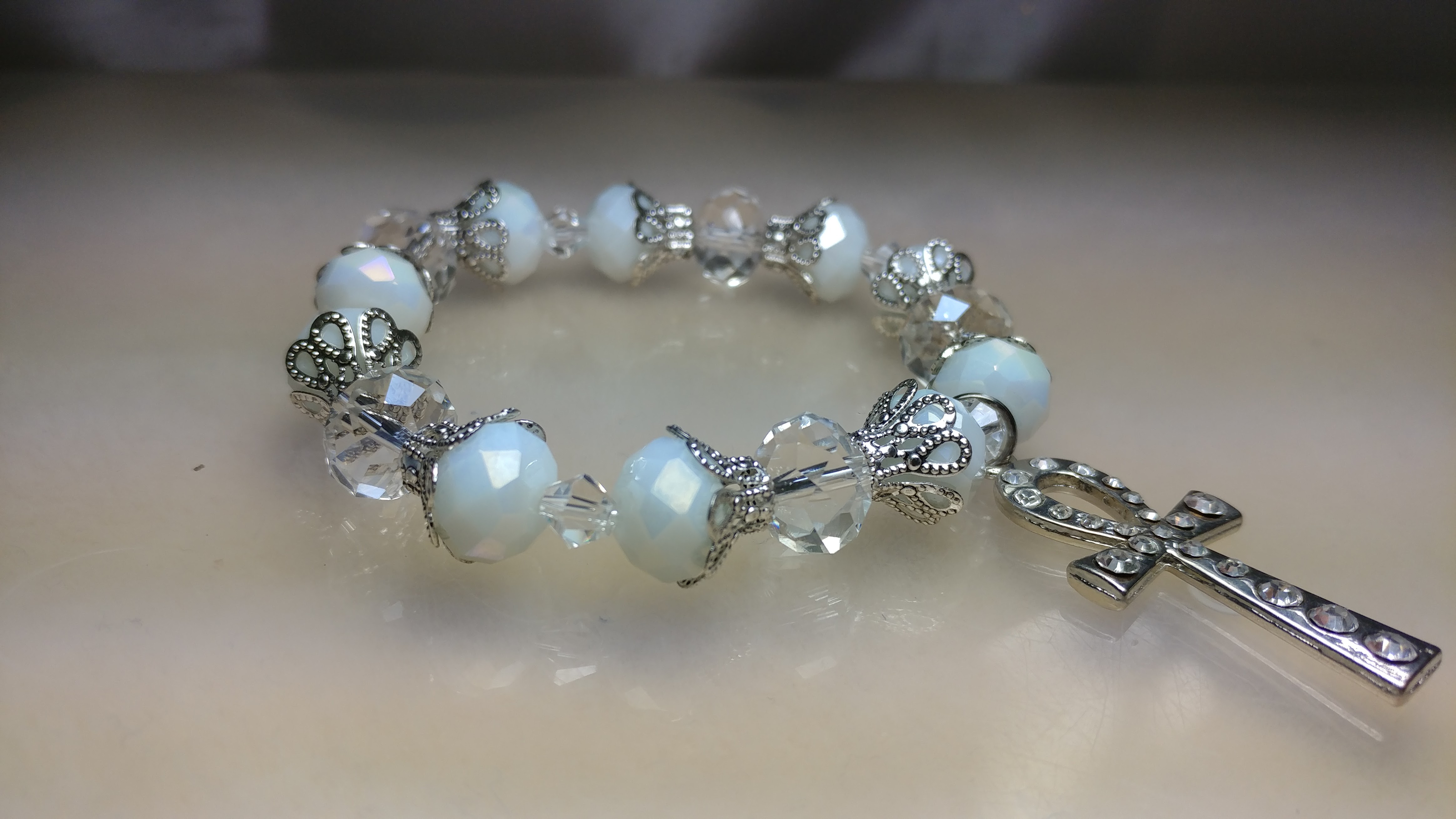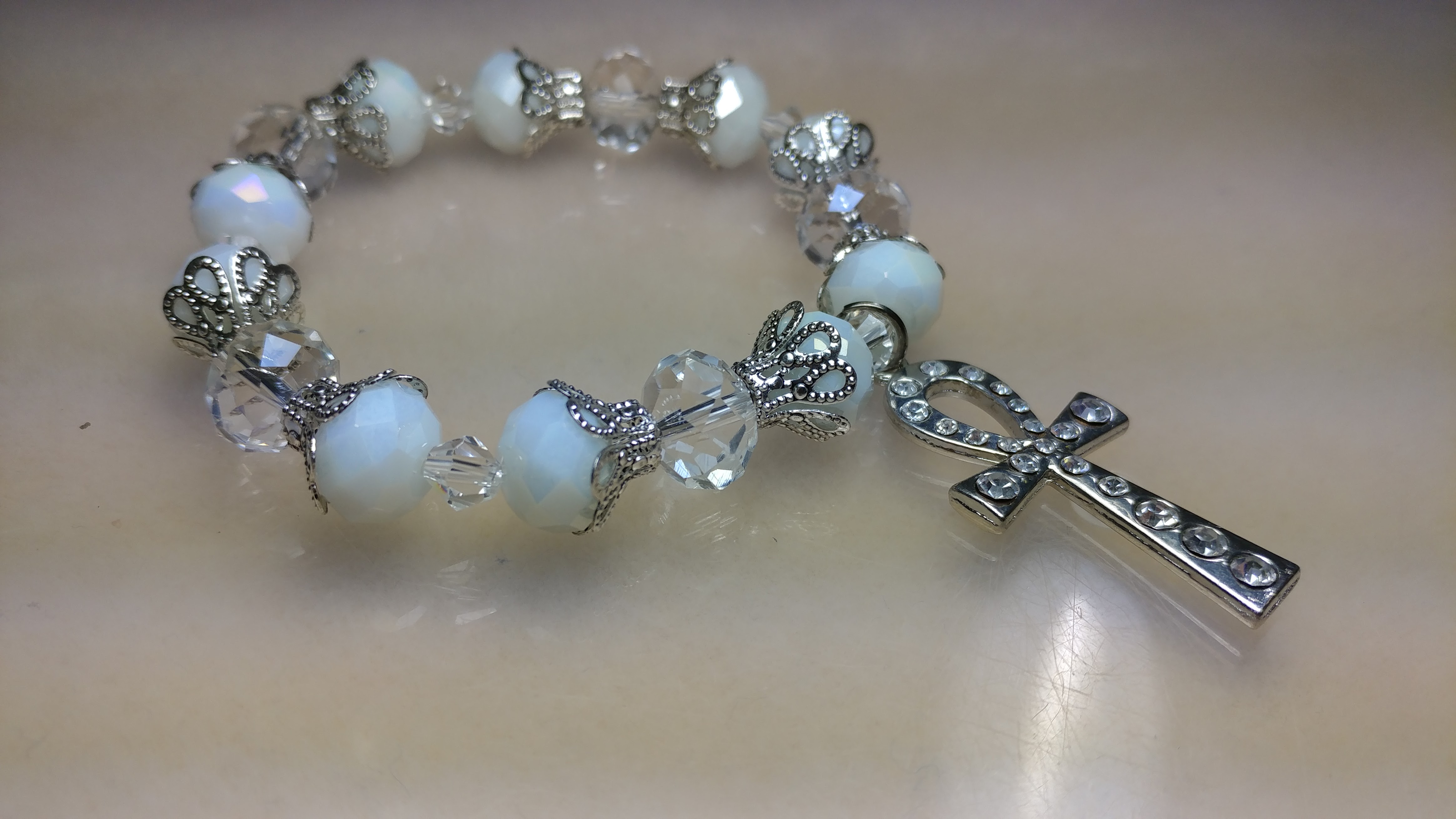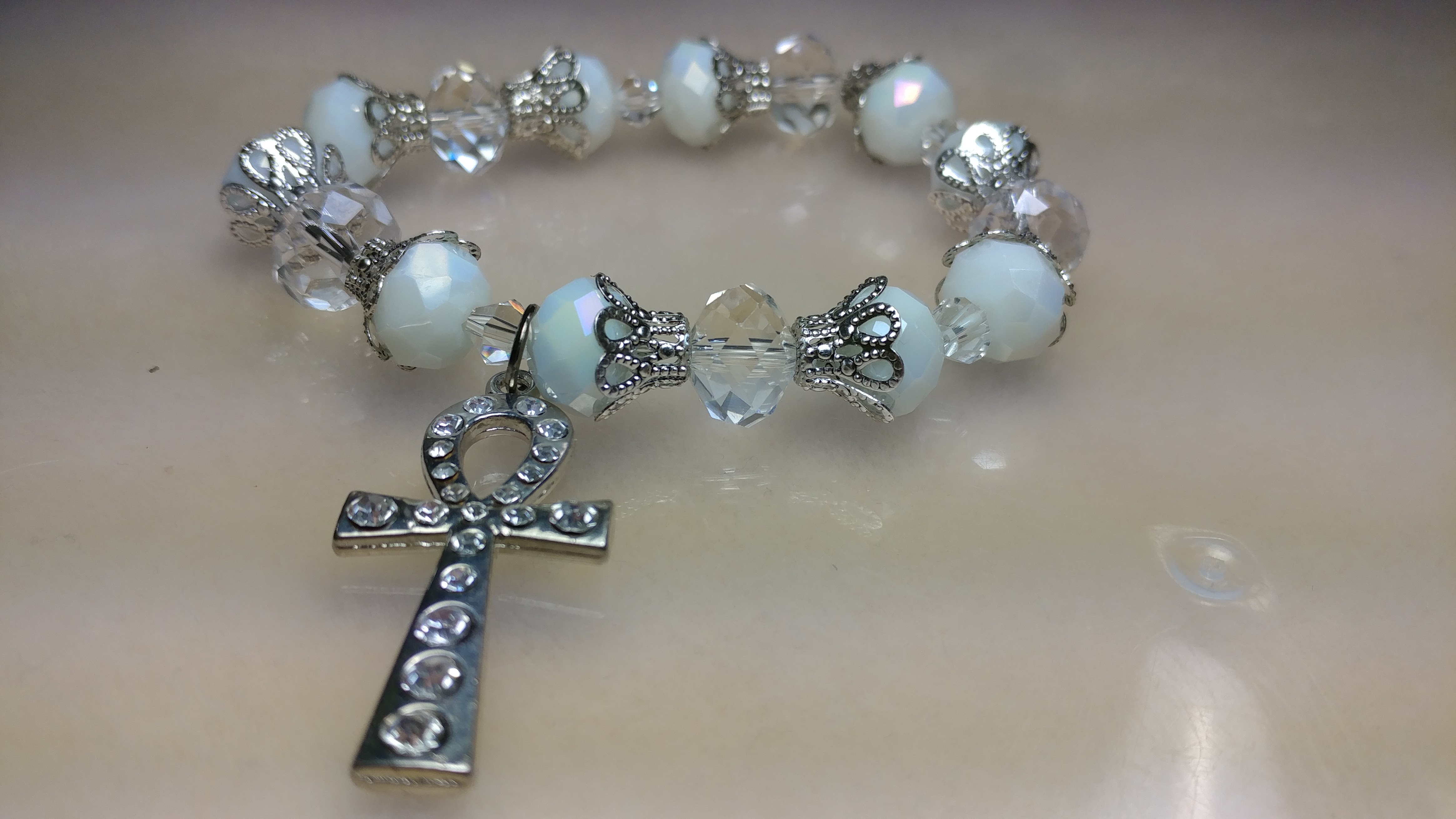 Handmade with white and clear glass bead with silver bead cones with a silver rhinestone ankh charm on a clear stretchy cord.