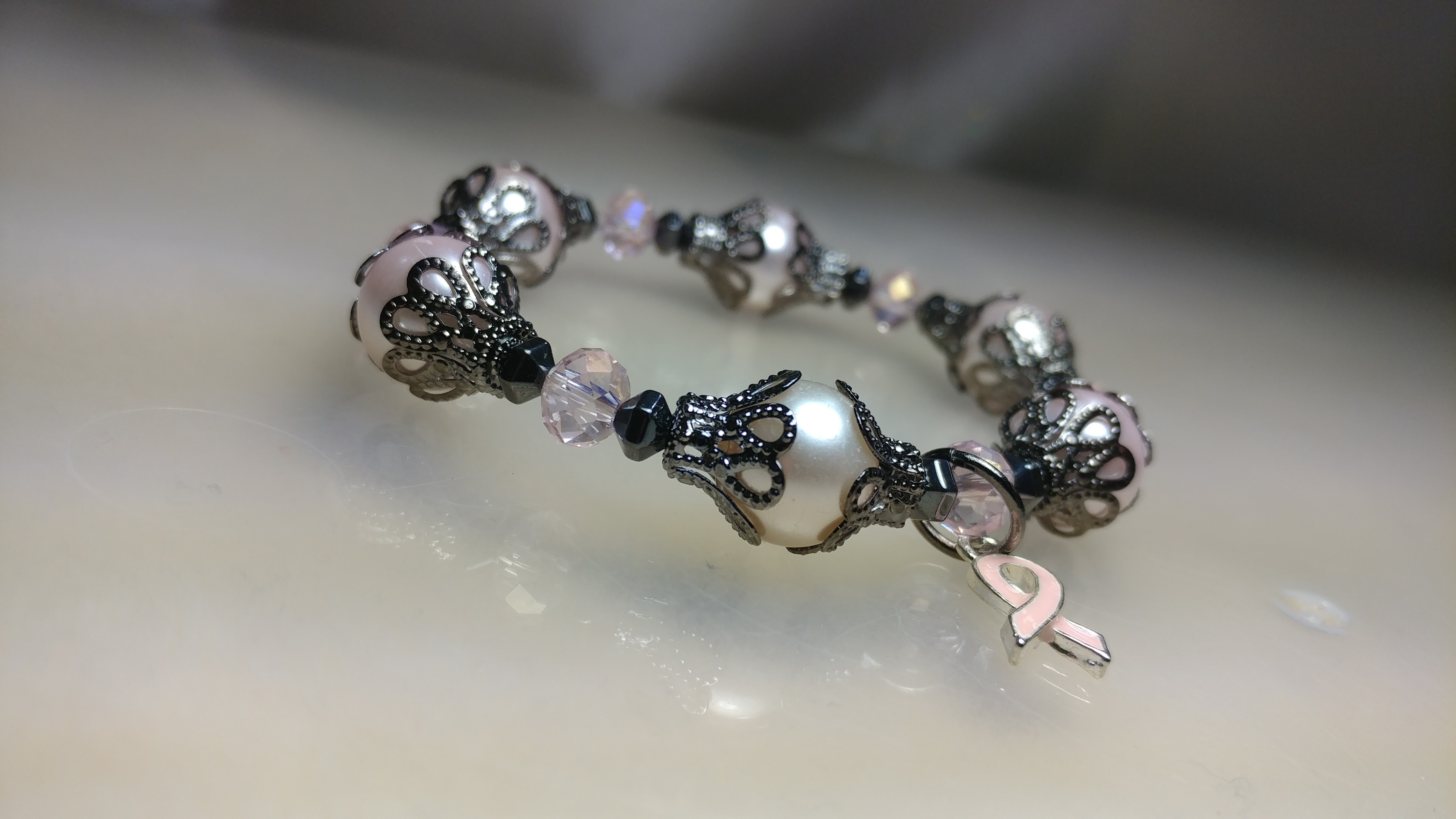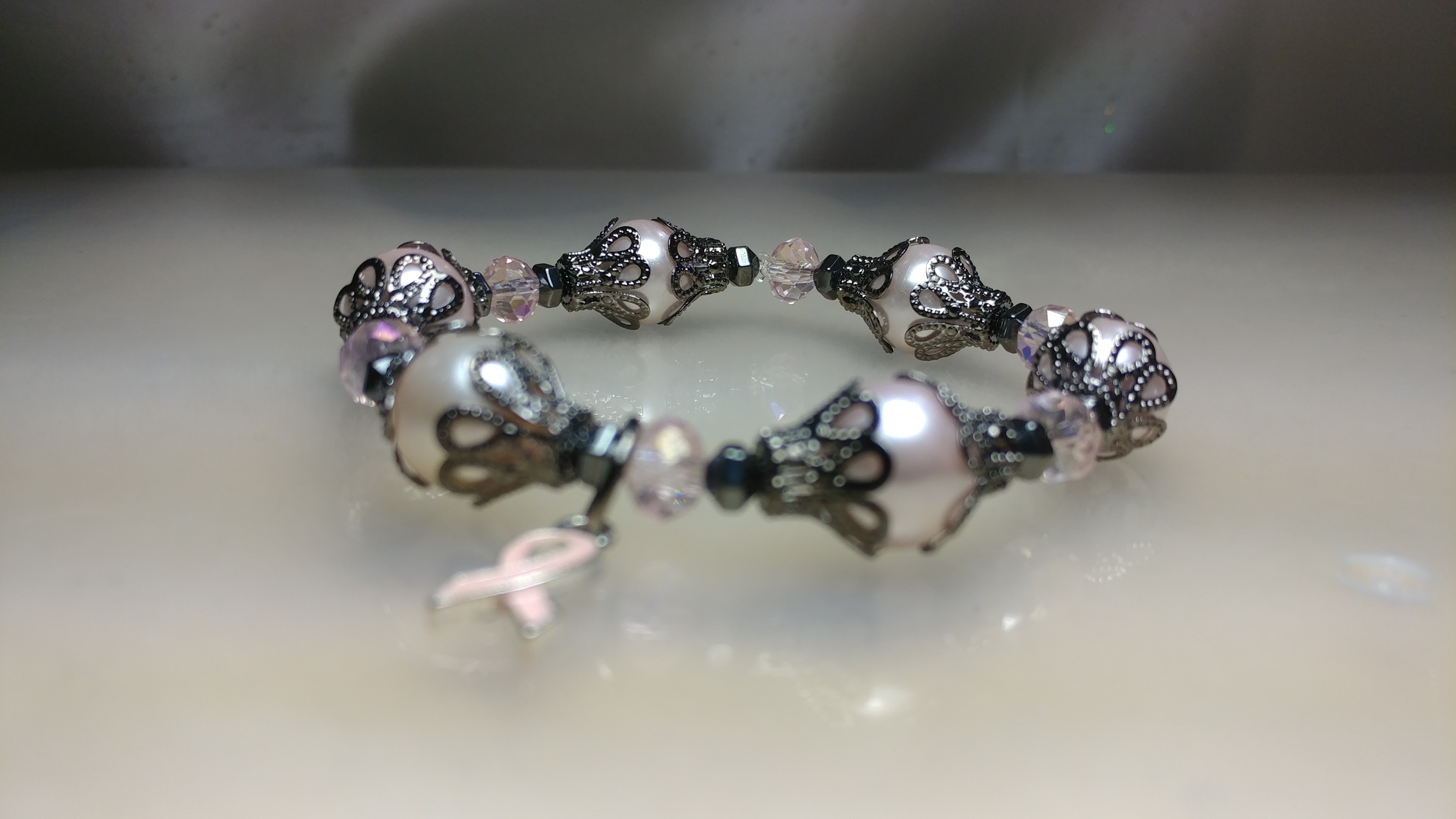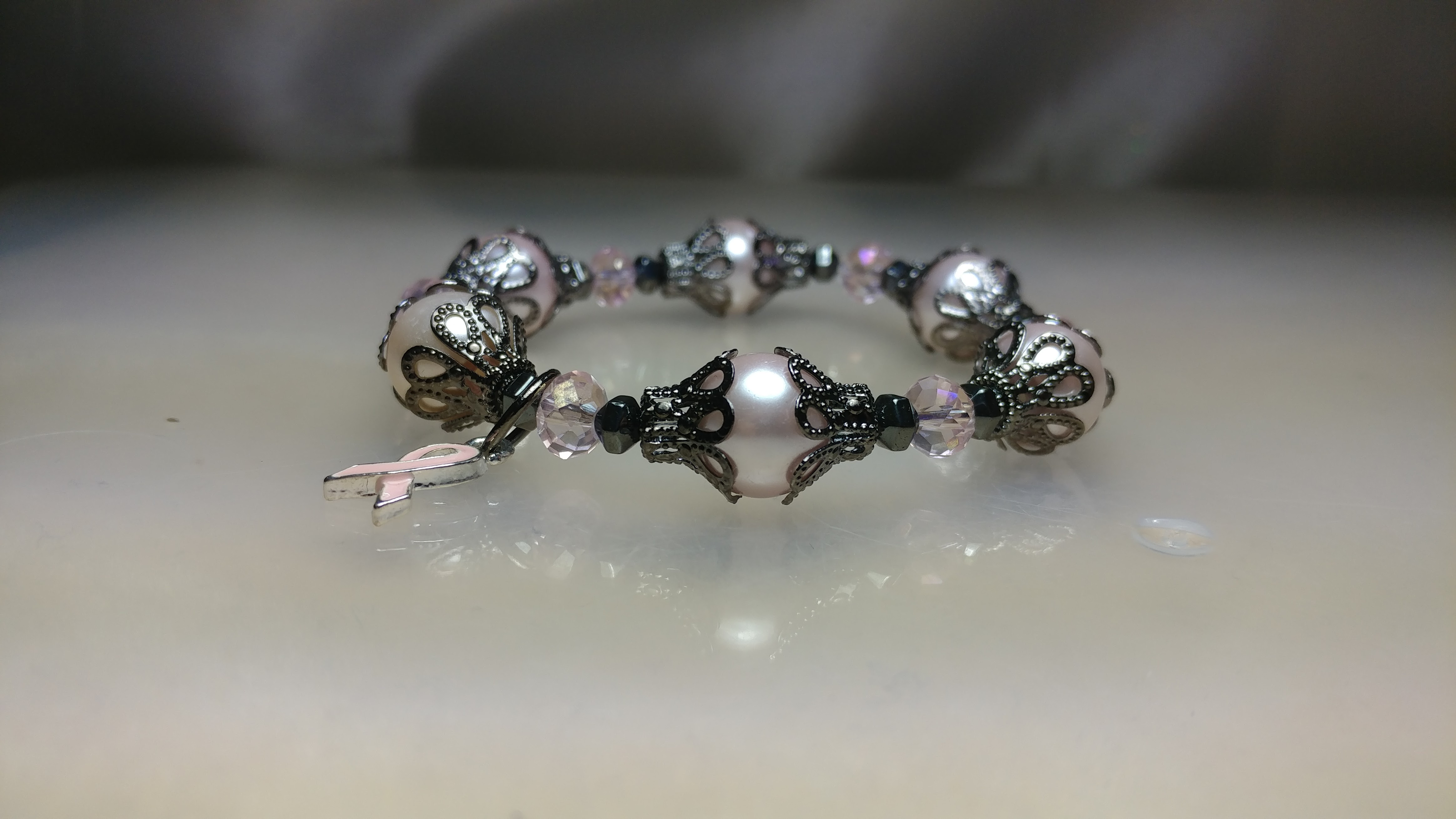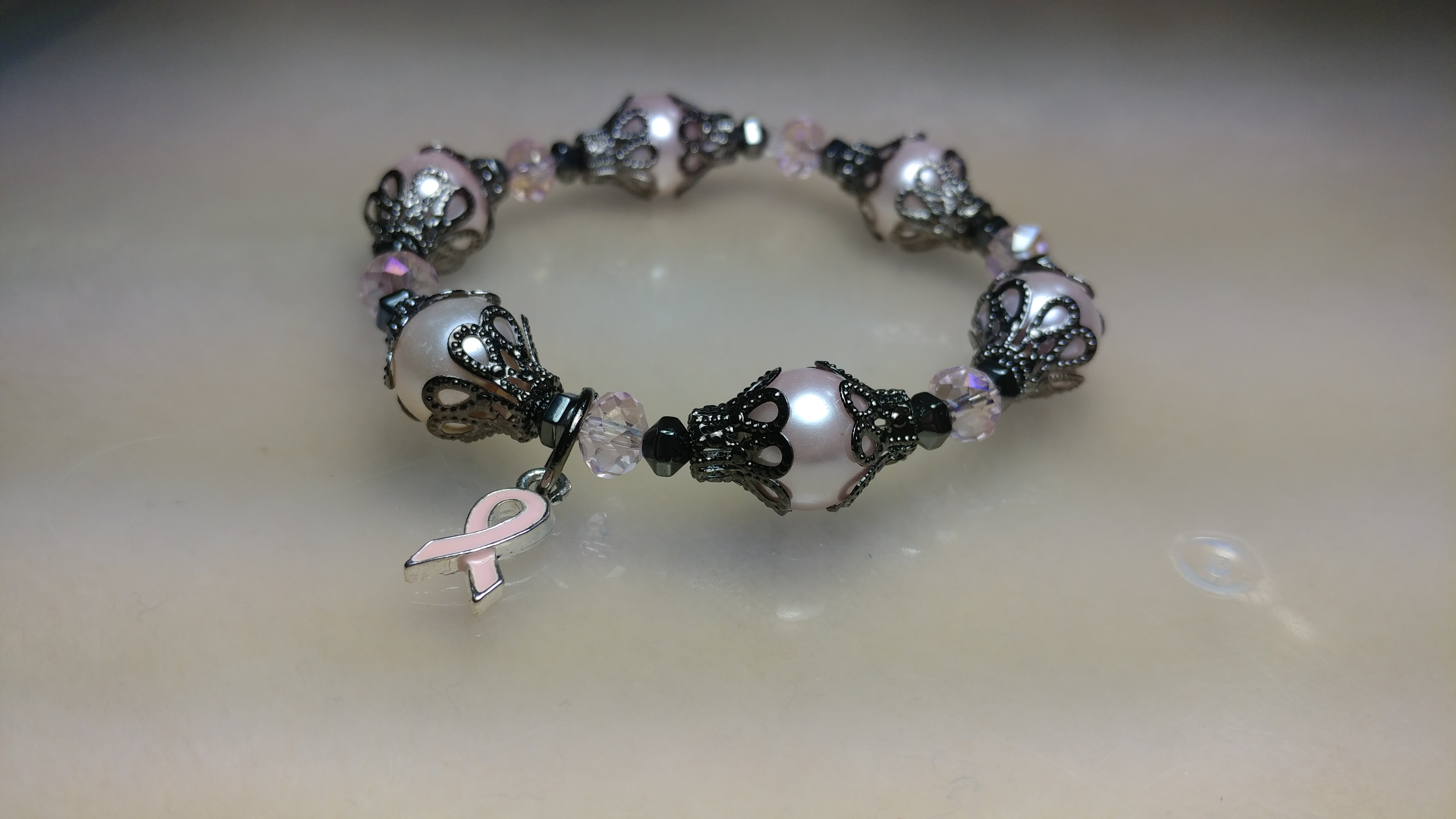 Handmade with pink pearl painted glass beads, pink glass beads, small hematite beads, with gunmetal bead cones, with a pink ribbon charm, with a clear stretchy cord.