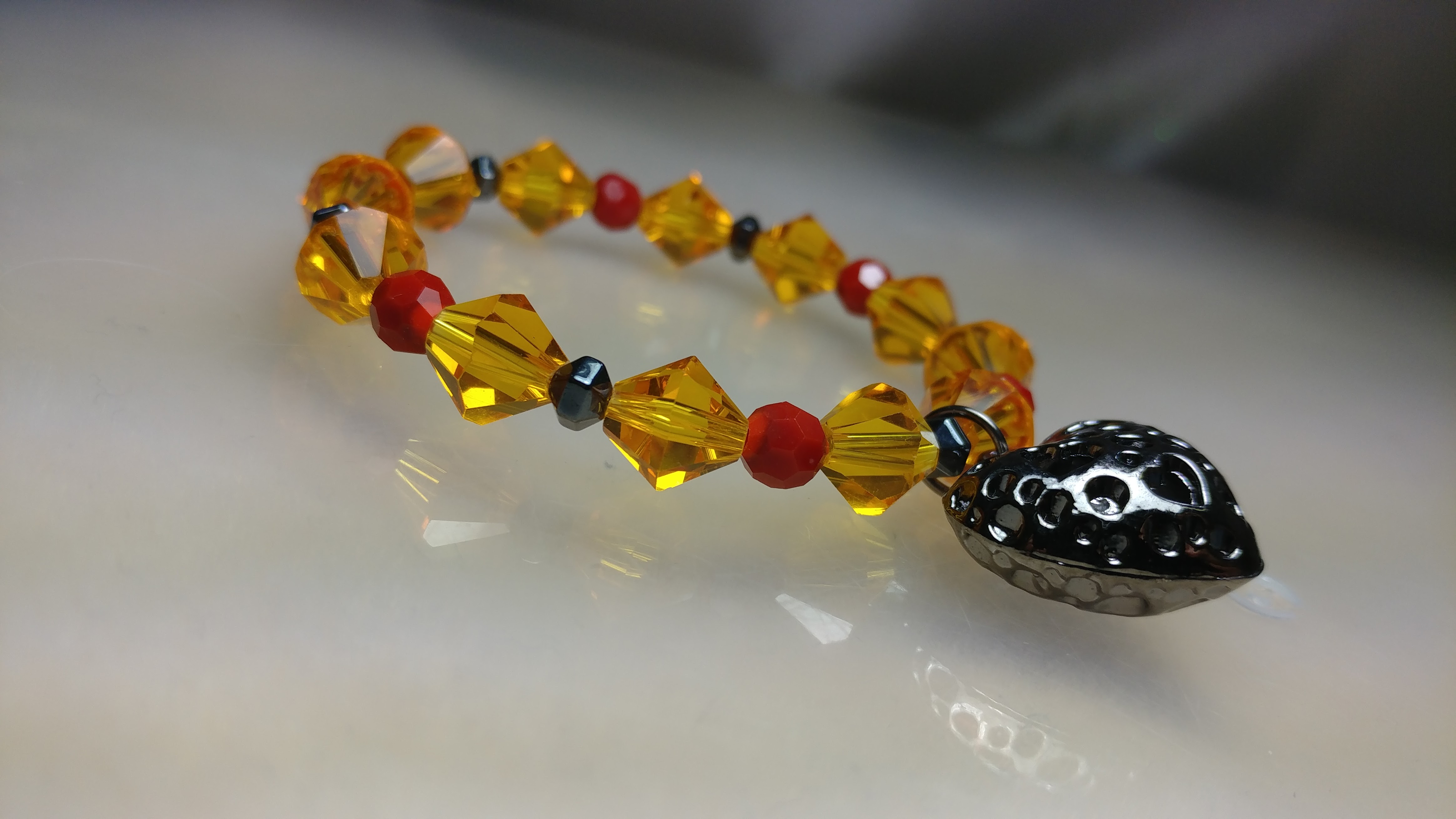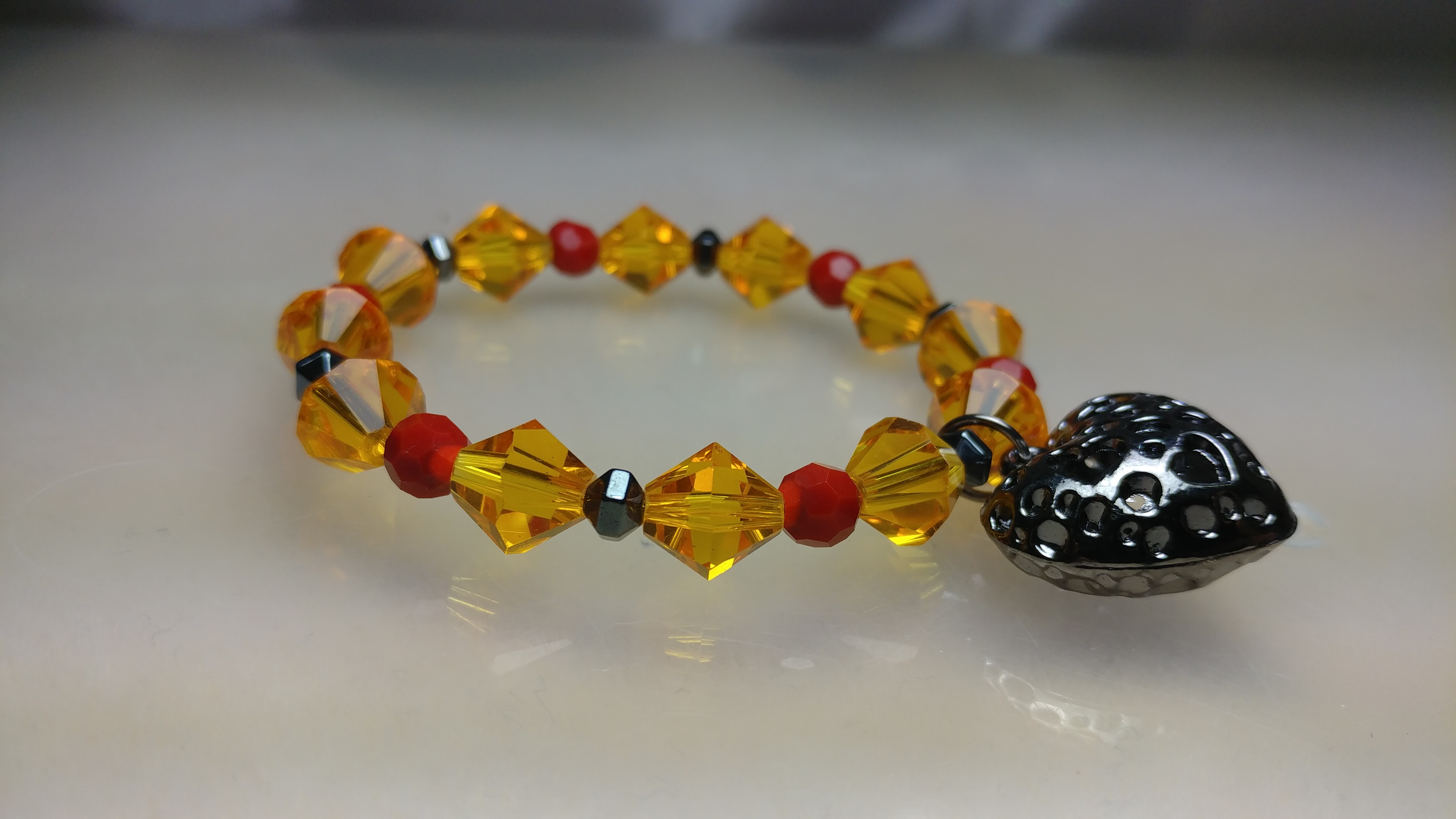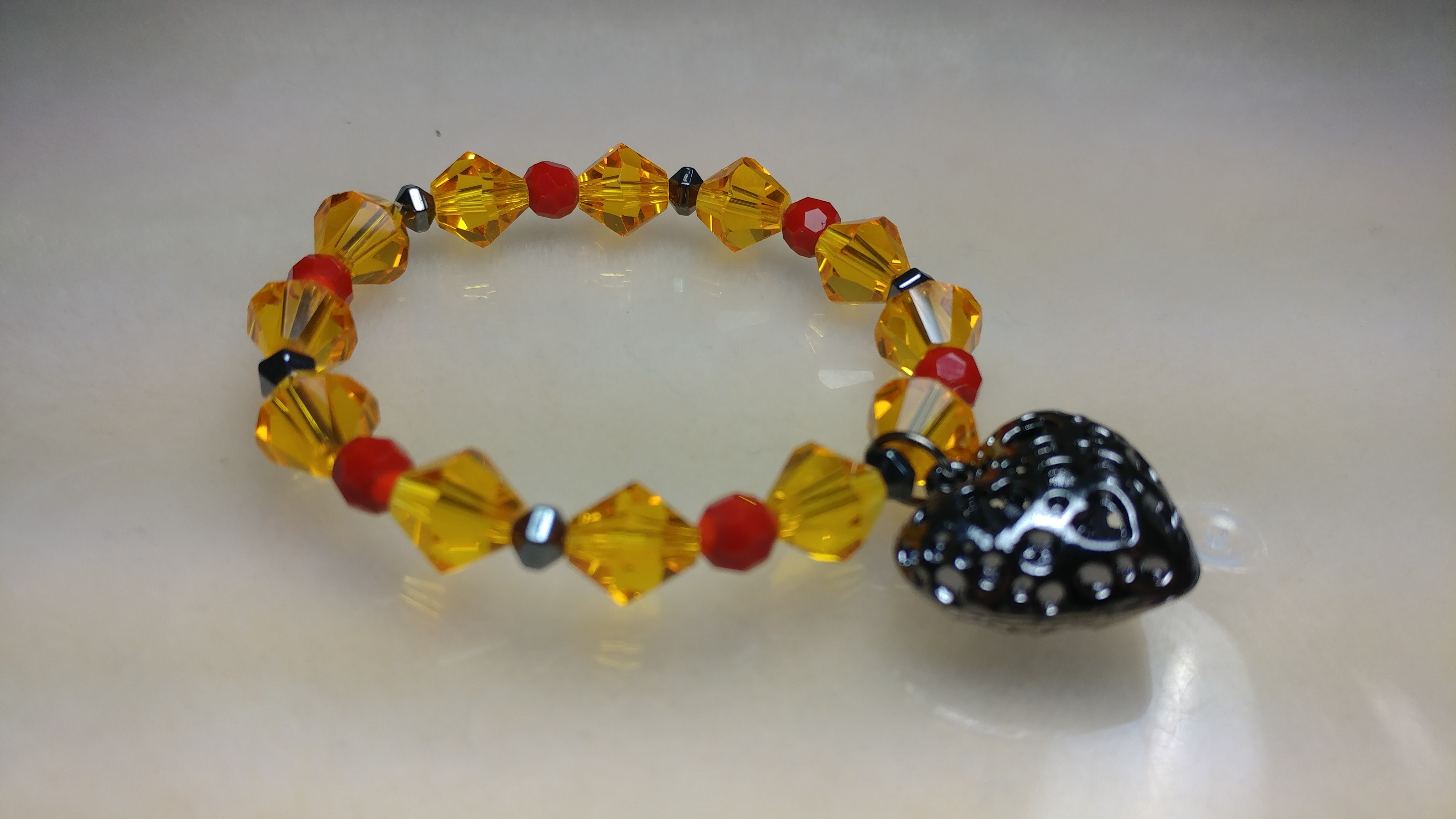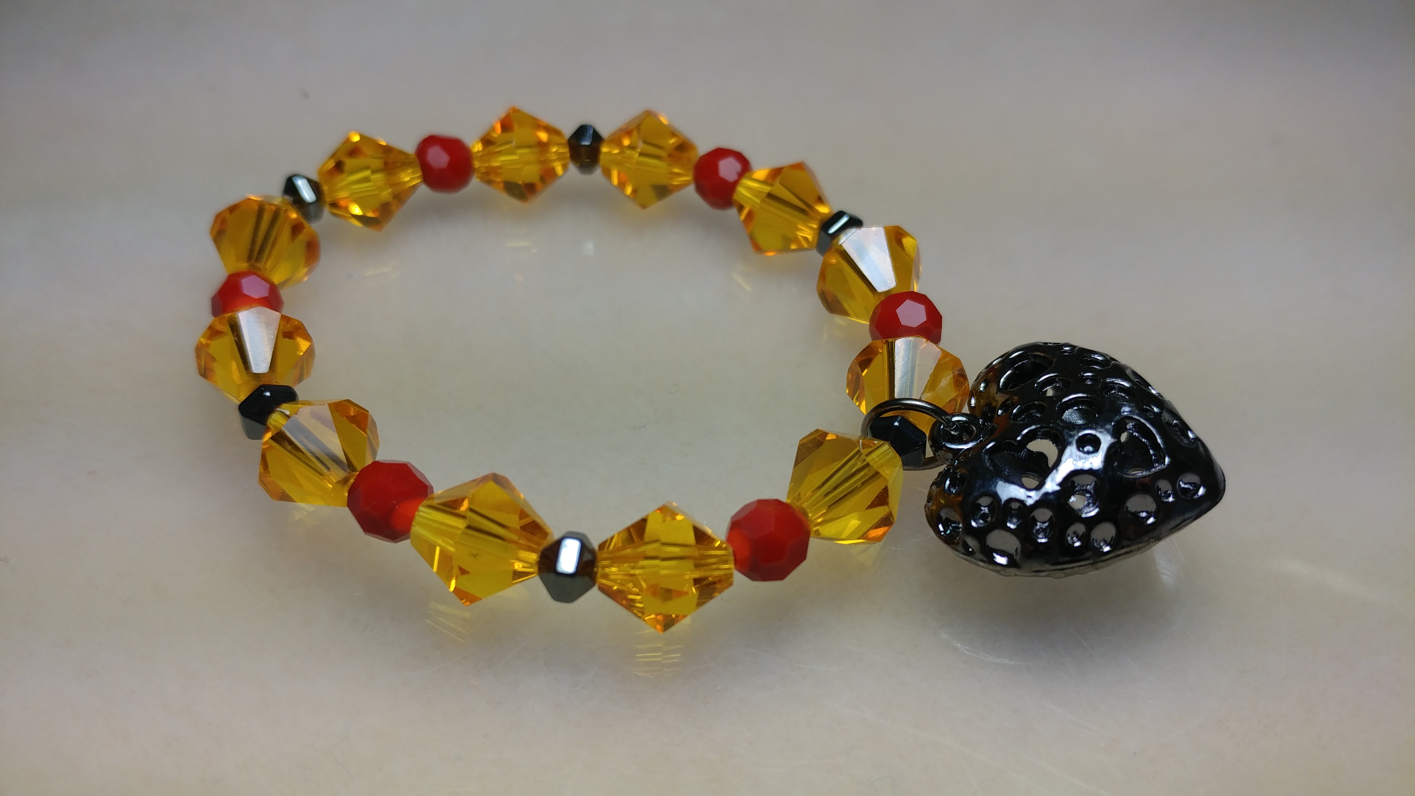 Handmade with yellow and red glass beads, spaced with small hematite beads with a gunmetal colored heart charm, place on a clear stretchy cord.