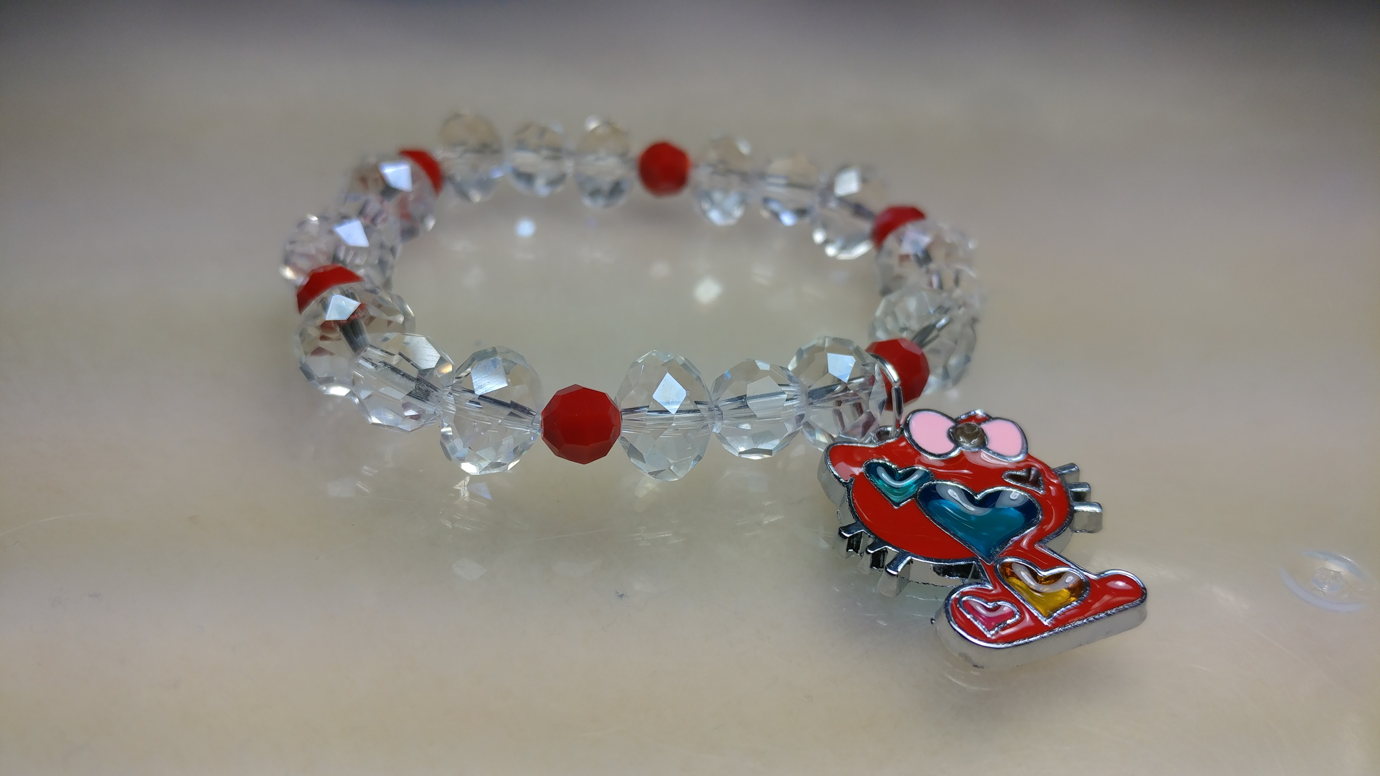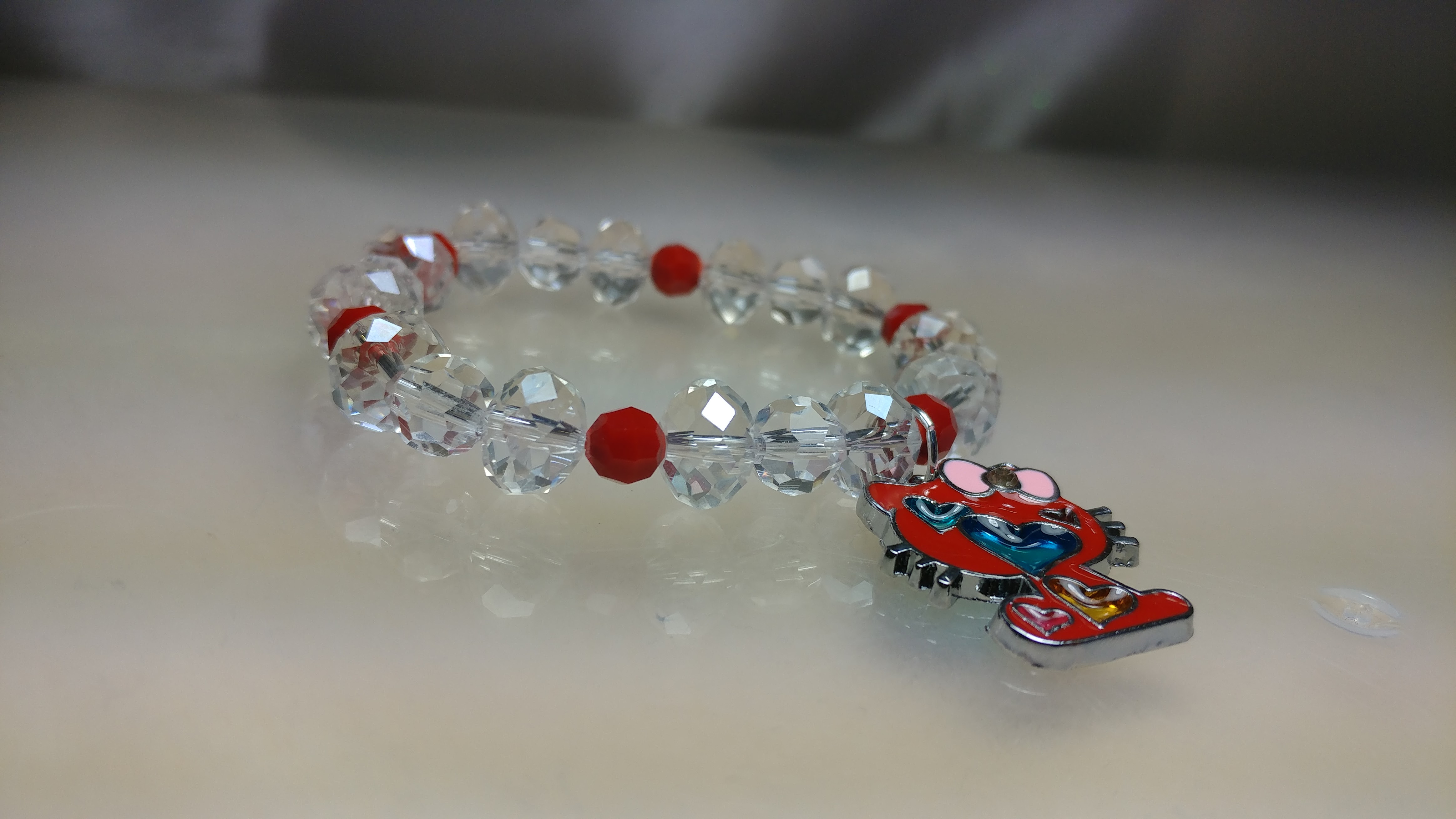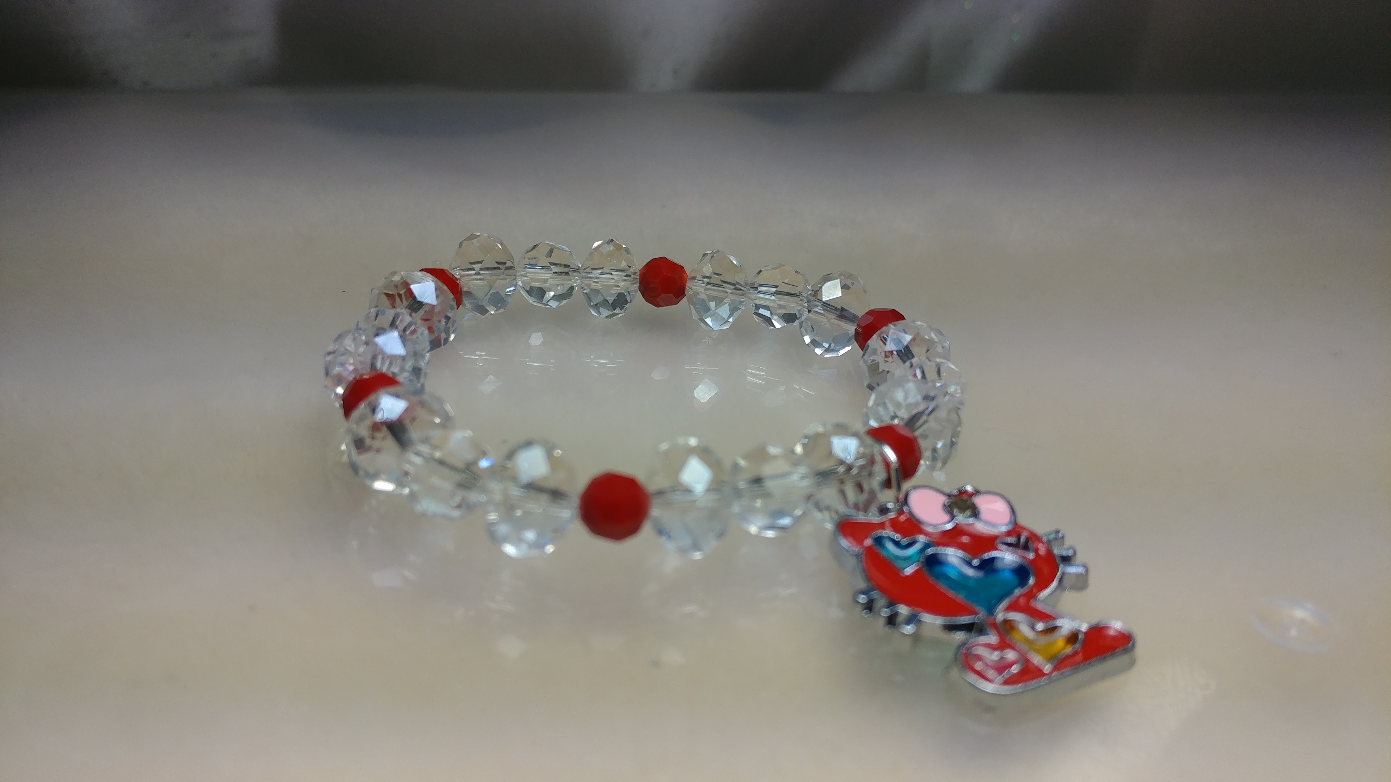 Handmade with clear and red glass beads, with a kitty cat charm, on a clear stretchy cord.