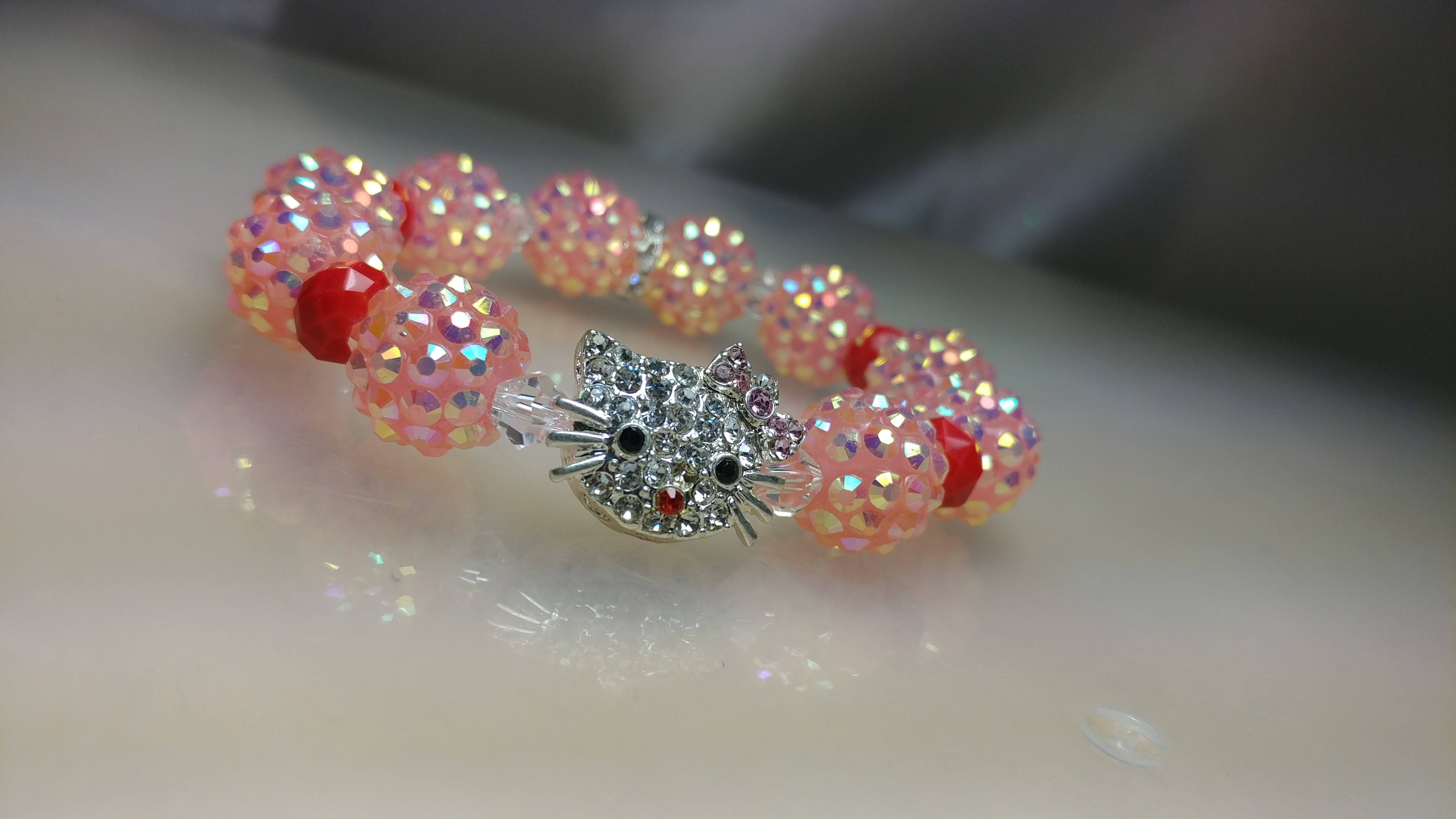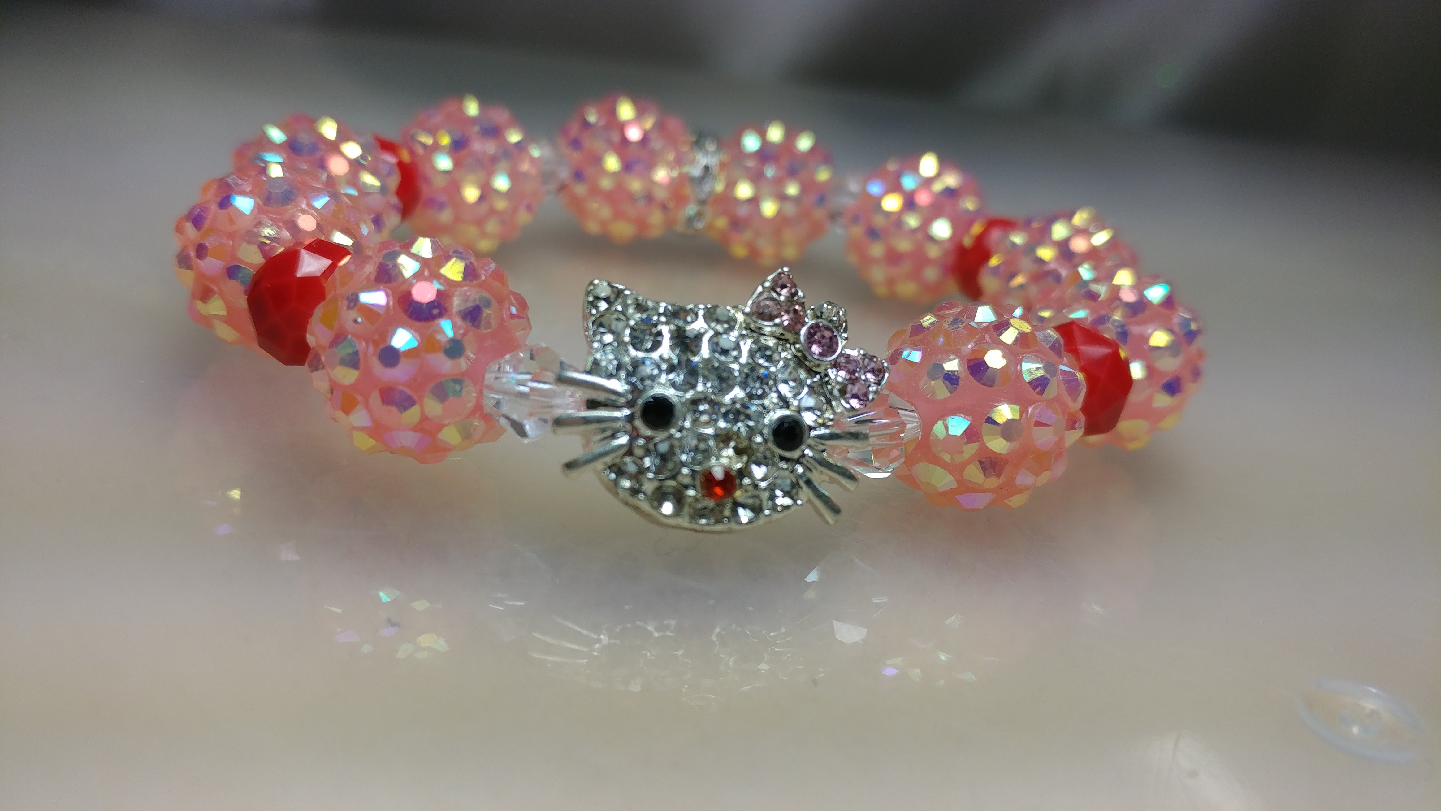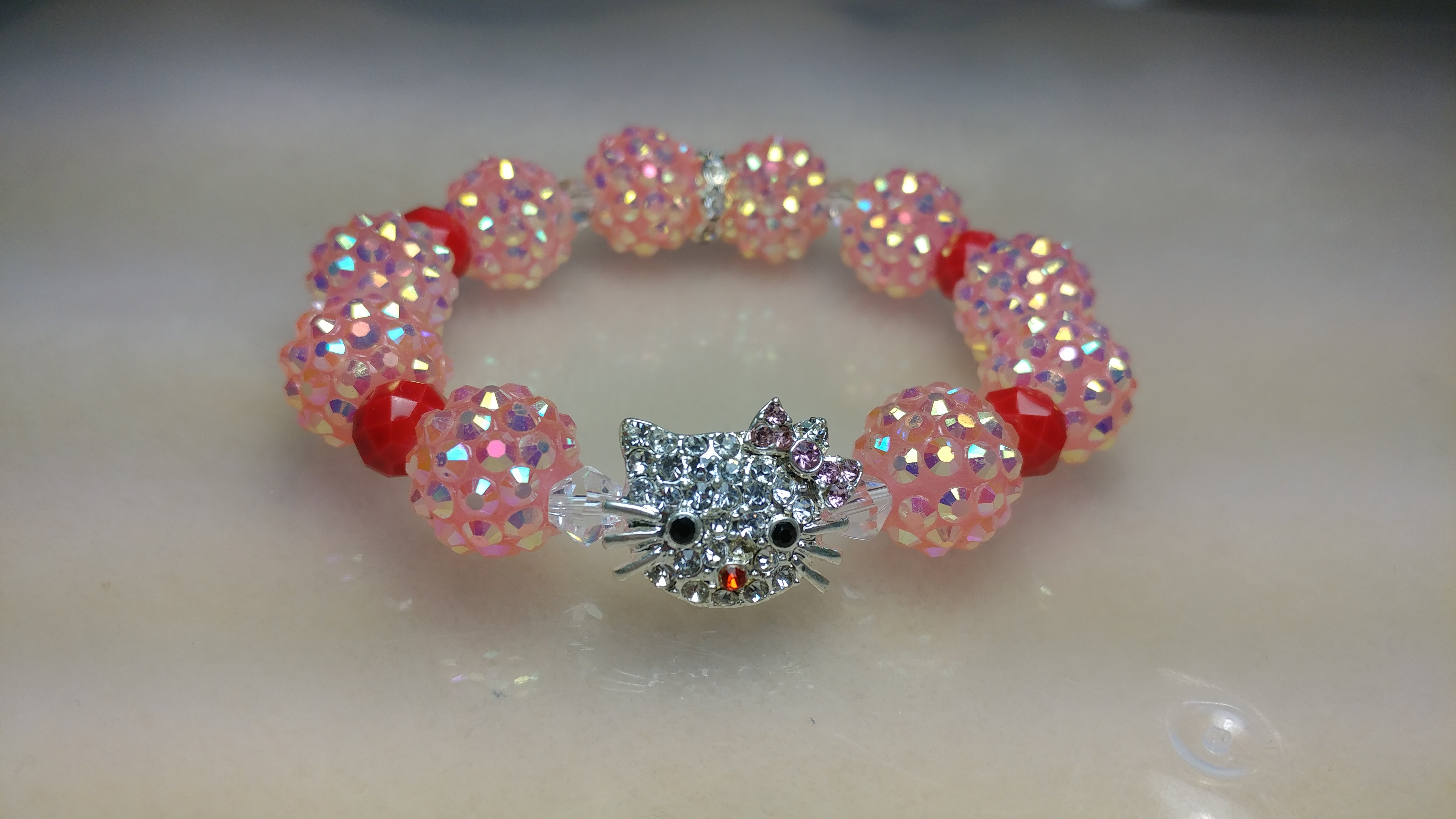 Handmade with pink acrylic pave beads, with a kitty cat charm spacer, on a clear stretchy cord.