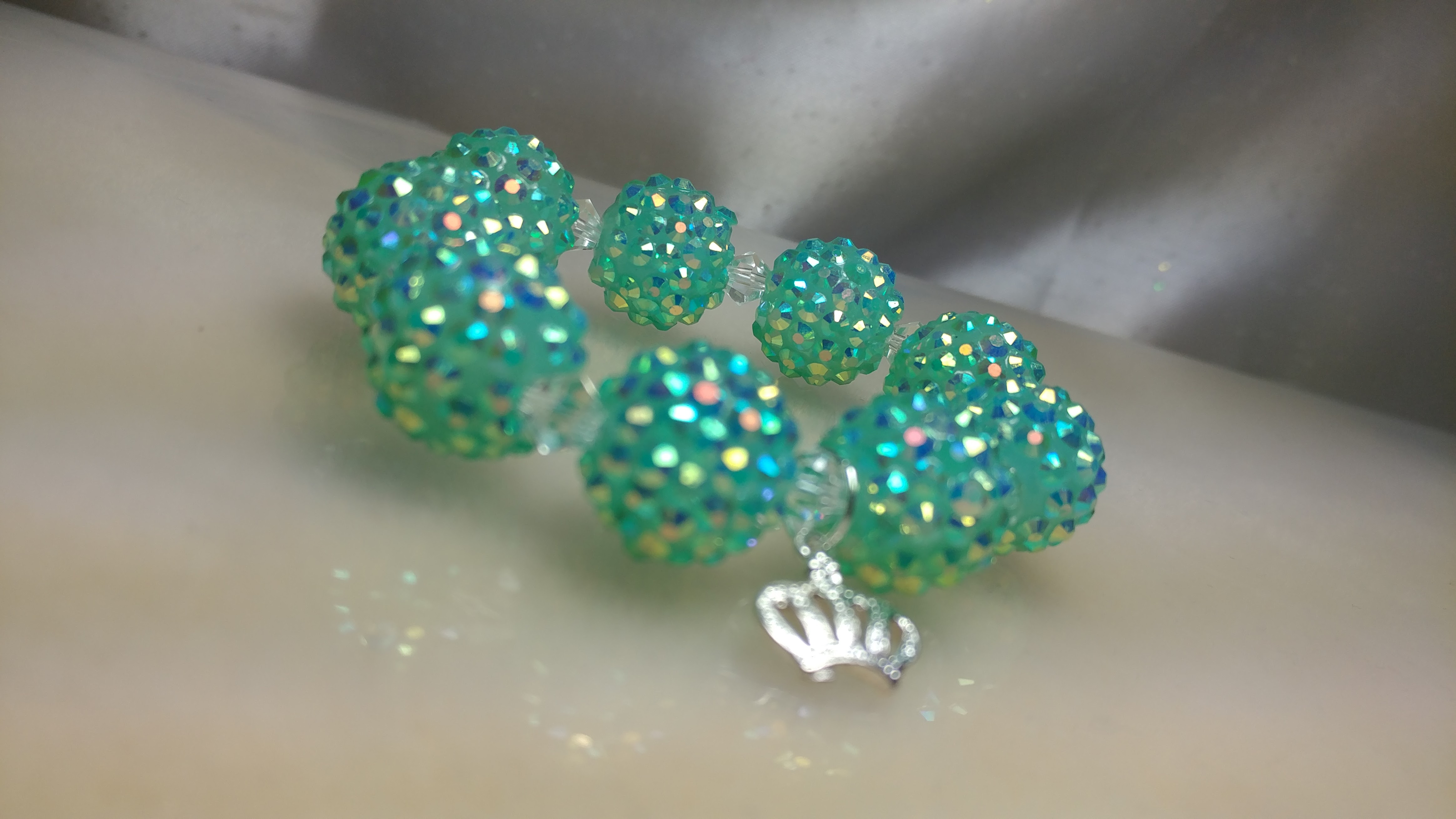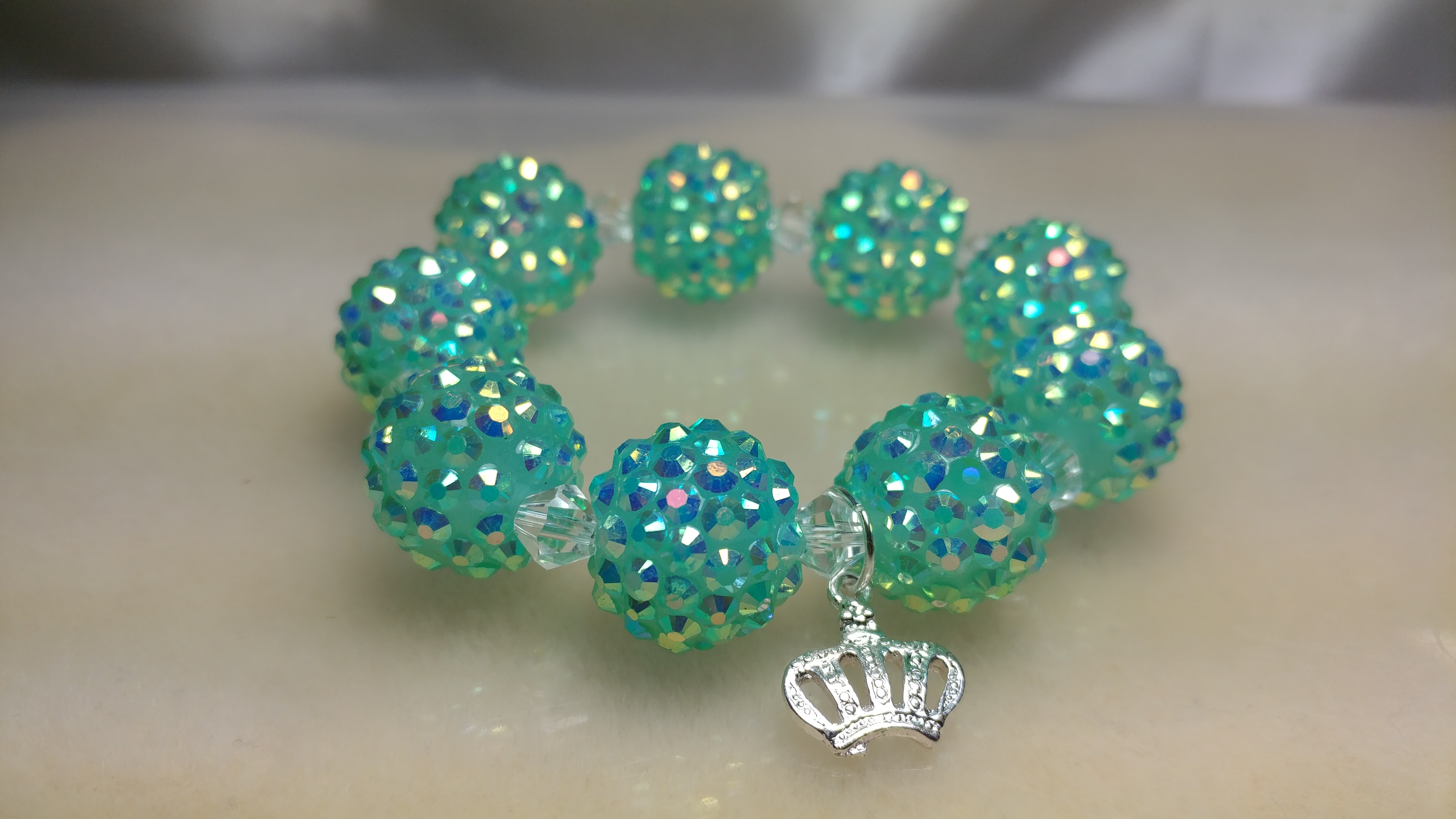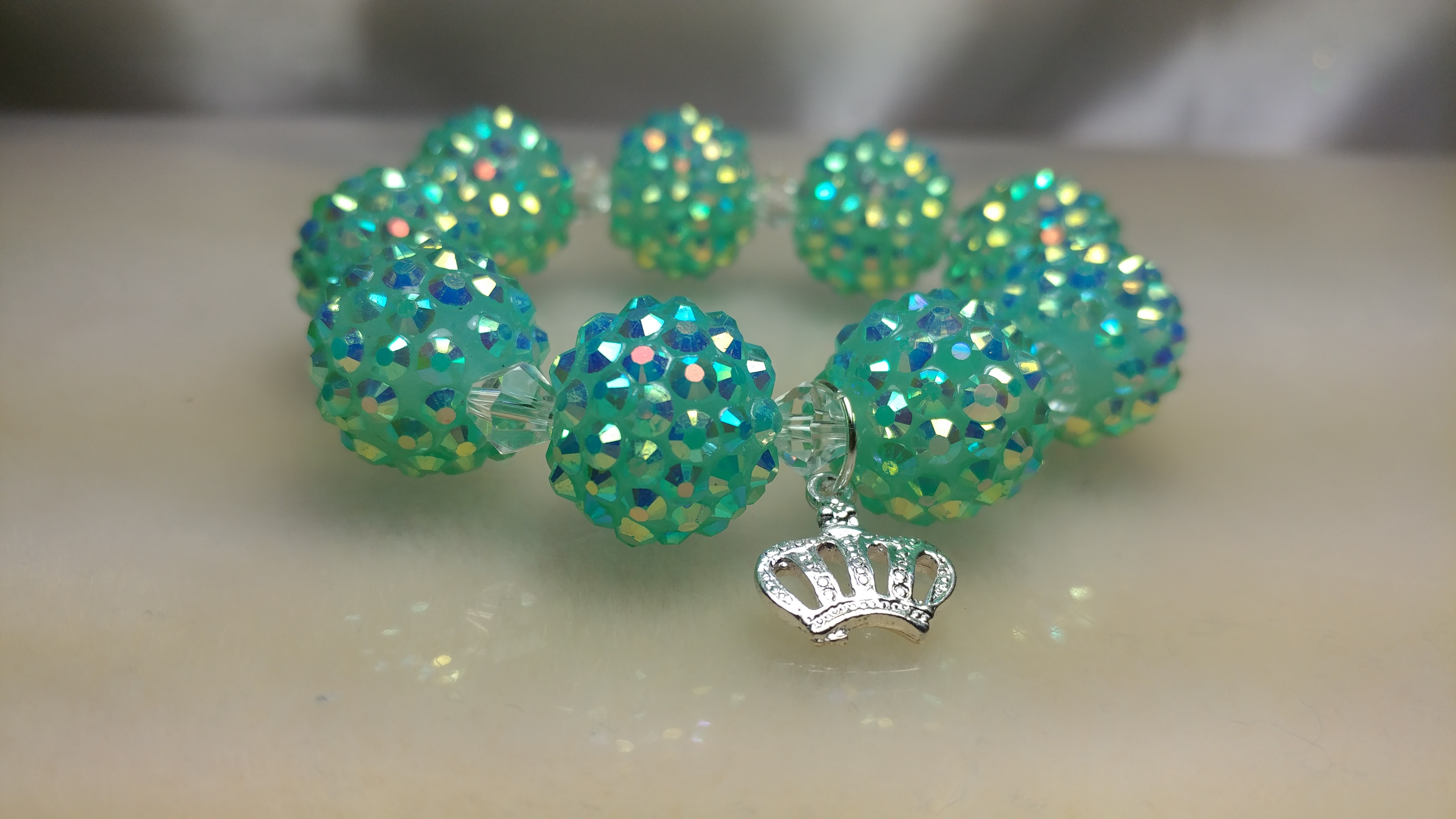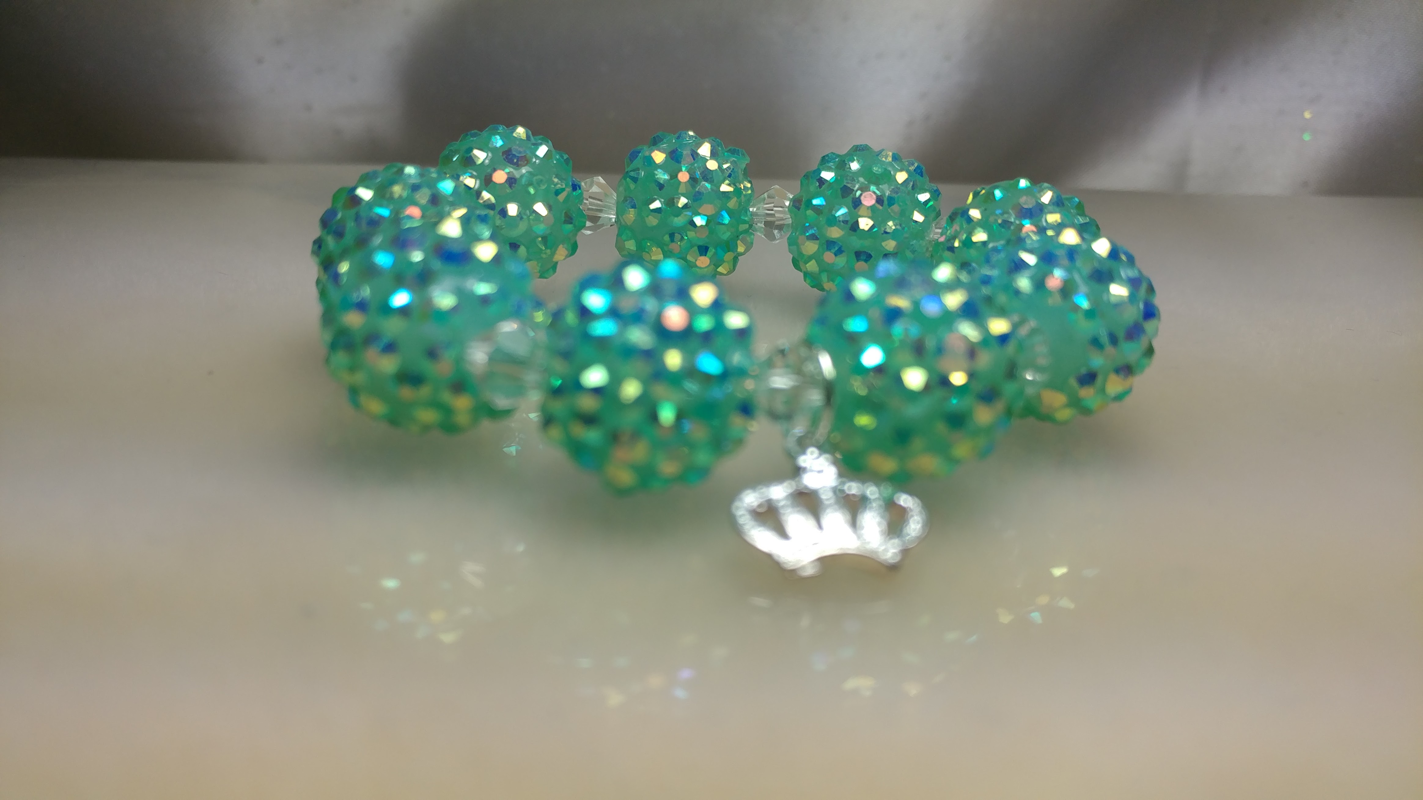 Made with lovely teal acrylic disco ball beads, clear glass beads, accented with a cute crown charm on a clear stretchy cord.