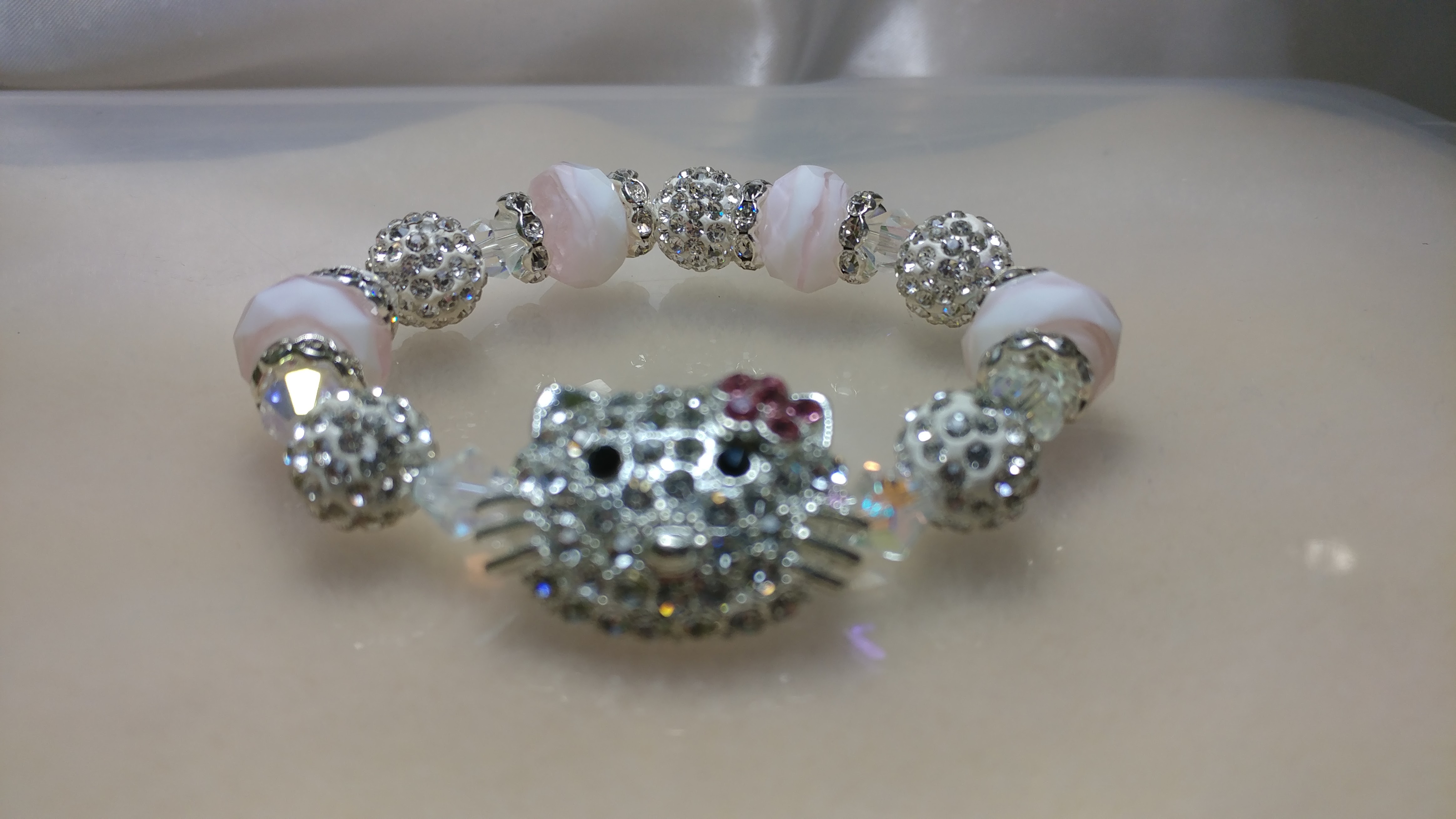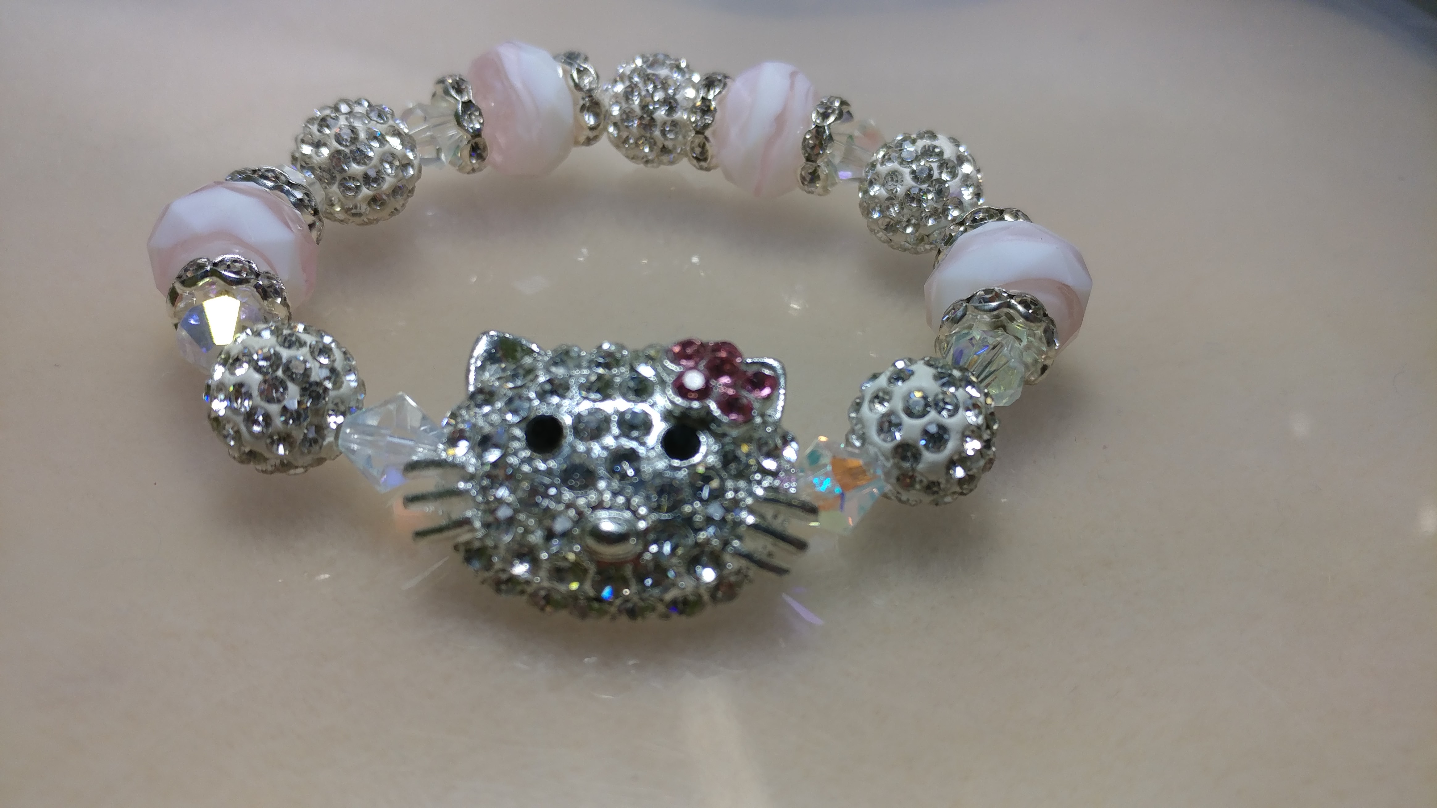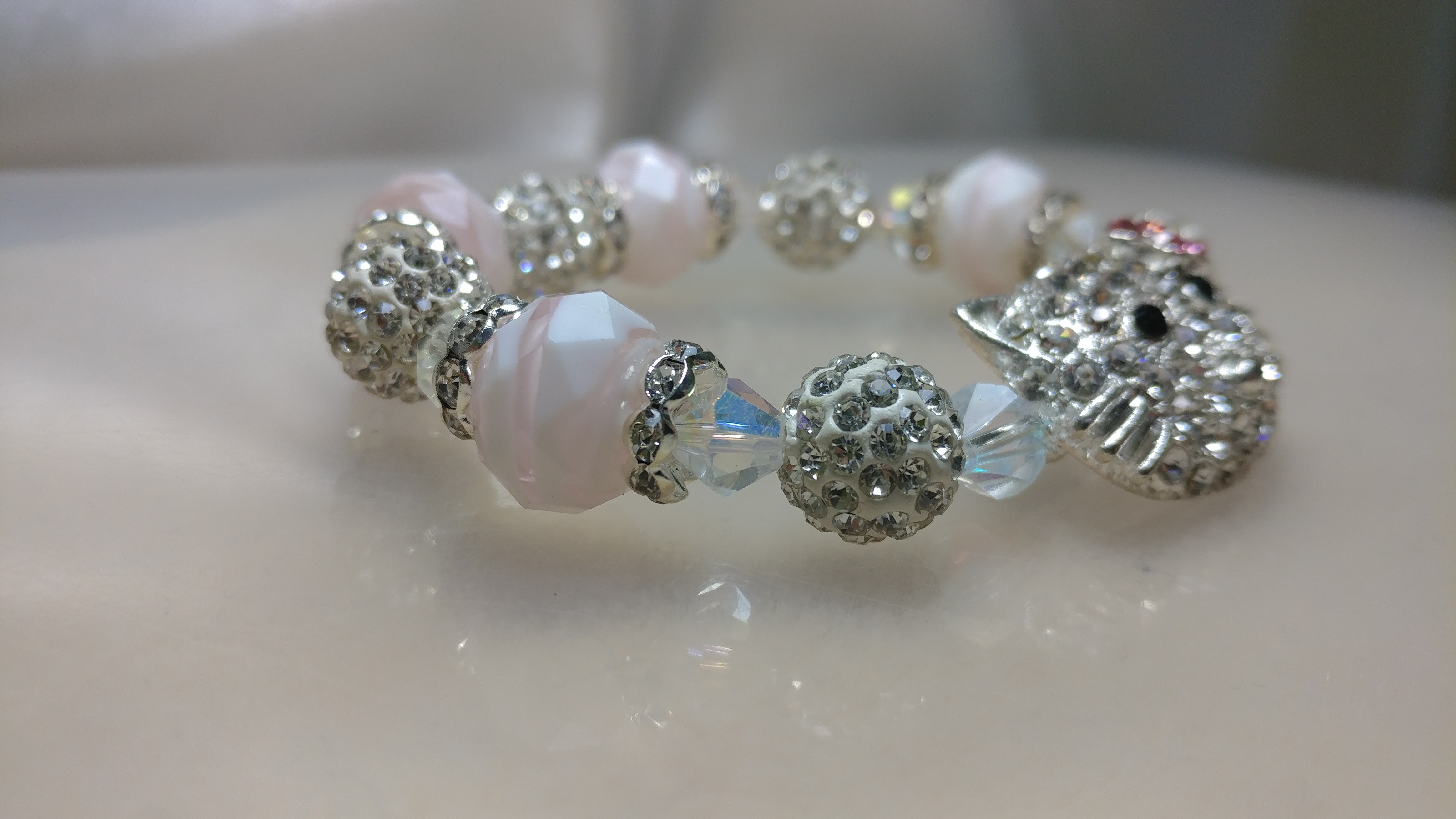 Made with a Kitty faced rhinestone connector space with rhinestone spacers bead paired with glass gemstone beads placed on a clear stretchy cord.