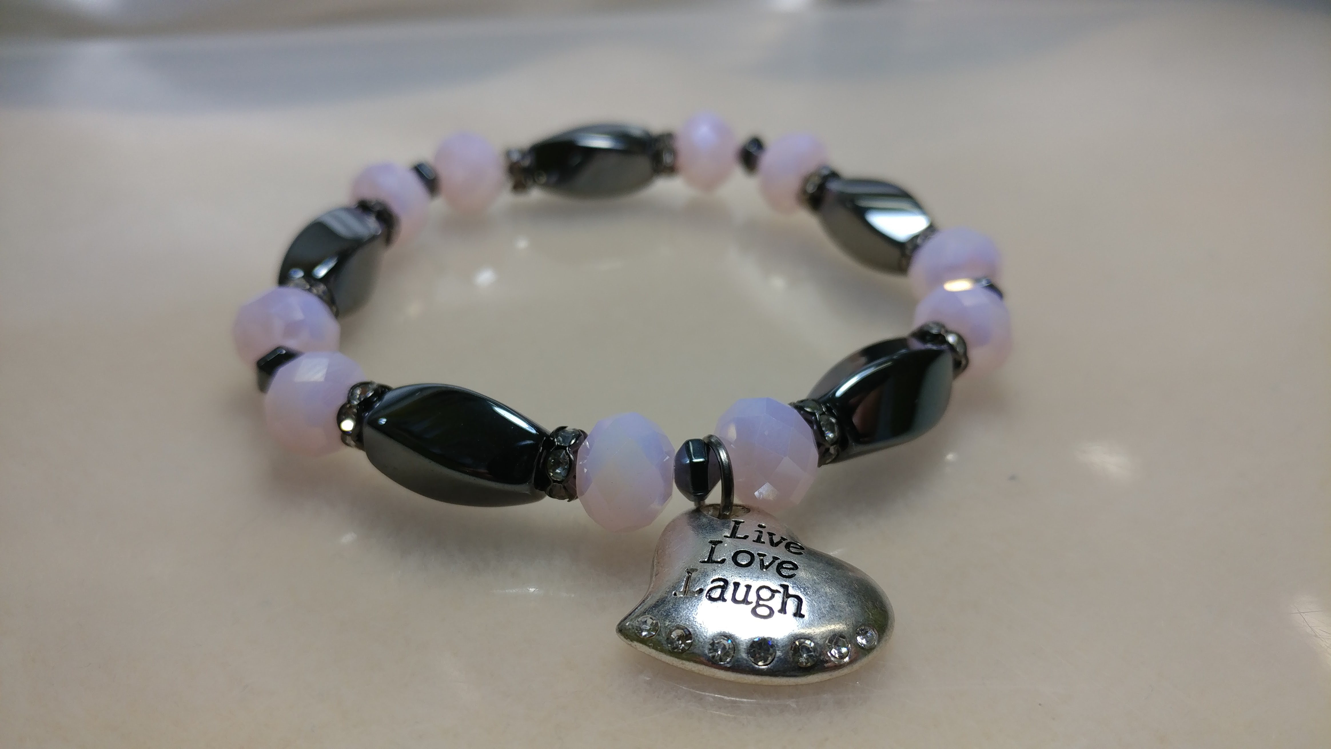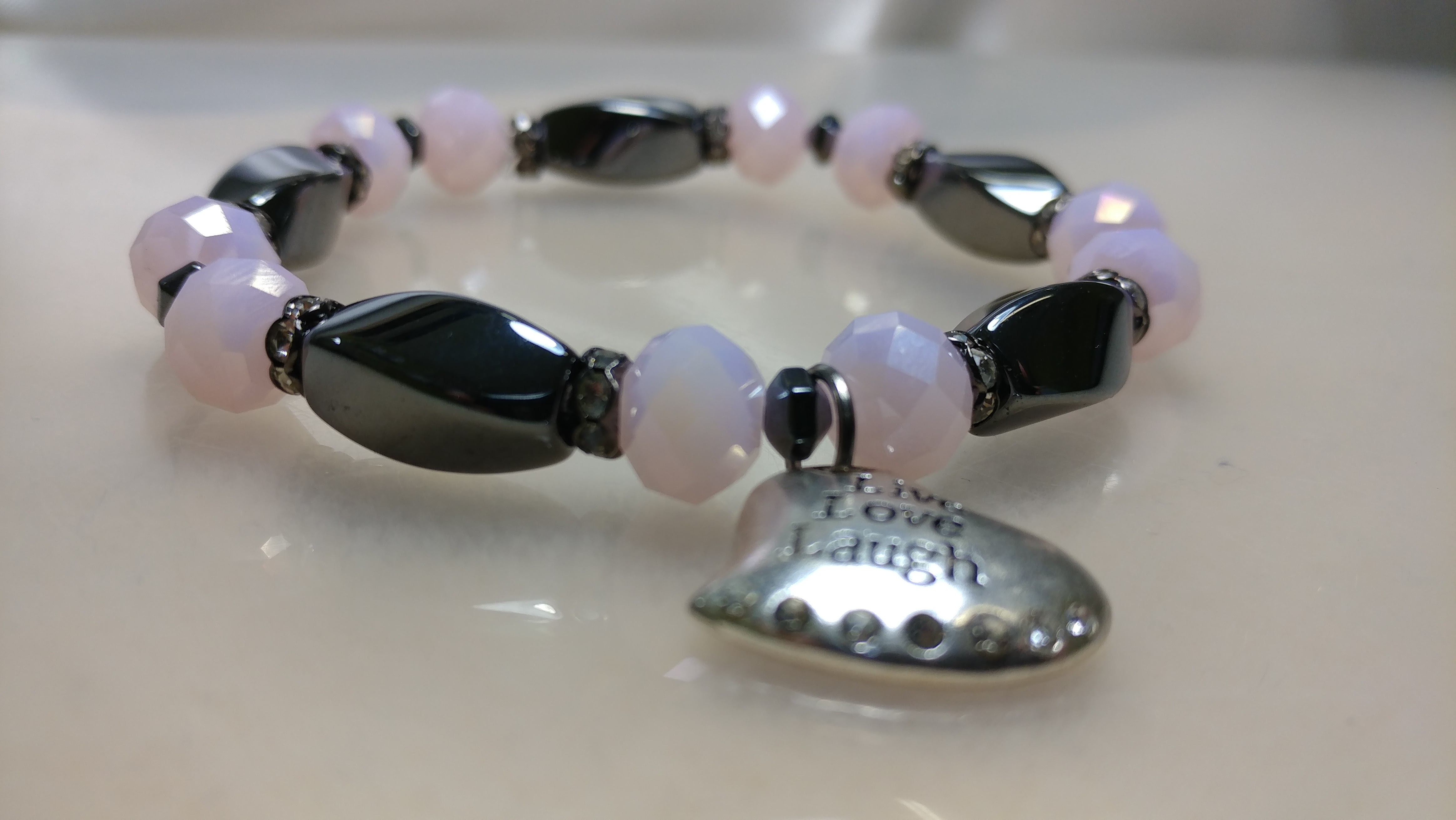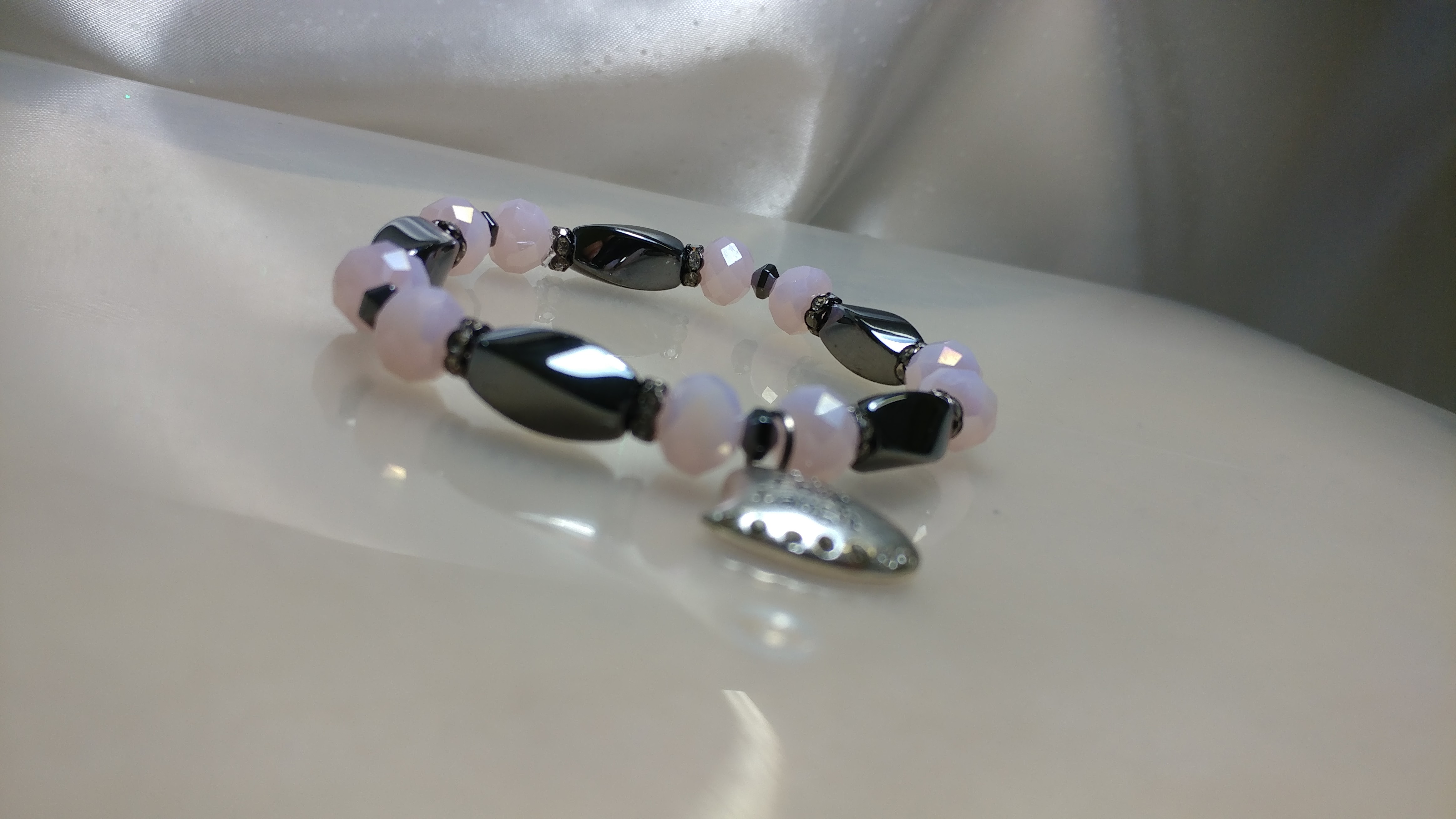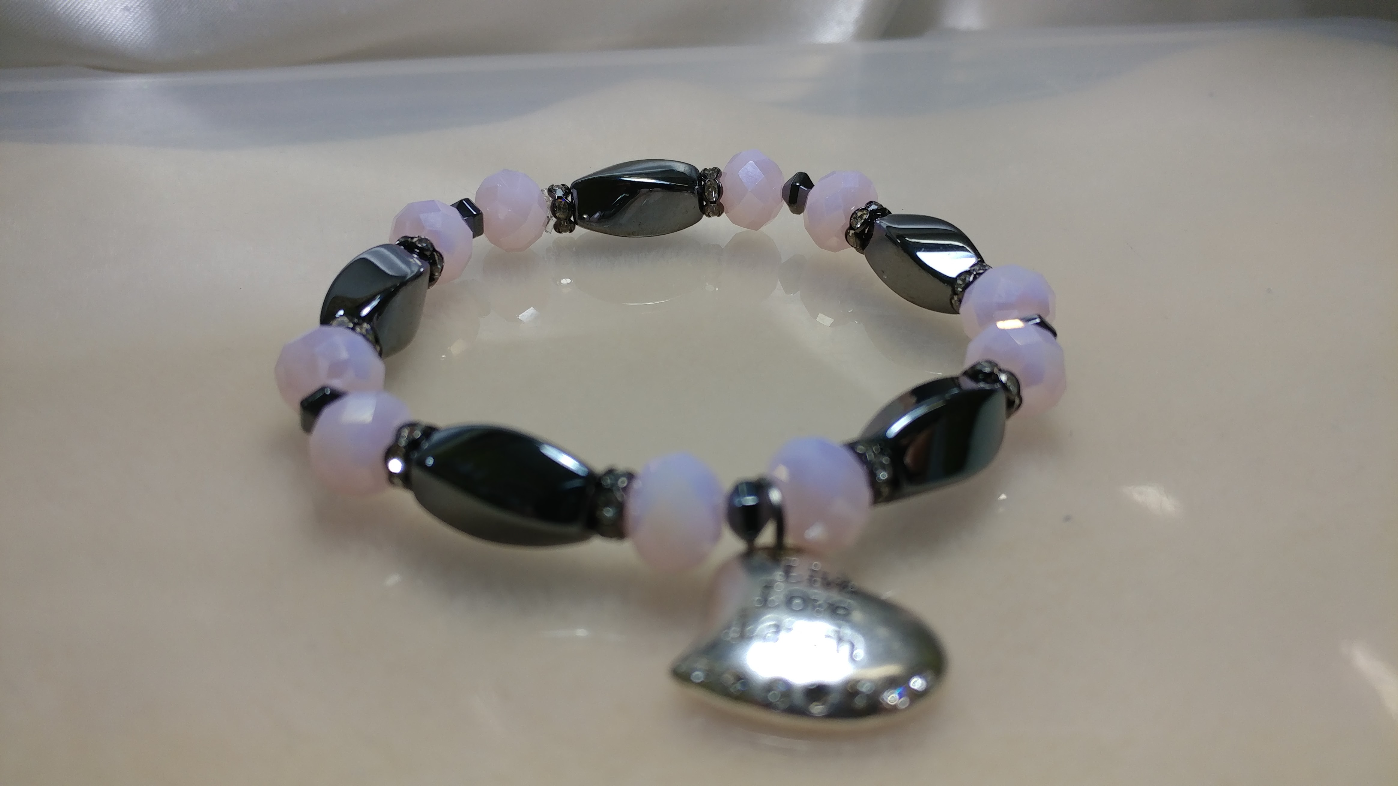 Handmade, with pink glass crystals beads, hematite beads, and rhinestone spacer beads with a silver heart charm on a clear stretchy cord.