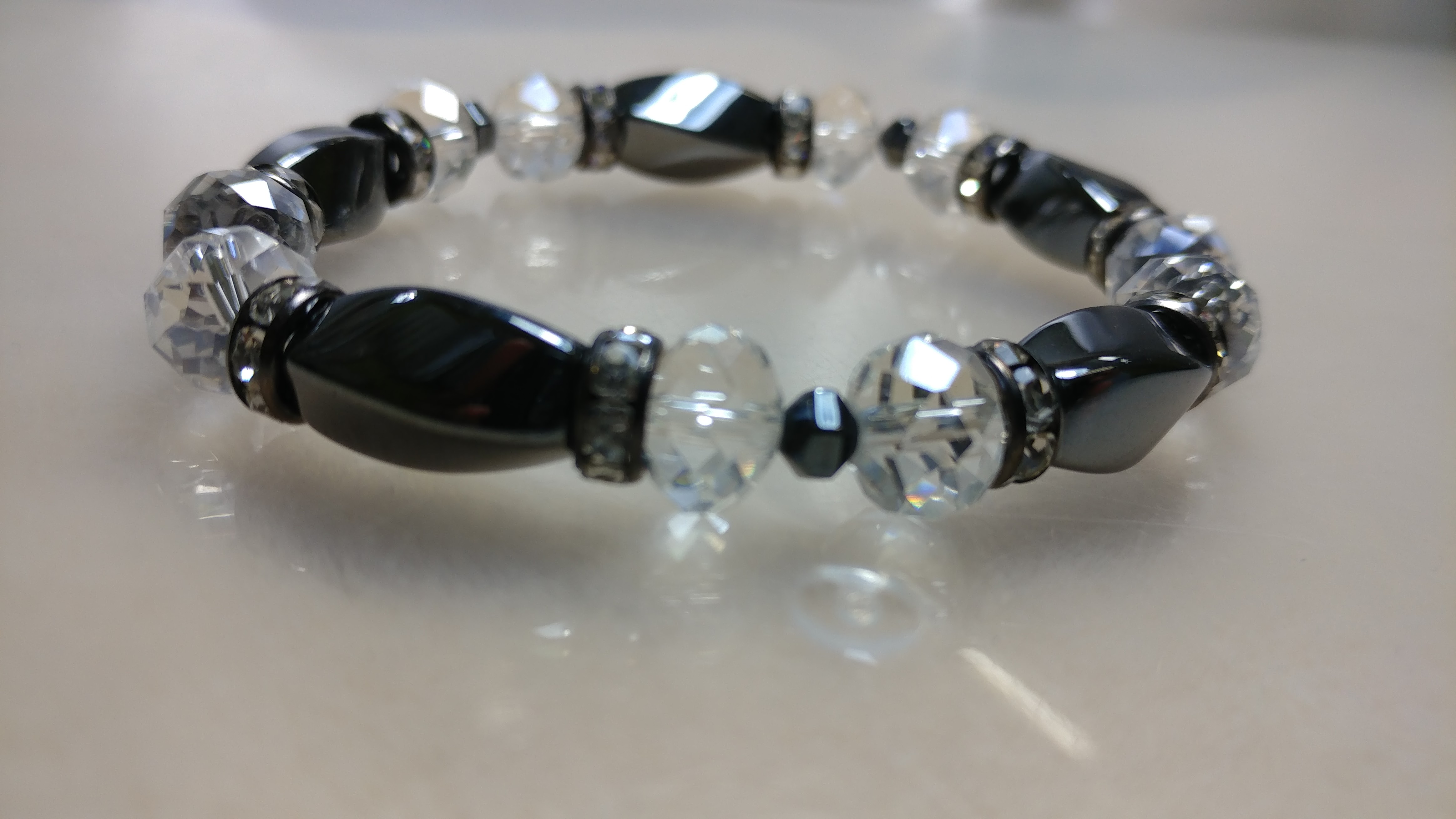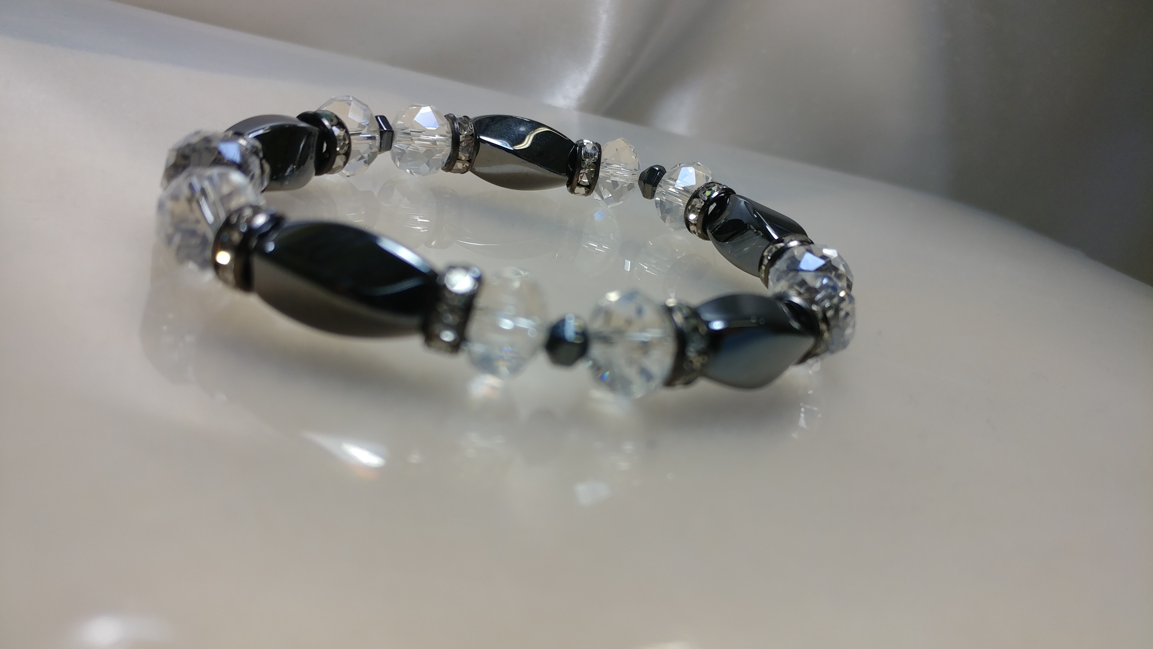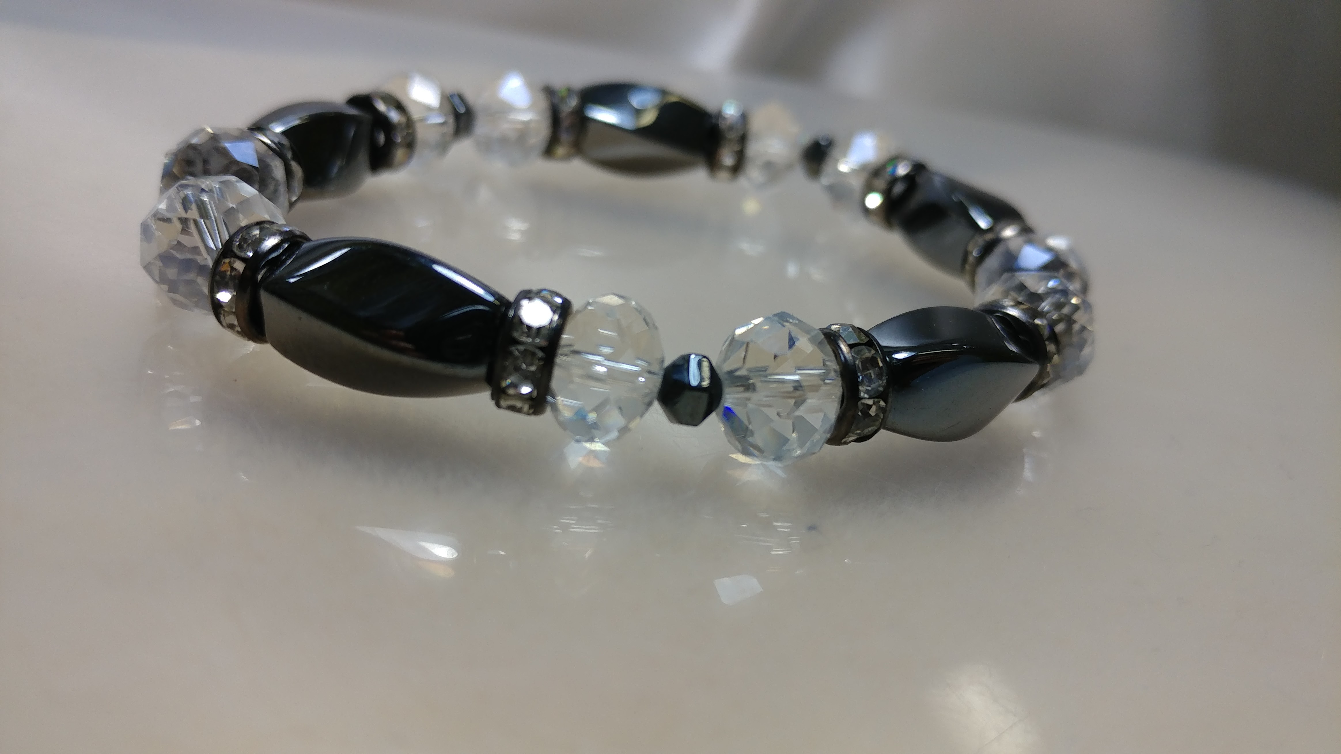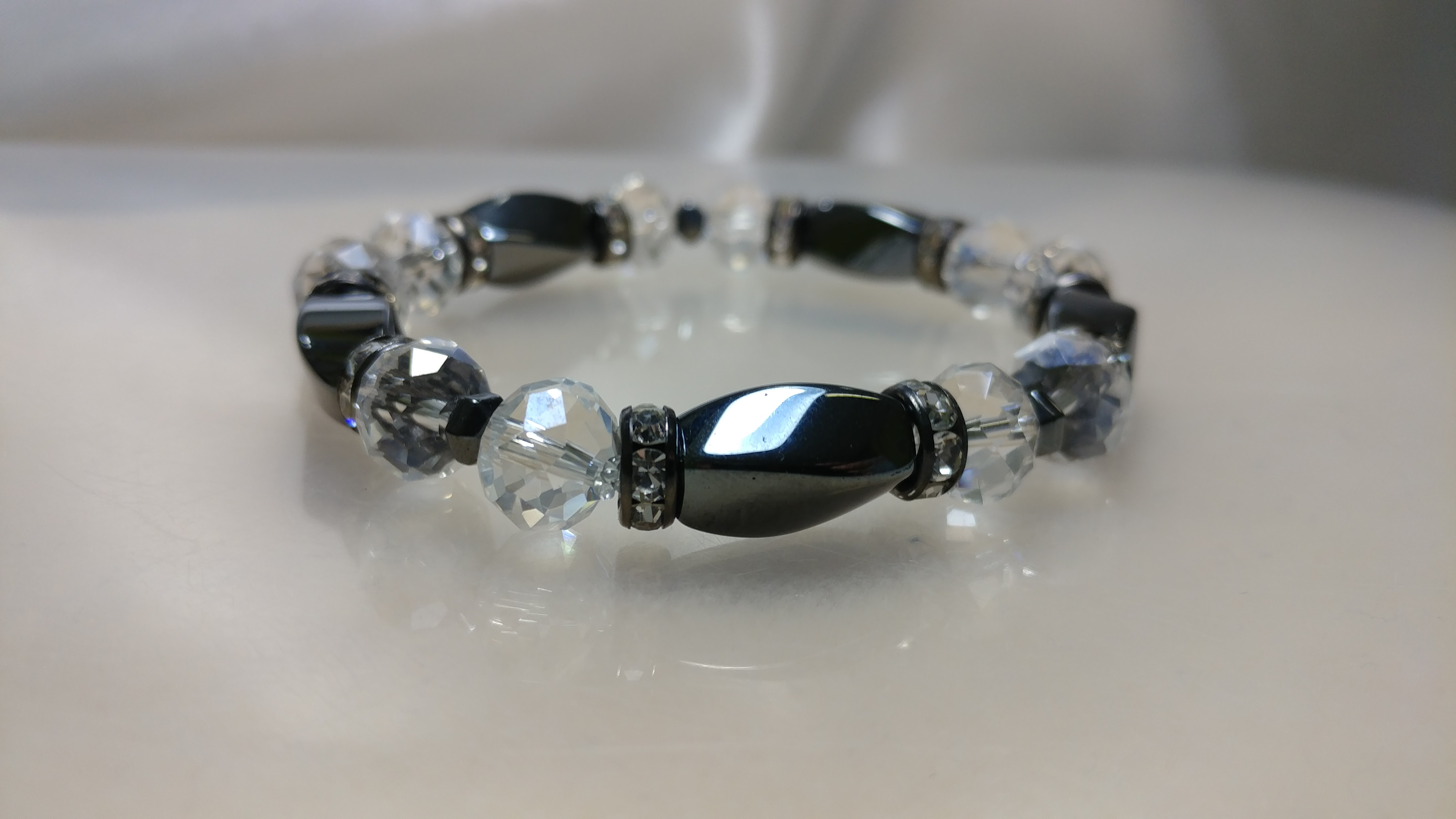 Handmade, with hematite beads, clear glass beads, rhinestone spacer beads on a clear stretchy cord.