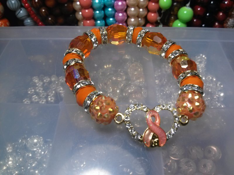 Made with orange crystal beaded with silver tone rhinestone spacers paired with a gold Orange ribbon charm connected on a stretchy string.